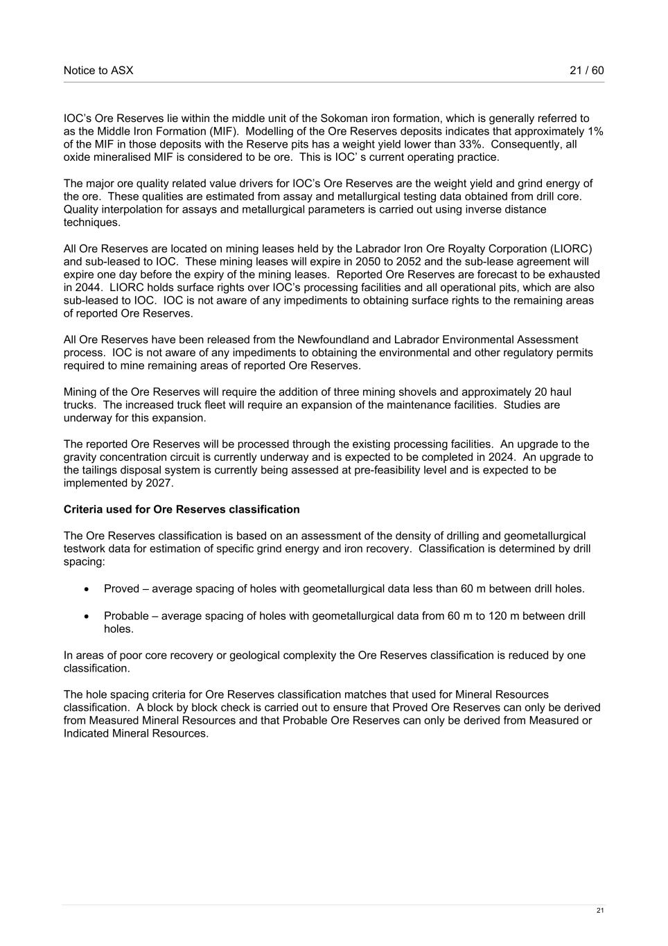 Notice to ASX 21 / 60 21 IOC’s Ore Reserves lie within the middle unit of the Sokoman iron formation, which is generally referred to as the Middle Iron Formation (MIF). Modelling of the Ore Reserves deposits indicates that approximately 1% of the MIF in those deposits with the Reserve pits has a weight yield lower than 33%. Consequently, all oxide mineralised MIF is considered to be ore. This is IOC’ s current operating practice. The major ore quality related value drivers for IOC’s Ore Reserves are the weight yield and grind energy of the ore. These qualities are estimated from assay and metallurgical testing data obtained from drill core. Quality interpolation for assays and metallurgical parameters is carried out using inverse distance techniques. All Ore Reserves are located on mining leases held by the Labrador Iron Ore Royalty Corporation (LIORC) and sub-leased to IOC. These mining leases will expire in 2050 to 2052 and the sub-lease agreement will expire one day before the expiry of the mining leases. Reported Ore Reserves are forecast to be exhausted in 2044. LIORC holds surface rights over IOC’s processing facilities and all operational pits, which are also sub-leased to IOC. IOC is not aware of any impediments to obtaining surface rights to the remaining areas of reported Ore Reserves. All Ore Reserves have been released from the Newfoundland and Labrador Environmental Assessment process. IOC is not aware of any impediments to obtaining the environmental and other regulatory permits required to mine remaining areas of reported Ore Reserves. Mining of the Ore Reserves will require the addition of three mining shovels and approximately 20 haul trucks. The increased truck fleet will require an expansion of the maintenance facilities. Studies are underway for this expansion. The reported Ore Reserves will be processed through the existing processing facilities. An upgrade to the gravity concentration circuit is currently underway and is expected to be completed in 2024. An upgrade to the tailings disposal system is currently being assessed at pre-feasibility level and is expected to be implemented by 2027. Criteria used for Ore Reserves classification The Ore Reserves classification is based on an assessment of the density of drilling and geometallurgical testwork data for estimation of specific grind energy and iron recovery. Classification is determined by drill spacing: • Proved – average spacing of holes with geometallurgical data less than 60 m between drill holes. • Probable – average spacing of holes with geometallurgical data from 60 m to 120 m between drill holes. In areas of poor core recovery or geological complexity the Ore Reserves classification is reduced by one classification. The hole spacing criteria for Ore Reserves classification matches that used for Mineral Resources classification. A block by block check is carried out to ensure that Proved Ore Reserves can only be derived from Measured Mineral Resources and that Probable Ore Reserves can only be derived from Measured or Indicated Mineral Resources.