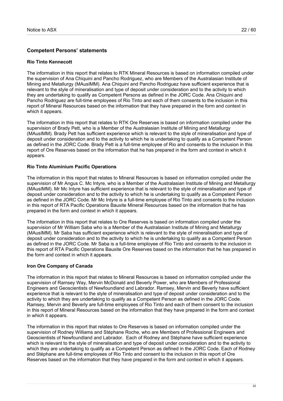 Notice to ASX 22 / 60 22 Competent Persons’ statements Rio Tinto Kennecott The information in this report that relates to RTK Mineral Resources is based on information compiled under the supervision of Ana Chiquini and Pancho Rodriguez, who are Members of the Australasian Institute of Mining and Metallurgy (MAusIMM). Ana Chiquini and Pancho Rodriguez have sufficient experience that is relevant to the style of mineralisation and type of deposit under consideration and to the activity to which they are undertaking to qualify as Competent Persons as defined in the JORC Code. Ana Chiquini and Pancho Rodriguez are full-time employees of Rio Tinto and each of them consents to the inclusion in this report of Mineral Resources based on the information that they have prepared in the form and context in which it appears. The information in this report that relates to RTK Ore Reserves is based on information compiled under the supervision of Brady Pett, who is a Member of the Australasian Institute of Mining and Metallurgy (MAusIMM). Brady Pett has sufficient experience which is relevant to the style of mineralisation and type of deposit under consideration and to the activity to which he is undertaking to qualify as a Competent Person as defined in the JORC Code. Brady Pett is a full-time employee of Rio and consents to the inclusion in this report of Ore Reserves based on the information that he has prepared in the form and context in which it appears. Rio Tinto Aluminium Pacific Operations The information in this report that relates to Mineral Resources is based on information compiled under the supervision of Mr Angus C. Mc Intyre, who is a Member of the Australasian Institute of Mining and Metallurgy (MAusIMM). Mr Mc Intyre has sufficient experience that is relevant to the style of mineralisation and type of deposit under consideration and to the activity to which he is undertaking to qualify as a Competent Person as defined in the JORC Code. Mr Mc Intyre is a full-time employee of Rio Tinto and consents to the inclusion in this report of RTA Pacific Operations Bauxite Mineral Resources based on the information that he has prepared in the form and context in which it appears. The information in this report that relates to Ore Reserves is based on information compiled under the supervision of Mr William Saba who is a Member of the Australasian Institute of Mining and Metallurgy (MAusIMM). Mr Saba has sufficient experience which is relevant to the style of mineralisation and type of deposit under consideration and to the activity to which he is undertaking to qualify as a Competent Person as defined in the JORC Code. Mr Saba is a full-time employee of Rio Tinto and consents to the inclusion in this report of RTA Pacific Operations Bauxite Ore Reserves based on the information that he has prepared in the form and context in which it appears. Iron Ore Company of Canada The information in this report that relates to Mineral Resources is based on information compiled under the supervision of Ramsey Way, Mervin McDonald and Beverly Power, who are Members of Professional Engineers and Geoscientists of Newfoundland and Labrador. Ramsey, Mervin and Beverly have sufficient experience that is relevant to the style of mineralisation and type of deposit under consideration and to the activity to which they are undertaking to qualify as a Competent Person as defined in the JORC Code. Ramsey, Mervin and Beverly are full-time employees of Rio Tinto and each of them consent to the inclusion in this report of Mineral Resources based on the information that they have prepared in the form and context in which it appears. The information in this report that relates to Ore Reserves is based on information compiled under the supervision of Rodney Williams and Stéphane Roche, who are Members of Professional Engineers and Geoscientists of Newfoundland and Labrador. Each of Rodney and Stéphane have sufficient experience which is relevant to the style of mineralisation and type of deposit under consideration and to the activity to which they are undertaking to qualify as a Competent Person as defined in the JORC Code. Each of Rodney and Stéphane are full-time employees of Rio Tinto and consent to the inclusion in this report of Ore Reserves based on the information that they have prepared in the form and context in which it appears.