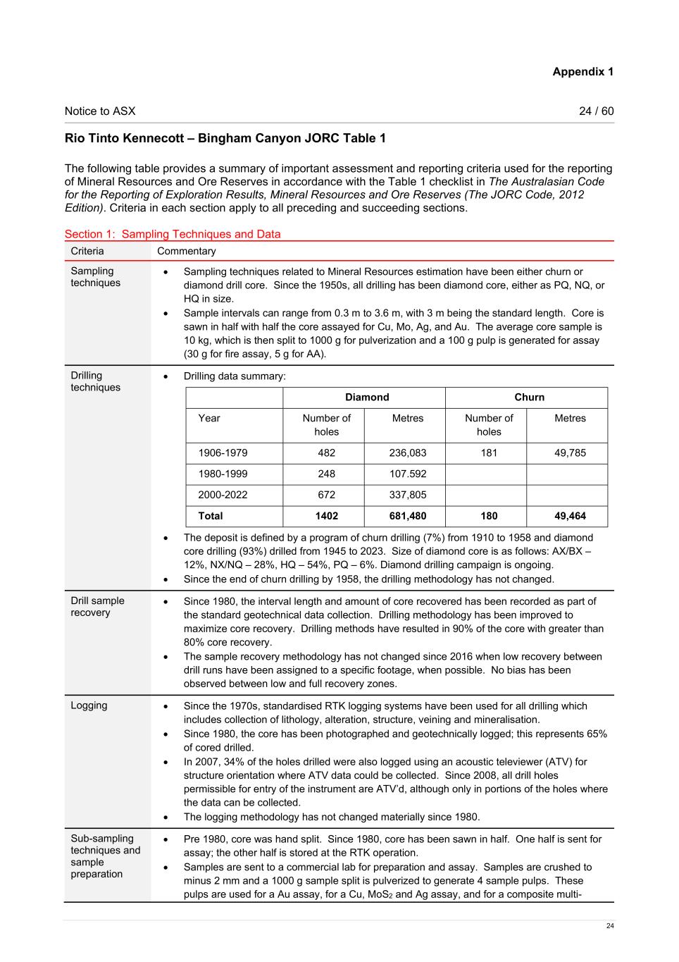 Appendix 1 Notice to ASX 24 / 60 24 Rio Tinto Kennecott – Bingham Canyon JORC Table 1 The following table provides a summary of important assessment and reporting criteria used for the reporting of Mineral Resources and Ore Reserves in accordance with the Table 1 checklist in The Australasian Code for the Reporting of Exploration Results, Mineral Resources and Ore Reserves (The JORC Code, 2012 Edition). Criteria in each section apply to all preceding and succeeding sections. Section 1: Sampling Techniques and Data Criteria Commentary Sampling techniques • Sampling techniques related to Mineral Resources estimation have been either churn or diamond drill core. Since the 1950s, all drilling has been diamond core, either as PQ, NQ, or HQ in size. • Sample intervals can range from 0.3 m to 3.6 m, with 3 m being the standard length. Core is sawn in half with half the core assayed for Cu, Mo, Ag, and Au. The average core sample is 10 kg, which is then split to 1000 g for pulverization and a 100 g pulp is generated for assay (30 g for fire assay, 5 g for AA). Drilling techniques • Drilling data summary: Diamond Churn Year Number of holes Metres Number of holes Metres 1906-1979 482 236,083 181 49,785 1980-1999 248 107.592 2000-2022 672 337,805 Total 1402 681,480 180 49,464 • The deposit is defined by a program of churn drilling (7%) from 1910 to 1958 and diamond core drilling (93%) drilled from 1945 to 2023. Size of diamond core is as follows: AX/BX – 12%, NX/NQ – 28%, HQ – 54%, PQ – 6%. Diamond drilling campaign is ongoing. • Since the end of churn drilling by 1958, the drilling methodology has not changed. Drill sample recovery • Since 1980, the interval length and amount of core recovered has been recorded as part of the standard geotechnical data collection. Drilling methodology has been improved to maximize core recovery. Drilling methods have resulted in 90% of the core with greater than 80% core recovery. • The sample recovery methodology has not changed since 2016 when low recovery between drill runs have been assigned to a specific footage, when possible. No bias has been observed between low and full recovery zones. Logging • Since the 1970s, standardised RTK logging systems have been used for all drilling which includes collection of lithology, alteration, structure, veining and mineralisation. • Since 1980, the core has been photographed and geotechnically logged; this represents 65% of cored drilled. • In 2007, 34% of the holes drilled were also logged using an acoustic televiewer (ATV) for structure orientation where ATV data could be collected. Since 2008, all drill holes permissible for entry of the instrument are ATV’d, although only in portions of the holes where the data can be collected. • The logging methodology has not changed materially since 1980. Sub-sampling techniques and sample preparation • Pre 1980, core was hand split. Since 1980, core has been sawn in half. One half is sent for assay; the other half is stored at the RTK operation. • Samples are sent to a commercial lab for preparation and assay. Samples are crushed to minus 2 mm and a 1000 g sample split is pulverized to generate 4 sample pulps. These pulps are used for a Au assay, for a Cu, MoS2 and Ag assay, and for a composite multi-