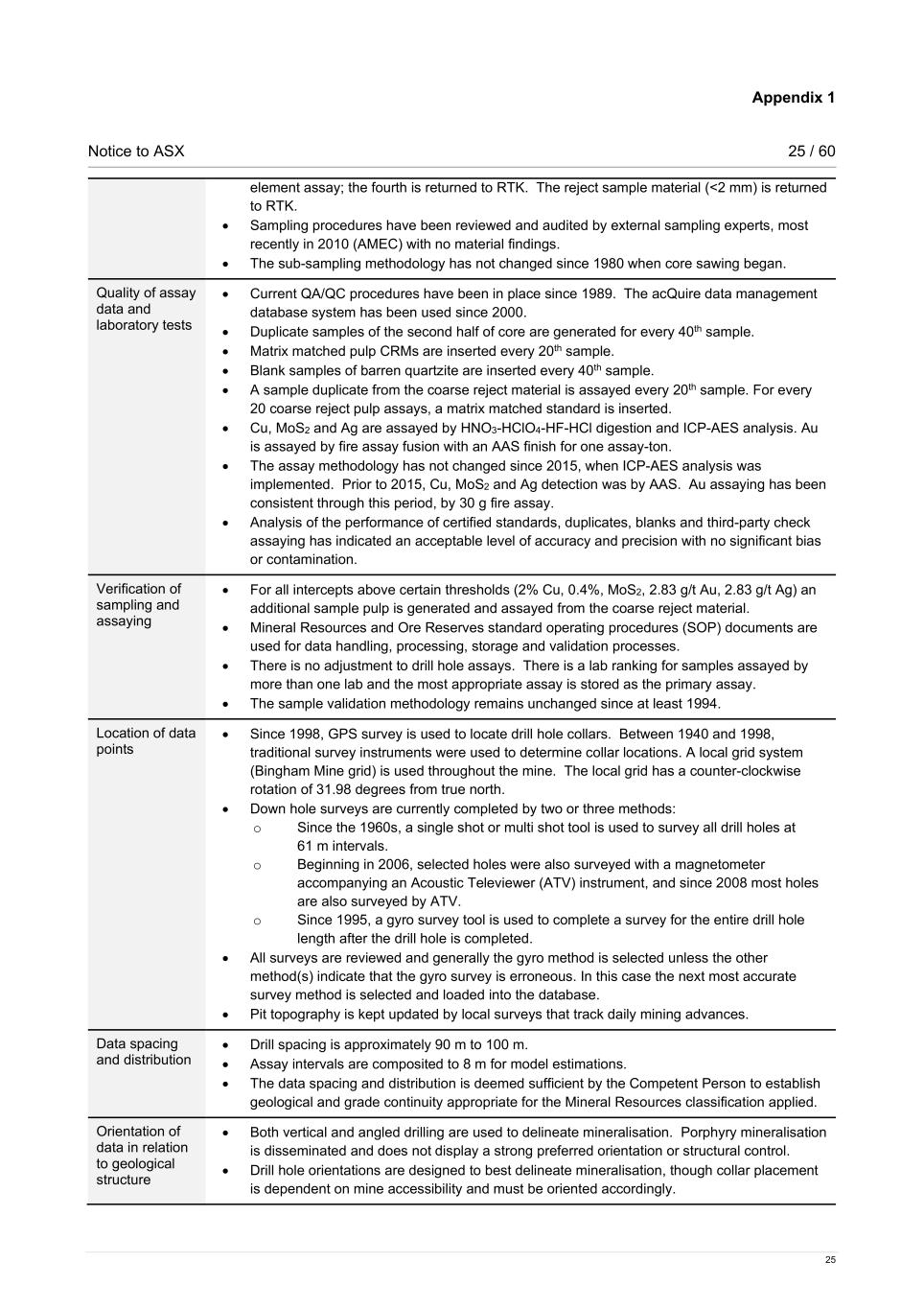 Appendix 1 Notice to ASX 25 / 60 25 element assay; the fourth is returned to RTK. The reject sample material (<2 mm) is returned to RTK. • Sampling procedures have been reviewed and audited by external sampling experts, most recently in 2010 (AMEC) with no material findings. • The sub-sampling methodology has not changed since 1980 when core sawing began. Quality of assay data and laboratory tests • Current QA/QC procedures have been in place since 1989. The acQuire data management database system has been used since 2000. • Duplicate samples of the second half of core are generated for every 40th sample. • Matrix matched pulp CRMs are inserted every 20th sample. • Blank samples of barren quartzite are inserted every 40th sample. • A sample duplicate from the coarse reject material is assayed every 20th sample. For every 20 coarse reject pulp assays, a matrix matched standard is inserted. • Cu, MoS2 and Ag are assayed by HNO3-HClO4-HF-HCl digestion and ICP-AES analysis. Au is assayed by fire assay fusion with an AAS finish for one assay-ton. • The assay methodology has not changed since 2015, when ICP-AES analysis was implemented. Prior to 2015, Cu, MoS2 and Ag detection was by AAS. Au assaying has been consistent through this period, by 30 g fire assay. • Analysis of the performance of certified standards, duplicates, blanks and third-party check assaying has indicated an acceptable level of accuracy and precision with no significant bias or contamination. Verification of sampling and assaying • For all intercepts above certain thresholds (2% Cu, 0.4%, MoS2, 2.83 g/t Au, 2.83 g/t Ag) an additional sample pulp is generated and assayed from the coarse reject material. • Mineral Resources and Ore Reserves standard operating procedures (SOP) documents are used for data handling, processing, storage and validation processes. • There is no adjustment to drill hole assays. There is a lab ranking for samples assayed by more than one lab and the most appropriate assay is stored as the primary assay. • The sample validation methodology remains unchanged since at least 1994. Location of data points • Since 1998, GPS survey is used to locate drill hole collars. Between 1940 and 1998, traditional survey instruments were used to determine collar locations. A local grid system (Bingham Mine grid) is used throughout the mine. The local grid has a counter-clockwise rotation of 31.98 degrees from true north. • Down hole surveys are currently completed by two or three methods: o Since the 1960s, a single shot or multi shot tool is used to survey all drill holes at 61 m intervals. o Beginning in 2006, selected holes were also surveyed with a magnetometer accompanying an Acoustic Televiewer (ATV) instrument, and since 2008 most holes are also surveyed by ATV. o Since 1995, a gyro survey tool is used to complete a survey for the entire drill hole length after the drill hole is completed. • All surveys are reviewed and generally the gyro method is selected unless the other method(s) indicate that the gyro survey is erroneous. In this case the next most accurate survey method is selected and loaded into the database. • Pit topography is kept updated by local surveys that track daily mining advances. Data spacing and distribution • Drill spacing is approximately 90 m to 100 m. • Assay intervals are composited to 8 m for model estimations. • The data spacing and distribution is deemed sufficient by the Competent Person to establish geological and grade continuity appropriate for the Mineral Resources classification applied. Orientation of data in relation to geological structure • Both vertical and angled drilling are used to delineate mineralisation. Porphyry mineralisation is disseminated and does not display a strong preferred orientation or structural control. • Drill hole orientations are designed to best delineate mineralisation, though collar placement is dependent on mine accessibility and must be oriented accordingly.