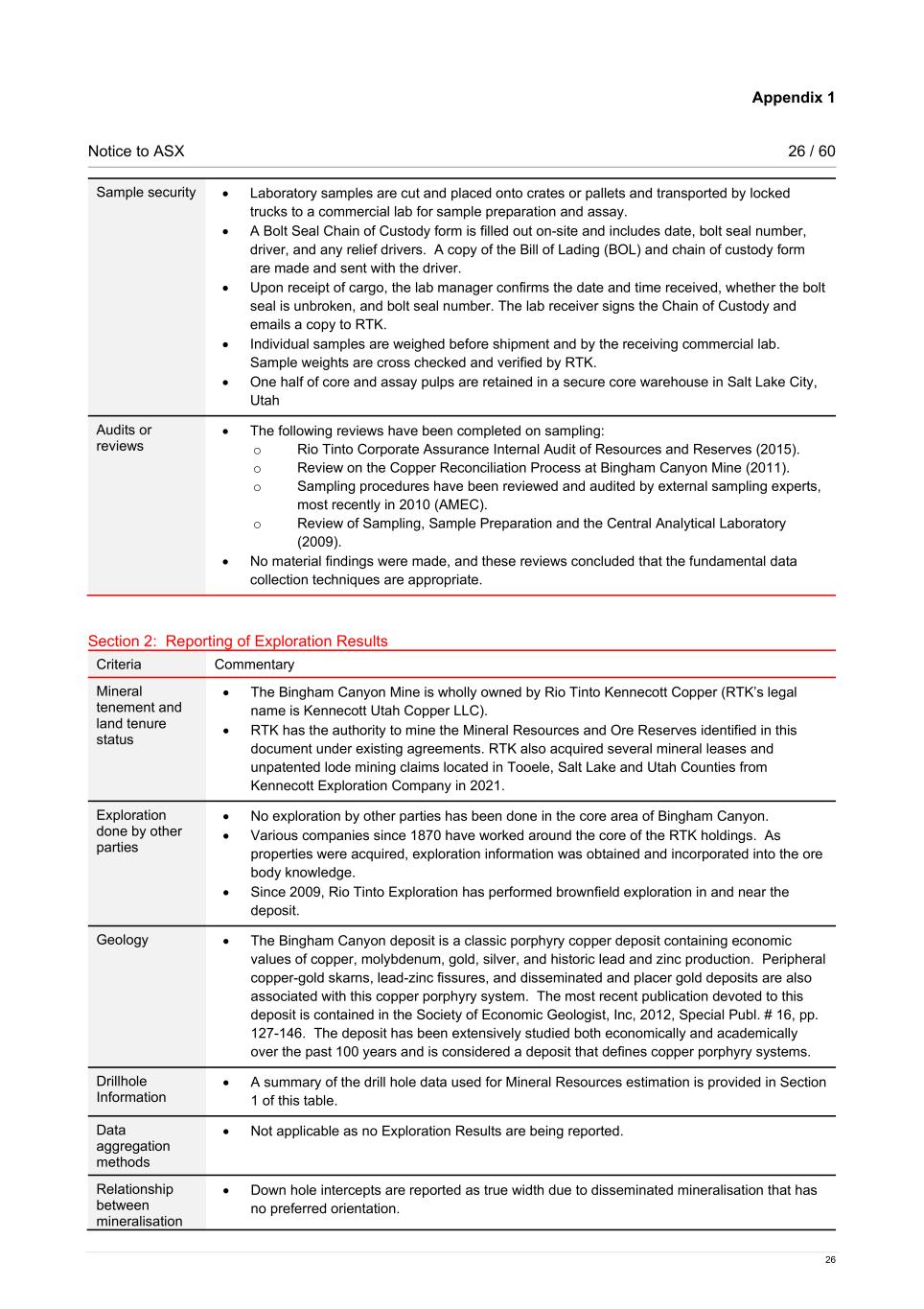 Appendix 1 Notice to ASX 26 / 60 26 Sample security • Laboratory samples are cut and placed onto crates or pallets and transported by locked trucks to a commercial lab for sample preparation and assay. • A Bolt Seal Chain of Custody form is filled out on-site and includes date, bolt seal number, driver, and any relief drivers. A copy of the Bill of Lading (BOL) and chain of custody form are made and sent with the driver. • Upon receipt of cargo, the lab manager confirms the date and time received, whether the bolt seal is unbroken, and bolt seal number. The lab receiver signs the Chain of Custody and emails a copy to RTK. • Individual samples are weighed before shipment and by the receiving commercial lab. Sample weights are cross checked and verified by RTK. • One half of core and assay pulps are retained in a secure core warehouse in Salt Lake City, Utah Audits or reviews • The following reviews have been completed on sampling: o Rio Tinto Corporate Assurance Internal Audit of Resources and Reserves (2015). o Review on the Copper Reconciliation Process at Bingham Canyon Mine (2011). o Sampling procedures have been reviewed and audited by external sampling experts, most recently in 2010 (AMEC). o Review of Sampling, Sample Preparation and the Central Analytical Laboratory (2009). • No material findings were made, and these reviews concluded that the fundamental data collection techniques are appropriate. Section 2: Reporting of Exploration Results Criteria Commentary Mineral tenement and land tenure status • The Bingham Canyon Mine is wholly owned by Rio Tinto Kennecott Copper (RTK’s legal name is Kennecott Utah Copper LLC). • RTK has the authority to mine the Mineral Resources and Ore Reserves identified in this document under existing agreements. RTK also acquired several mineral leases and unpatented lode mining claims located in Tooele, Salt Lake and Utah Counties from Kennecott Exploration Company in 2021. Exploration done by other parties • No exploration by other parties has been done in the core area of Bingham Canyon. • Various companies since 1870 have worked around the core of the RTK holdings. As properties were acquired, exploration information was obtained and incorporated into the ore body knowledge. • Since 2009, Rio Tinto Exploration has performed brownfield exploration in and near the deposit. Geology • The Bingham Canyon deposit is a classic porphyry copper deposit containing economic values of copper, molybdenum, gold, silver, and historic lead and zinc production. Peripheral copper-gold skarns, lead-zinc fissures, and disseminated and placer gold deposits are also associated with this copper porphyry system. The most recent publication devoted to this deposit is contained in the Society of Economic Geologist, Inc, 2012, Special Publ. # 16, pp. 127-146. The deposit has been extensively studied both economically and academically over the past 100 years and is considered a deposit that defines copper porphyry systems. Drillhole Information • A summary of the drill hole data used for Mineral Resources estimation is provided in Section 1 of this table. Data aggregation methods • Not applicable as no Exploration Results are being reported. Relationship between mineralisation • Down hole intercepts are reported as true width due to disseminated mineralisation that has no preferred orientation.