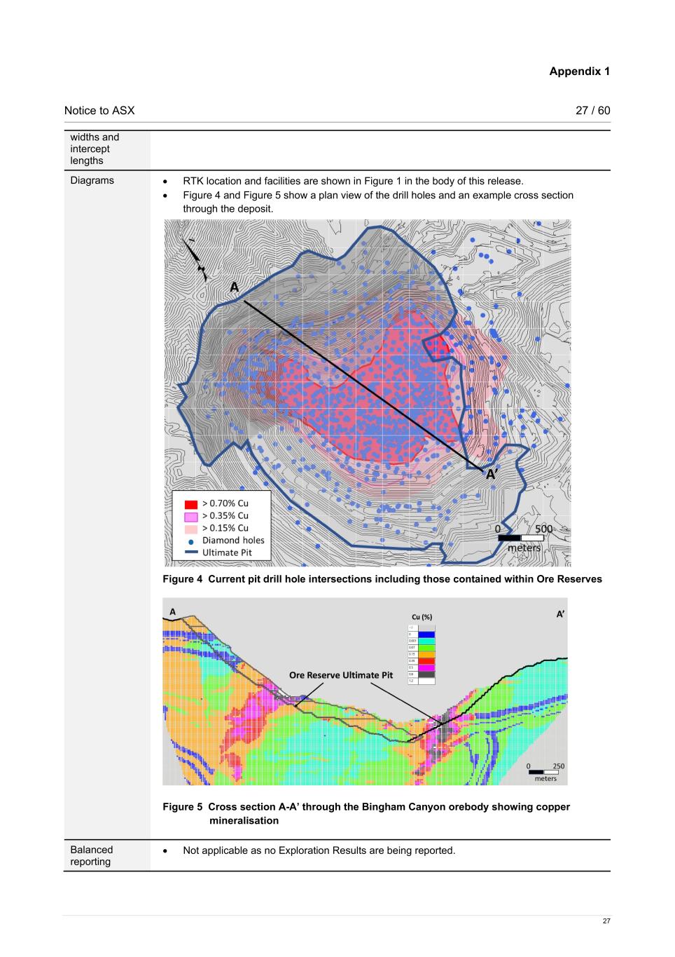Appendix 1 Notice to ASX 27 / 60 27 widths and intercept lengths Diagrams • RTK location and facilities are shown in Figure 1 in the body of this release. • Figure 4 and Figure 5 show a plan view of the drill holes and an example cross section through the deposit. Figure 4 Current pit drill hole intersections including those contained within Ore Reserves Figure 5 Cross section A-A’ through the Bingham Canyon orebody showing copper mineralisation Balanced reporting • Not applicable as no Exploration Results are being reported.