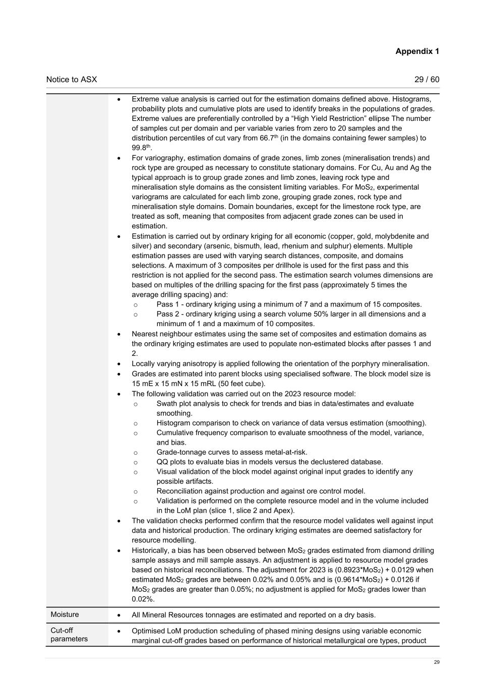 Appendix 1 Notice to ASX 29 / 60 29 • Extreme value analysis is carried out for the estimation domains defined above. Histograms, probability plots and cumulative plots are used to identify breaks in the populations of grades. Extreme values are preferentially controlled by a “High Yield Restriction” ellipse The number of samples cut per domain and per variable varies from zero to 20 samples and the distribution percentiles of cut vary from 66.7th (in the domains containing fewer samples) to 99.8th. • For variography, estimation domains of grade zones, limb zones (mineralisation trends) and rock type are grouped as necessary to constitute stationary domains. For Cu, Au and Ag the typical approach is to group grade zones and limb zones, leaving rock type and mineralisation style domains as the consistent limiting variables. For MoS2, experimental variograms are calculated for each limb zone, grouping grade zones, rock type and mineralisation style domains. Domain boundaries, except for the limestone rock type, are treated as soft, meaning that composites from adjacent grade zones can be used in estimation. • Estimation is carried out by ordinary kriging for all economic (copper, gold, molybdenite and silver) and secondary (arsenic, bismuth, lead, rhenium and sulphur) elements. Multiple estimation passes are used with varying search distances, composite, and domains selections. A maximum of 3 composites per drillhole is used for the first pass and this restriction is not applied for the second pass. The estimation search volumes dimensions are based on multiples of the drilling spacing for the first pass (approximately 5 times the average drilling spacing) and: o Pass 1 - ordinary kriging using a minimum of 7 and a maximum of 15 composites. o Pass 2 - ordinary kriging using a search volume 50% larger in all dimensions and a minimum of 1 and a maximum of 10 composites. • Nearest neighbour estimates using the same set of composites and estimation domains as the ordinary kriging estimates are used to populate non-estimated blocks after passes 1 and 2. • Locally varying anisotropy is applied following the orientation of the porphyry mineralisation. • Grades are estimated into parent blocks using specialised software. The block model size is 15 mE x 15 mN x 15 mRL (50 feet cube).  • The following validation was carried out on the 2023 resource model: o Swath plot analysis to check for trends and bias in data/estimates and evaluate smoothing. o Histogram comparison to check on variance of data versus estimation (smoothing). o Cumulative frequency comparison to evaluate smoothness of the model, variance, and bias. o Grade-tonnage curves to assess metal-at-risk. o QQ plots to evaluate bias in models versus the declustered database. o Visual validation of the block model against original input grades to identify any possible artifacts. o Reconciliation against production and against ore control model. o Validation is performed on the complete resource model and in the volume included in the LoM plan (slice 1, slice 2 and Apex). • The validation checks performed confirm that the resource model validates well against input data and historical production. The ordinary kriging estimates are deemed satisfactory for resource modelling. • Historically, a bias has been observed between MoS2 grades estimated from diamond drilling sample assays and mill sample assays. An adjustment is applied to resource model grades based on historical reconciliations. The adjustment for 2023 is (0.8923*MoS2) + 0.0129 when estimated MoS2 grades are between 0.02% and 0.05% and is (0.9614*MoS2) + 0.0126 if MoS2 grades are greater than 0.05%; no adjustment is applied for MoS2 grades lower than 0.02%. Moisture • All Mineral Resources tonnages are estimated and reported on a dry basis. Cut-off parameters • Optimised LoM production scheduling of phased mining designs using variable economic marginal cut-off grades based on performance of historical metallurgical ore types, product