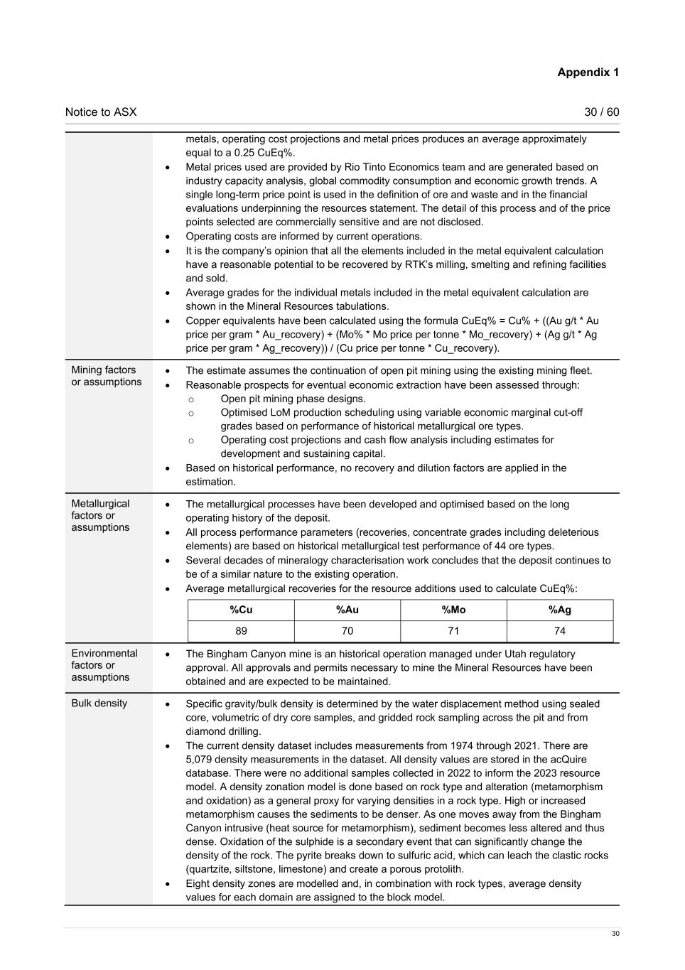 Appendix 1 Notice to ASX 30 / 60 30 metals, operating cost projections and metal prices produces an average approximately equal to a 0.25 CuEq%. • Metal prices used are provided by Rio Tinto Economics team and are generated based on industry capacity analysis, global commodity consumption and economic growth trends. A single long-term price point is used in the definition of ore and waste and in the financial evaluations underpinning the resources statement. The detail of this process and of the price points selected are commercially sensitive and are not disclosed. • Operating costs are informed by current operations. • It is the company’s opinion that all the elements included in the metal equivalent calculation have a reasonable potential to be recovered by RTK’s milling, smelting and refining facilities and sold. • Average grades for the individual metals included in the metal equivalent calculation are shown in the Mineral Resources tabulations. • Copper equivalents have been calculated using the formula CuEq% = Cu% + ((Au g/t * Au price per gram * Au_recovery) + (Mo% * Mo price per tonne * Mo_recovery) + (Ag g/t * Ag price per gram * Ag_recovery)) / (Cu price per tonne * Cu_recovery). Mining factors or assumptions • The estimate assumes the continuation of open pit mining using the existing mining fleet. • Reasonable prospects for eventual economic extraction have been assessed through: o Open pit mining phase designs. o Optimised LoM production scheduling using variable economic marginal cut-off grades based on performance of historical metallurgical ore types. o Operating cost projections and cash flow analysis including estimates for development and sustaining capital. • Based on historical performance, no recovery and dilution factors are applied in the estimation. Metallurgical factors or assumptions • The metallurgical processes have been developed and optimised based on the long operating history of the deposit. • All process performance parameters (recoveries, concentrate grades including deleterious elements) are based on historical metallurgical test performance of 44 ore types. • Several decades of mineralogy characterisation work concludes that the deposit continues to be of a similar nature to the existing operation. • Average metallurgical recoveries for the resource additions used to calculate CuEq%: %Cu %Au %Mo %Ag 89 70 71 74 Environmental factors or assumptions • The Bingham Canyon mine is an historical operation managed under Utah regulatory approval. All approvals and permits necessary to mine the Mineral Resources have been obtained and are expected to be maintained. Bulk density • Specific gravity/bulk density is determined by the water displacement method using sealed core, volumetric of dry core samples, and gridded rock sampling across the pit and from diamond drilling. • The current density dataset includes measurements from 1974 through 2021. There are 5,079 density measurements in the dataset. All density values are stored in the acQuire database. There were no additional samples collected in 2022 to inform the 2023 resource model. A density zonation model is done based on rock type and alteration (metamorphism and oxidation) as a general proxy for varying densities in a rock type. High or increased metamorphism causes the sediments to be denser. As one moves away from the Bingham Canyon intrusive (heat source for metamorphism), sediment becomes less altered and thus dense. Oxidation of the sulphide is a secondary event that can significantly change the density of the rock. The pyrite breaks down to sulfuric acid, which can leach the clastic rocks (quartzite, siltstone, limestone) and create a porous protolith. • Eight density zones are modelled and, in combination with rock types, average density values for each domain are assigned to the block model.