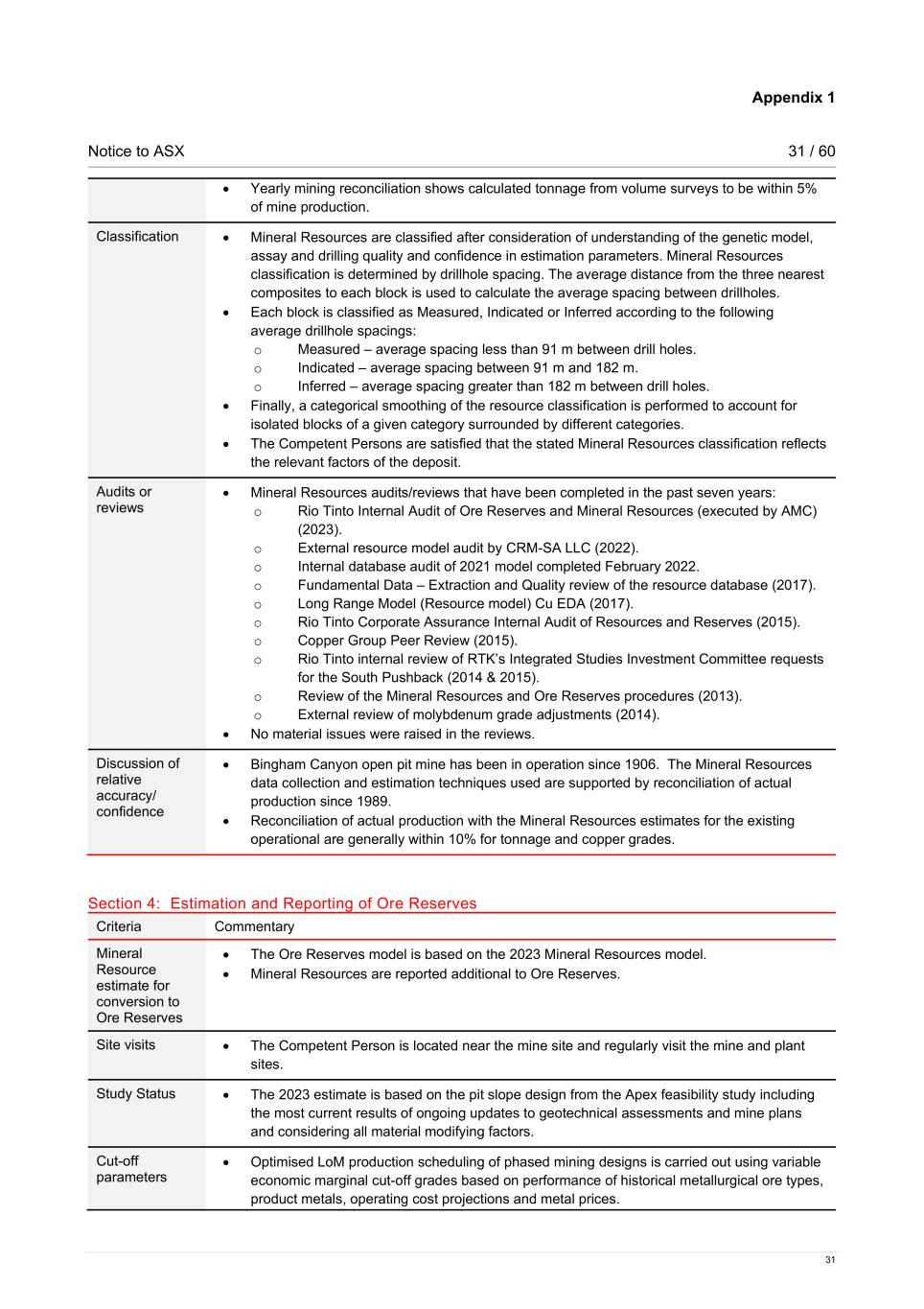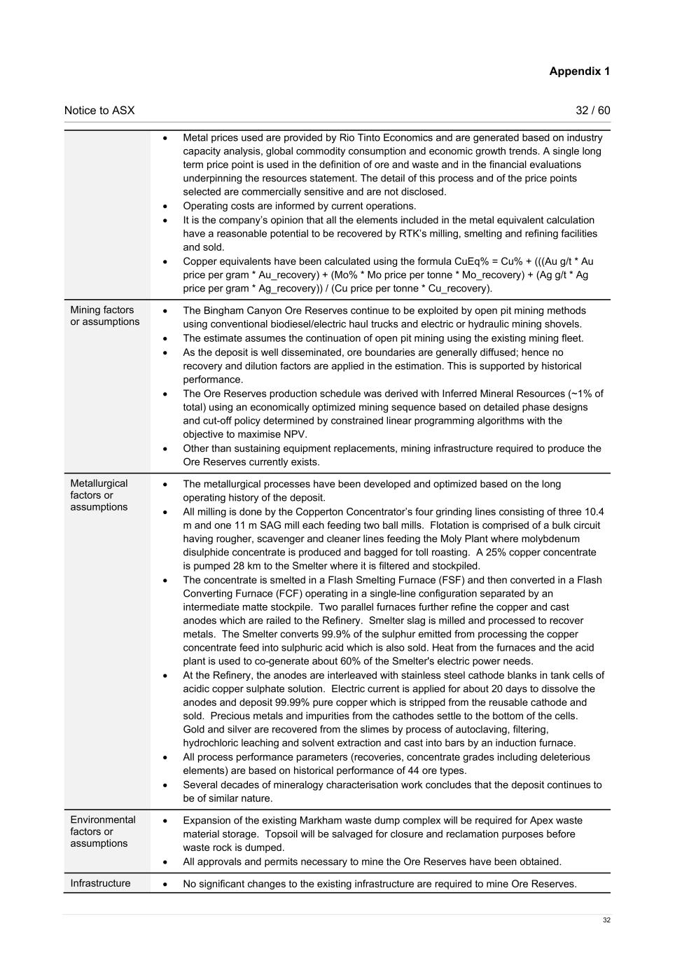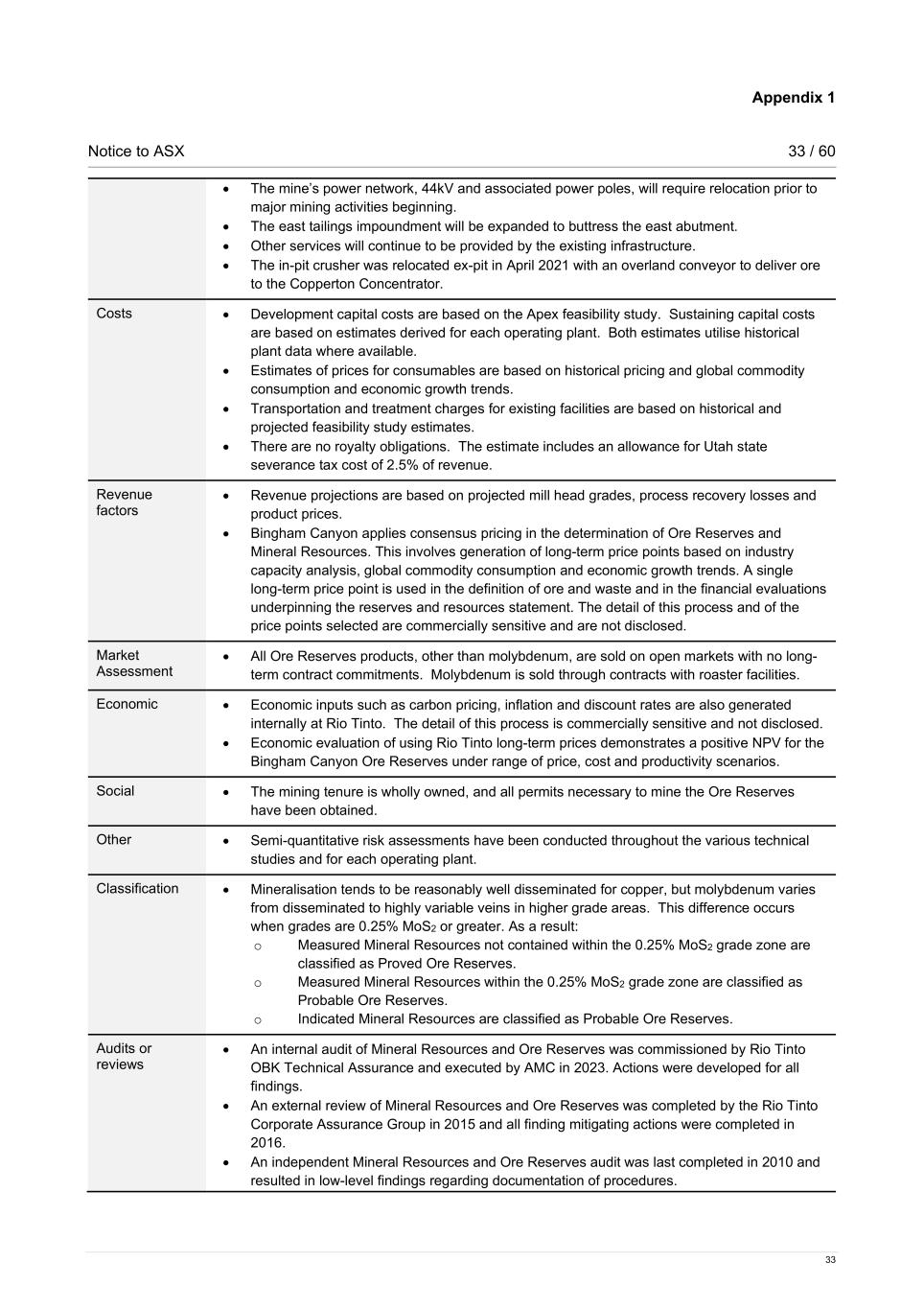 Appendix 1 Notice to ASX 33 / 60 33 • The mine’s power network, 44kV and associated power poles, will require relocation prior to major mining activities beginning. • The east tailings impoundment will be expanded to buttress the east abutment. • Other services will continue to be provided by the existing infrastructure. • The in-pit crusher was relocated ex-pit in April 2021 with an overland conveyor to deliver ore to the Copperton Concentrator. Costs • Development capital costs are based on the Apex feasibility study. Sustaining capital costs are based on estimates derived for each operating plant. Both estimates utilise historical plant data where available. • Estimates of prices for consumables are based on historical pricing and global commodity consumption and economic growth trends. • Transportation and treatment charges for existing facilities are based on historical and projected feasibility study estimates. • There are no royalty obligations. The estimate includes an allowance for Utah state severance tax cost of 2.5% of revenue. Revenue factors • Revenue projections are based on projected mill head grades, process recovery losses and product prices. • Bingham Canyon applies consensus pricing in the determination of Ore Reserves and Mineral Resources. This involves generation of long-term price points based on industry capacity analysis, global commodity consumption and economic growth trends. A single long-term price point is used in the definition of ore and waste and in the financial evaluations underpinning the reserves and resources statement. The detail of this process and of the price points selected are commercially sensitive and are not disclosed. Market Assessment • All Ore Reserves products, other than molybdenum, are sold on open markets with no long- term contract commitments. Molybdenum is sold through contracts with roaster facilities. Economic • Economic inputs such as carbon pricing, inflation and discount rates are also generated internally at Rio Tinto. The detail of this process is commercially sensitive and not disclosed. • Economic evaluation of using Rio Tinto long-term prices demonstrates a positive NPV for the Bingham Canyon Ore Reserves under range of price, cost and productivity scenarios. Social • The mining tenure is wholly owned, and all permits necessary to mine the Ore Reserves have been obtained. Other • Semi-quantitative risk assessments have been conducted throughout the various technical studies and for each operating plant. Classification • Mineralisation tends to be reasonably well disseminated for copper, but molybdenum varies from disseminated to highly variable veins in higher grade areas. This difference occurs when grades are 0.25% MoS2 or greater. As a result: o Measured Mineral Resources not contained within the 0.25% MoS2 grade zone are classified as Proved Ore Reserves. o Measured Mineral Resources within the 0.25% MoS2 grade zone are classified as Probable Ore Reserves. o Indicated Mineral Resources are classified as Probable Ore Reserves. Audits or reviews • An internal audit of Mineral Resources and Ore Reserves was commissioned by Rio Tinto OBK Technical Assurance and executed by AMC in 2023. Actions were developed for all findings. • An external review of Mineral Resources and Ore Reserves was completed by the Rio Tinto Corporate Assurance Group in 2015 and all finding mitigating actions were completed in 2016. • An independent Mineral Resources and Ore Reserves audit was last completed in 2010 and resulted in low-level findings regarding documentation of procedures.
