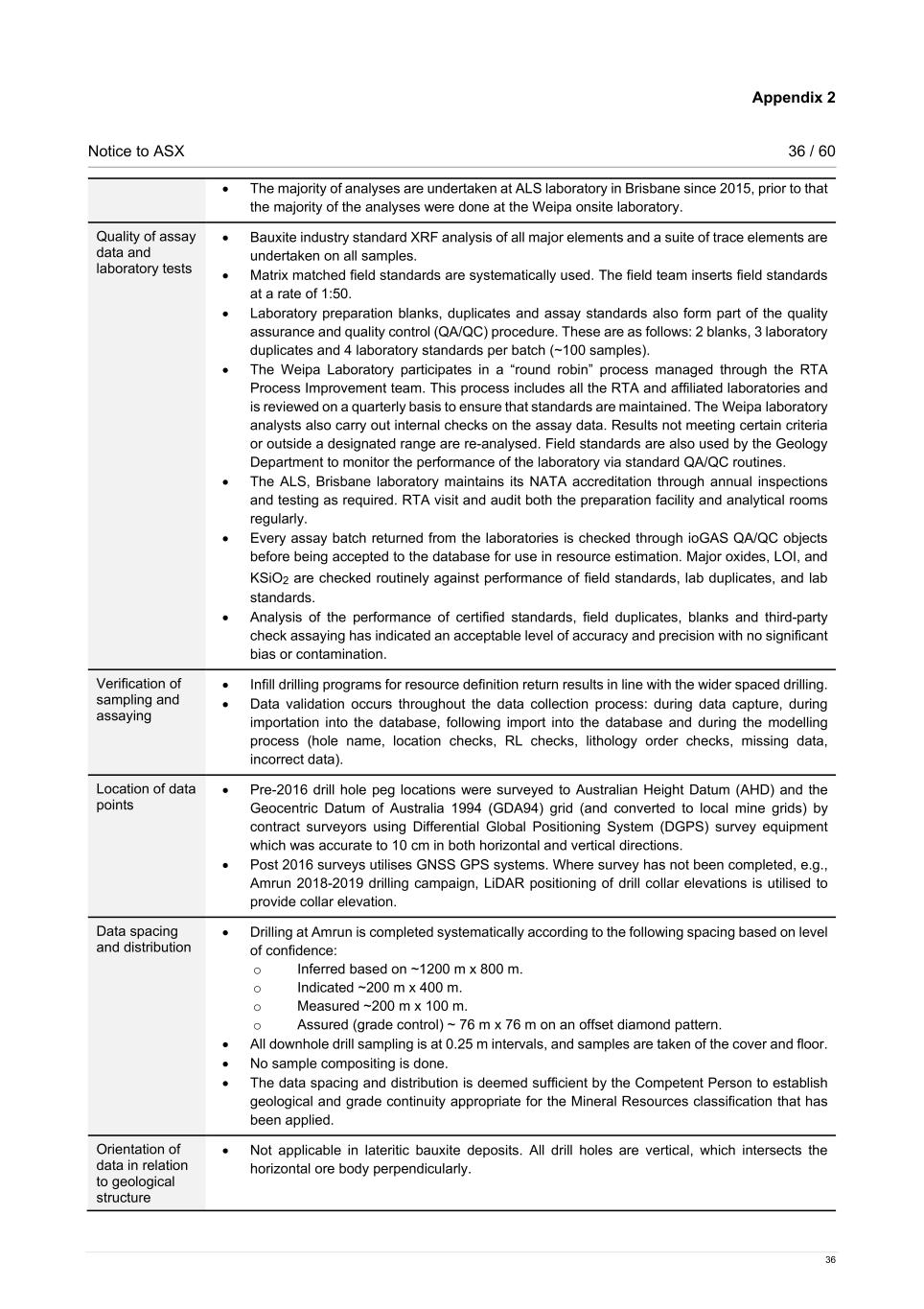 Appendix 2 Notice to ASX 36 / 60 36 • The majority of analyses are undertaken at ALS laboratory in Brisbane since 2015, prior to that the majority of the analyses were done at the Weipa onsite laboratory. Quality of assay data and laboratory tests • Bauxite industry standard XRF analysis of all major elements and a suite of trace elements are undertaken on all samples. • Matrix matched field standards are systematically used. The field team inserts field standards at a rate of 1:50. • Laboratory preparation blanks, duplicates and assay standards also form part of the quality assurance and quality control (QA/QC) procedure. These are as follows: 2 blanks, 3 laboratory duplicates and 4 laboratory standards per batch (~100 samples). • The Weipa Laboratory participates in a “round robin” process managed through the RTA Process Improvement team. This process includes all the RTA and affiliated laboratories and is reviewed on a quarterly basis to ensure that standards are maintained. The Weipa laboratory analysts also carry out internal checks on the assay data. Results not meeting certain criteria or outside a designated range are re-analysed. Field standards are also used by the Geology Department to monitor the performance of the laboratory via standard QA/QC routines. • The ALS, Brisbane laboratory maintains its NATA accreditation through annual inspections and testing as required. RTA visit and audit both the preparation facility and analytical rooms regularly. • Every assay batch returned from the laboratories is checked through ioGAS QA/QC objects before being accepted to the database for use in resource estimation. Major oxides, LOI, and KSiO2 are checked routinely against performance of field standards, lab duplicates, and lab standards. • Analysis of the performance of certified standards, field duplicates, blanks and third-party check assaying has indicated an acceptable level of accuracy and precision with no significant bias or contamination. Verification of sampling and assaying • Infill drilling programs for resource definition return results in line with the wider spaced drilling. • Data validation occurs throughout the data collection process: during data capture, during importation into the database, following import into the database and during the modelling process (hole name, location checks, RL checks, lithology order checks, missing data, incorrect data). Location of data points • Pre-2016 drill hole peg locations were surveyed to Australian Height Datum (AHD) and the Geocentric Datum of Australia 1994 (GDA94) grid (and converted to local mine grids) by contract surveyors using Differential Global Positioning System (DGPS) survey equipment which was accurate to 10 cm in both horizontal and vertical directions. • Post 2016 surveys utilises GNSS GPS systems. Where survey has not been completed, e.g., Amrun 2018-2019 drilling campaign, LiDAR positioning of drill collar elevations is utilised to provide collar elevation. Data spacing and distribution • Drilling at Amrun is completed systematically according to the following spacing based on level of confidence: o Inferred based on ~1200 m x 800 m. o Indicated ~200 m x 400 m. o Measured ~200 m x 100 m. o Assured (grade control) ~ 76 m x 76 m on an offset diamond pattern. • All downhole drill sampling is at 0.25 m intervals, and samples are taken of the cover and floor. • No sample compositing is done. • The data spacing and distribution is deemed sufficient by the Competent Person to establish geological and grade continuity appropriate for the Mineral Resources classification that has been applied. Orientation of data in relation to geological structure • Not applicable in lateritic bauxite deposits. All drill holes are vertical, which intersects the horizontal ore body perpendicularly.