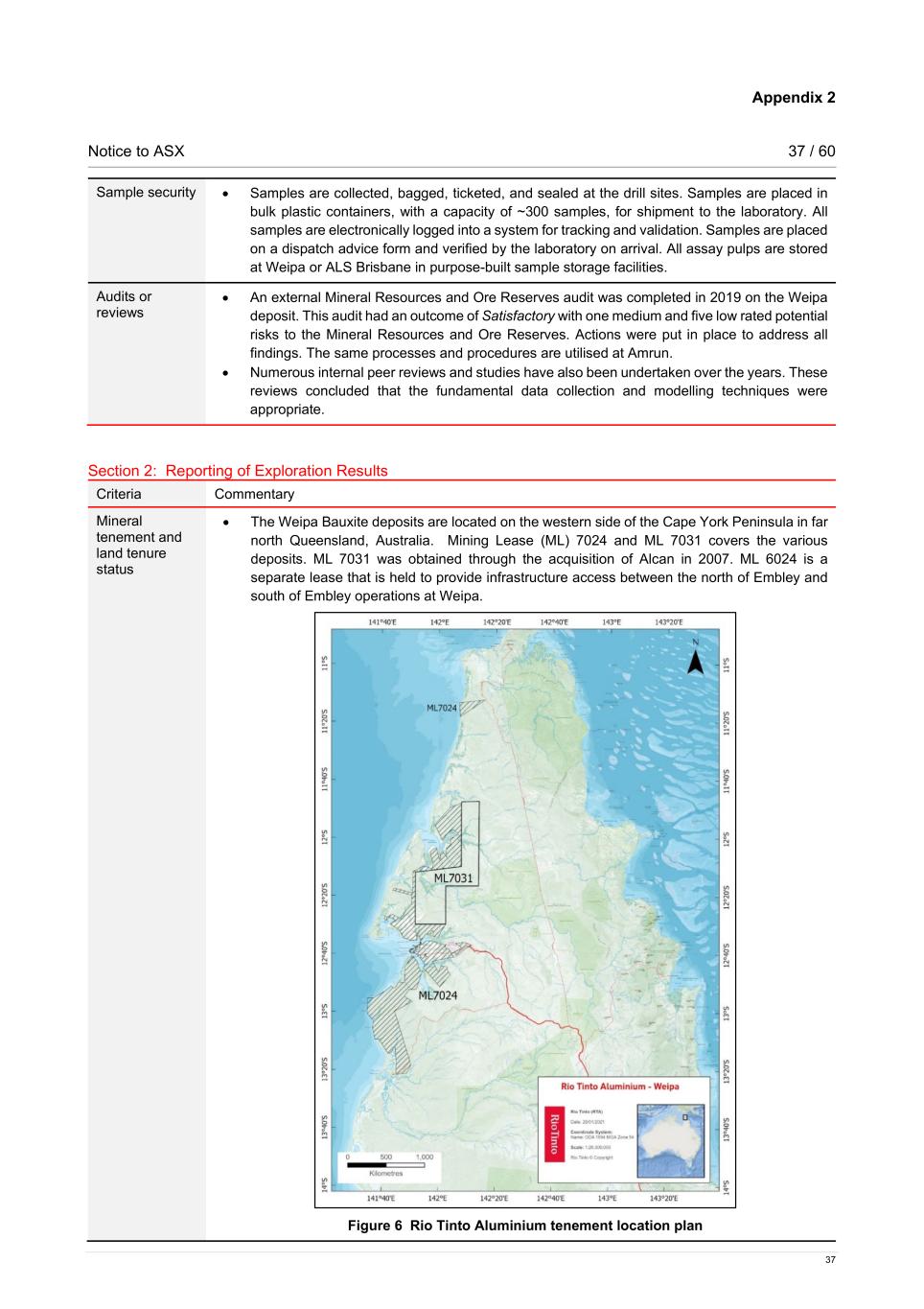 Appendix 2 Notice to ASX 37 / 60 37 Sample security • Samples are collected, bagged, ticketed, and sealed at the drill sites. Samples are placed in bulk plastic containers, with a capacity of ~300 samples, for shipment to the laboratory. All samples are electronically logged into a system for tracking and validation. Samples are placed on a dispatch advice form and verified by the laboratory on arrival. All assay pulps are stored at Weipa or ALS Brisbane in purpose-built sample storage facilities. Audits or reviews • An external Mineral Resources and Ore Reserves audit was completed in 2019 on the Weipa deposit. This audit had an outcome of Satisfactory with one medium and five low rated potential risks to the Mineral Resources and Ore Reserves. Actions were put in place to address all findings. The same processes and procedures are utilised at Amrun. • Numerous internal peer reviews and studies have also been undertaken over the years. These reviews concluded that the fundamental data collection and modelling techniques were appropriate. Section 2: Reporting of Exploration Results Criteria Commentary Mineral tenement and land tenure status • The Weipa Bauxite deposits are located on the western side of the Cape York Peninsula in far north Queensland, Australia. Mining Lease (ML) 7024 and ML 7031 covers the various deposits. ML 7031 was obtained through the acquisition of Alcan in 2007. ML 6024 is a separate lease that is held to provide infrastructure access between the north of Embley and south of Embley operations at Weipa. Figure 6 Rio Tinto Aluminium tenement location plan