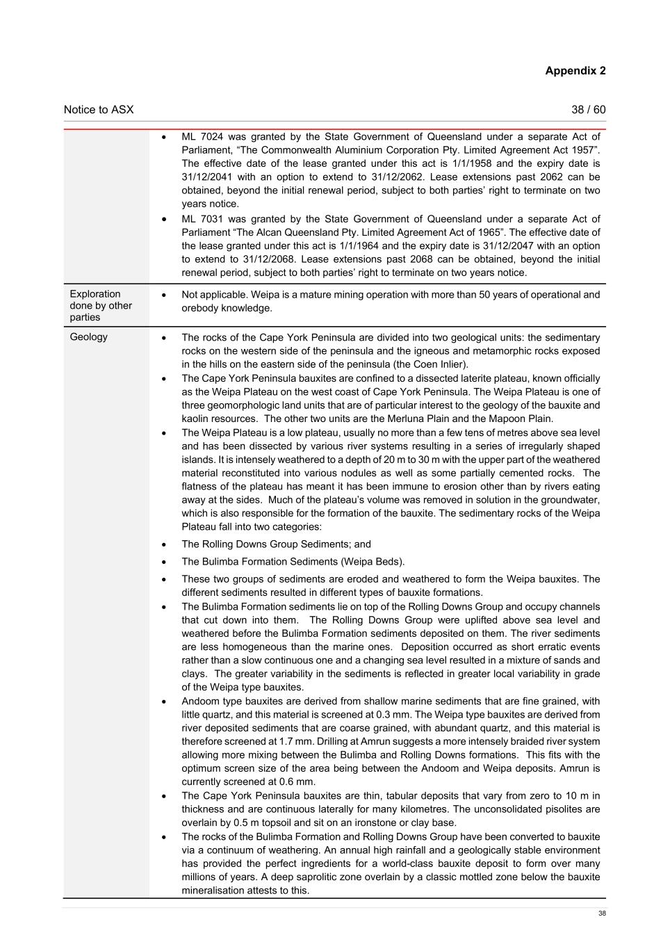 Appendix 2 Notice to ASX 38 / 60 38 • ML 7024 was granted by the State Government of Queensland under a separate Act of Parliament, “The Commonwealth Aluminium Corporation Pty. Limited Agreement Act 1957”. The effective date of the lease granted under this act is 1/1/1958 and the expiry date is 31/12/2041 with an option to extend to 31/12/2062. Lease extensions past 2062 can be obtained, beyond the initial renewal period, subject to both parties’ right to terminate on two years notice. • ML 7031 was granted by the State Government of Queensland under a separate Act of Parliament “The Alcan Queensland Pty. Limited Agreement Act of 1965”. The effective date of the lease granted under this act is 1/1/1964 and the expiry date is 31/12/2047 with an option to extend to 31/12/2068. Lease extensions past 2068 can be obtained, beyond the initial renewal period, subject to both parties’ right to terminate on two years notice. Exploration done by other parties • Not applicable. Weipa is a mature mining operation with more than 50 years of operational and orebody knowledge. Geology • The rocks of the Cape York Peninsula are divided into two geological units: the sedimentary rocks on the western side of the peninsula and the igneous and metamorphic rocks exposed in the hills on the eastern side of the peninsula (the Coen Inlier). • The Cape York Peninsula bauxites are confined to a dissected laterite plateau, known officially as the Weipa Plateau on the west coast of Cape York Peninsula. The Weipa Plateau is one of three geomorphologic land units that are of particular interest to the geology of the bauxite and kaolin resources. The other two units are the Merluna Plain and the Mapoon Plain. • The Weipa Plateau is a low plateau, usually no more than a few tens of metres above sea level and has been dissected by various river systems resulting in a series of irregularly shaped islands. It is intensely weathered to a depth of 20 m to 30 m with the upper part of the weathered material reconstituted into various nodules as well as some partially cemented rocks. The flatness of the plateau has meant it has been immune to erosion other than by rivers eating away at the sides. Much of the plateau’s volume was removed in solution in the groundwater, which is also responsible for the formation of the bauxite. The sedimentary rocks of the Weipa Plateau fall into two categories: • The Rolling Downs Group Sediments; and • The Bulimba Formation Sediments (Weipa Beds). • These two groups of sediments are eroded and weathered to form the Weipa bauxites. The different sediments resulted in different types of bauxite formations. • The Bulimba Formation sediments lie on top of the Rolling Downs Group and occupy channels that cut down into them. The Rolling Downs Group were uplifted above sea level and weathered before the Bulimba Formation sediments deposited on them. The river sediments are less homogeneous than the marine ones. Deposition occurred as short erratic events rather than a slow continuous one and a changing sea level resulted in a mixture of sands and clays. The greater variability in the sediments is reflected in greater local variability in grade of the Weipa type bauxites. • Andoom type bauxites are derived from shallow marine sediments that are fine grained, with little quartz, and this material is screened at 0.3 mm. The Weipa type bauxites are derived from river deposited sediments that are coarse grained, with abundant quartz, and this material is therefore screened at 1.7 mm. Drilling at Amrun suggests a more intensely braided river system allowing more mixing between the Bulimba and Rolling Downs formations. This fits with the optimum screen size of the area being between the Andoom and Weipa deposits. Amrun is currently screened at 0.6 mm. • The Cape York Peninsula bauxites are thin, tabular deposits that vary from zero to 10 m in thickness and are continuous laterally for many kilometres. The unconsolidated pisolites are overlain by 0.5 m topsoil and sit on an ironstone or clay base. • The rocks of the Bulimba Formation and Rolling Downs Group have been converted to bauxite via a continuum of weathering. An annual high rainfall and a geologically stable environment has provided the perfect ingredients for a world-class bauxite deposit to form over many millions of years. A deep saprolitic zone overlain by a classic mottled zone below the bauxite mineralisation attests to this.