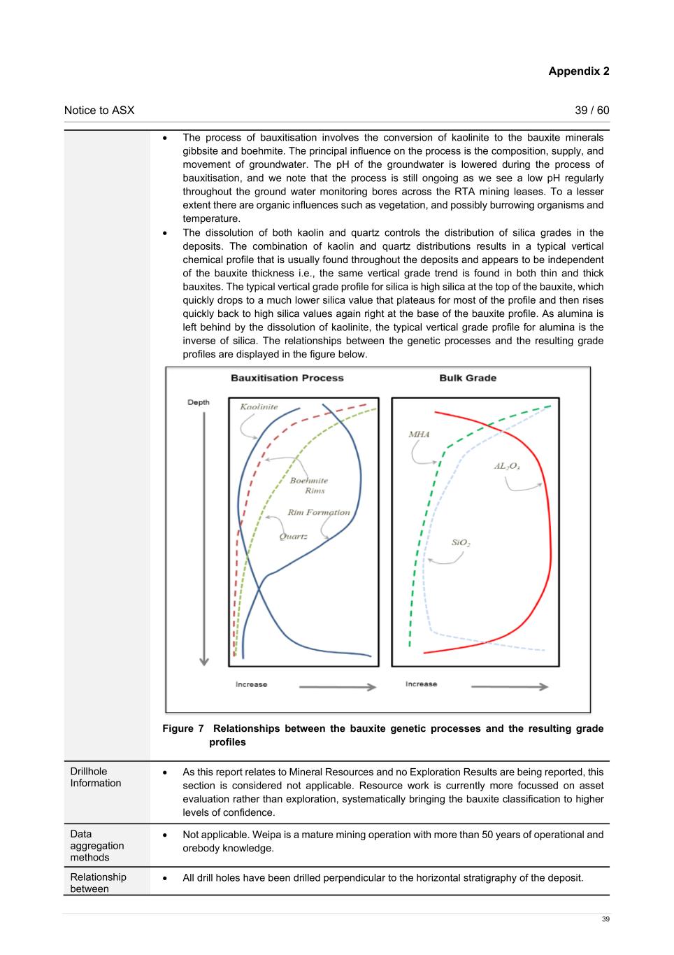 Appendix 2 Notice to ASX 39 / 60 39 • The process of bauxitisation involves the conversion of kaolinite to the bauxite minerals gibbsite and boehmite. The principal influence on the process is the composition, supply, and movement of groundwater. The pH of the groundwater is lowered during the process of bauxitisation, and we note that the process is still ongoing as we see a low pH regularly throughout the ground water monitoring bores across the RTA mining leases. To a lesser extent there are organic influences such as vegetation, and possibly burrowing organisms and temperature. • The dissolution of both kaolin and quartz controls the distribution of silica grades in the deposits. The combination of kaolin and quartz distributions results in a typical vertical chemical profile that is usually found throughout the deposits and appears to be independent of the bauxite thickness i.e., the same vertical grade trend is found in both thin and thick bauxites. The typical vertical grade profile for silica is high silica at the top of the bauxite, which quickly drops to a much lower silica value that plateaus for most of the profile and then rises quickly back to high silica values again right at the base of the bauxite profile. As alumina is left behind by the dissolution of kaolinite, the typical vertical grade profile for alumina is the inverse of silica. The relationships between the genetic processes and the resulting grade profiles are displayed in the figure below. Figure 7 Relationships between the bauxite genetic processes and the resulting grade profiles Drillhole Information • As this report relates to Mineral Resources and no Exploration Results are being reported, this section is considered not applicable. Resource work is currently more focussed on asset evaluation rather than exploration, systematically bringing the bauxite classification to higher levels of confidence. Data aggregation methods • Not applicable. Weipa is a mature mining operation with more than 50 years of operational and orebody knowledge. Relationship between • All drill holes have been drilled perpendicular to the horizontal stratigraphy of the deposit.