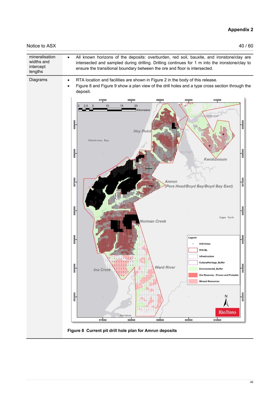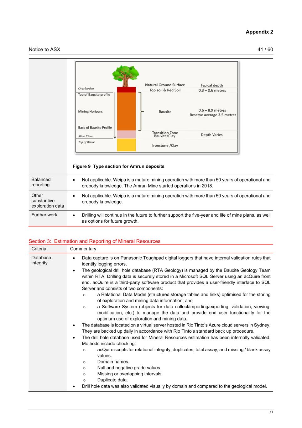 Appendix 2 Notice to ASX 41 / 60 41 Figure 9 Type section for Amrun deposits Balanced reporting • Not applicable. Weipa is a mature mining operation with more than 50 years of operational and orebody knowledge. The Amrun Mine started operations in 2018. Other substantive exploration data • Not applicable. Weipa is a mature mining operation with more than 50 years of operational and orebody knowledge. Further work • Drilling will continue in the future to further support the five-year and life of mine plans, as well as options for future growth. Section 3: Estimation and Reporting of Mineral Resources Criteria Commentary Database integrity • Data capture is on Panasonic Toughpad digital loggers that have internal validation rules that identify logging errors. • The geological drill hole database (RTA Geology) is managed by the Bauxite Geology Team within RTA. Drilling data is securely stored in a Microsoft SQL Server using an acQuire front end. acQuire is a third-party software product that provides a user-friendly interface to SQL Server and consists of two components: o a Relational Data Model (structured storage tables and links) optimised for the storing of exploration and mining data information; and o a Software System (objects for data collect/importing/exporting, validation, viewing, modification, etc.) to manage the data and provide end user functionality for the optimum use of exploration and mining data. • The database is located on a virtual server hosted in Rio Tinto’s Azure cloud servers in Sydney. They are backed up daily in accordance with Rio Tinto’s standard back up procedure. • The drill hole database used for Mineral Resources estimation has been internally validated. Methods include checking: o acQuire scripts for relational integrity, duplicates, total assay, and missing / blank assay values. o Domain names. o Null and negative grade values. o Missing or overlapping intervals. o Duplicate data. • Drill hole data was also validated visually by domain and compared to the geological model.