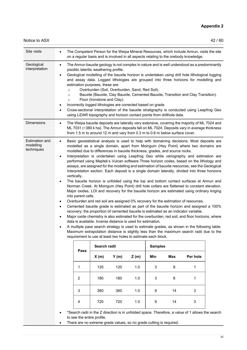 Appendix 2 Notice to ASX 42 / 60 42 Site visits • The Competent Person for the Weipa Mineral Resources, which include Amrun, visits the site on a regular basis and is involved in all aspects relating to the orebody knowledge. Geological interpretation • The Amrun bauxite geology is not complex in nature and is well understood as a predominantly pisolitic lateritic weathering profile. • Geological modelling of the bauxite horizon is undertaken using drill hole lithological logging and assay data. Logged lithologies are grouped into three horizons for modelling and estimation purposes, these are: o Overburden (Soil, Overburden, Sand, Red Soil). o Bauxite (Bauxite, Clay Bauxite, Cemented Bauxite, Transition and Clay Transition). o Floor (Ironstone and Clay). • Incorrectly logged lithologies are corrected based on grade. • Cross-sectional interpretation of the bauxite stratigraphy is conducted using Leapfrog Geo using LiDAR topography and horizon contact points from drillhole data. Dimensions • The Weipa bauxite deposits are laterally very extensive, covering the majority of ML 7024 and ML 7031 (~380 k ha). The Amrun deposits fall on ML 7024. Deposits vary in average thickness from 1.5 m to around 12 m and vary from 0.3 m to 0.6 m below surface cover. Estimation and modelling techniques • Basic geostatistical analysis is used to help with domaining decisions. Most deposits are modelled as a single domain, apart from Moingum (Hey Point) where two domains are modelled due to differences in bauxite thickness, grades, and source rocks. • Interpretation is undertaken using Leapfrog Geo while variography and estimation are performed using Maptek’s Vulcan software Three horizon codes, based on the lithology and assays, are assigned for the modelling and estimation of bauxite resources, see the Geological Interpretation section. Each deposit is a single domain laterally, divided into three horizons vertically. • The bauxite horizon is unfolded using the top and bottom contact surfaces at Amrun and Norman Creek. At Moingum (Hey Point) drill hole collars are flattened to constant elevation. Major oxides, LOI and recovery for the bauxite horizon are estimated using ordinary kriging into parent cells. • Overburden and red soil are assigned 0% recovery for the estimation of resources. • Cemented bauxite grade is estimated as part of the bauxite horizon and assigned a 100% recovery; the proportion of cemented bauxite is estimated as an indicator variable. • Major oxide chemistry is also estimated for the overburden, red soil, and floor horizons, where data is available. Inverse distance is used for estimation. • A multiple pass search strategy is used to estimate grades, as shown in the following table. Maximum extrapolation distance is slightly less than the maximum search radii due to the requirement to use at least two holes to estimate each block. Pass Search radii Samples X (m) Y (m) Z (m) Min Max Per hole 1 120 120 1.0 3 8 1 2 180 180 1.0 3 8 1 3 360 360 1.0 9 14 3 4 720 720 1.0 9 14 3 • *Search radii in the Z direction is in unfolded space. Therefore, a value of 1 allows the search to see the entire profile. • There are no extreme grade values, so no grade cutting is required.