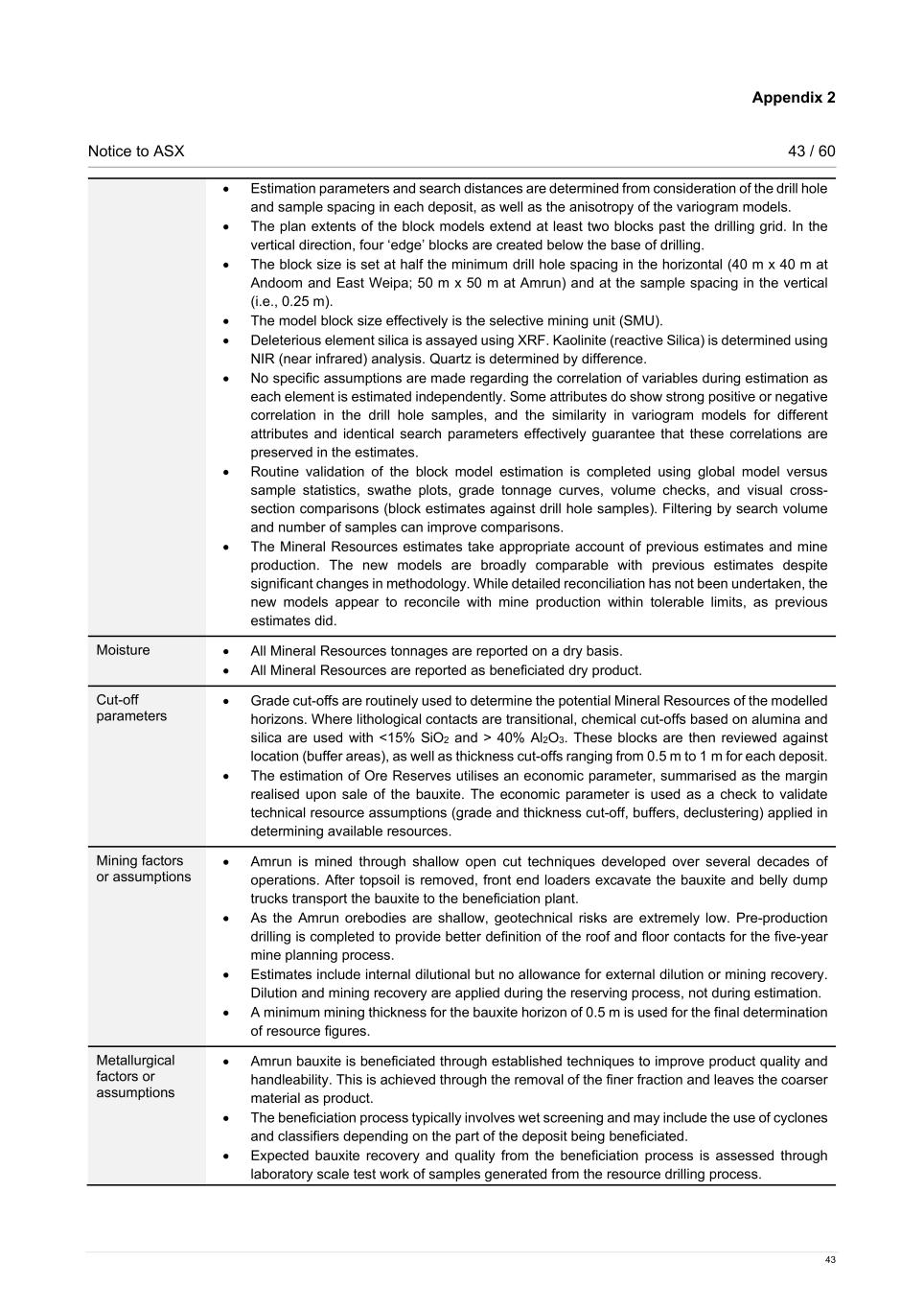 Notice to ASX 16 / 60 16 Cut-off grades, estimation methodology and modifying factors The Ore Reserves cut-off is based on an economic parameter, summarised as the margin realised upon sale of the bauxite. The economic cut-off approach considers revenue (bonus/penalty), fixed / operating / capital costs, royalties, and other third-party payments. Bauxite that satisfies this economic cut-off, is considered for inclusion in the Ore Reserves. There has been no material change to the economic cut-off methodology or process. Criteria used for Ore Reserves classification Given the level of confidence in the Ore Reserves modifying factors, Measured Resources are converted to both Proved and Probable Ore Reserves, and all Indicated Resources are converted to Probable Ore Reserves. Inferred Resources are not considered in the estimation of Ore Reserves.