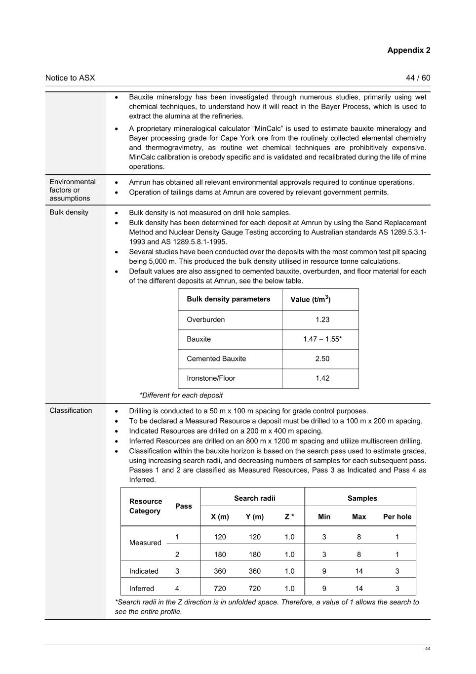Appendix 2 Notice to ASX 44 / 60 44 • Bauxite mineralogy has been investigated through numerous studies, primarily using wet chemical techniques, to understand how it will react in the Bayer Process, which is used to extract the alumina at the refineries. • A proprietary mineralogical calculator “MinCalc” is used to estimate bauxite mineralogy and Bayer processing grade for Cape York ore from the routinely collected elemental chemistry and thermogravimetry, as routine wet chemical techniques are prohibitively expensive. MinCalc calibration is orebody specific and is validated and recalibrated during the life of mine operations. Environmental factors or assumptions • Amrun has obtained all relevant environmental approvals required to continue operations. • Operation of tailings dams at Amrun are covered by relevant government permits. Bulk density • Bulk density is not measured on drill hole samples. • Bulk density has been determined for each deposit at Amrun by using the Sand Replacement Method and Nuclear Density Gauge Testing according to Australian standards AS 1289.5.3.1- 1993 and AS 1289.5.8.1-1995. • Several studies have been conducted over the deposits with the most common test pit spacing being 5,000 m. This produced the bulk density utilised in resource tonne calculations. • Default values are also assigned to cemented bauxite, overburden, and floor material for each of the different deposits at Amrun, see the below table. Bulk density parameters Value (t/m3) Overburden 1.23 Bauxite 1.47 – 1.55* Cemented Bauxite 2.50 Ironstone/Floor 1.42 *Different for each deposit Classification • Drilling is conducted to a 50 m x 100 m spacing for grade control purposes. • To be declared a Measured Resource a deposit must be drilled to a 100 m x 200 m spacing. • Indicated Resources are drilled on a 200 m x 400 m spacing. • Inferred Resources are drilled on an 800 m x 1200 m spacing and utilize multiscreen drilling. • Classification within the bauxite horizon is based on the search pass used to estimate grades, using increasing search radii, and decreasing numbers of samples for each subsequent pass. Passes 1 and 2 are classified as Measured Resources, Pass 3 as Indicated and Pass 4 as Inferred. Resource Category Pass Search radii Samples X (m) Y (m) Z * Min Max Per hole Measured 1 120 120 1.0 3 8 1 2 180 180 1.0 3 8 1 Indicated 3 360 360 1.0 9 14 3 Inferred 4 720 720 1.0 9 14 3 *Search radii in the Z direction is in unfolded space. Therefore, a value of 1 allows the search to see the entire profile.