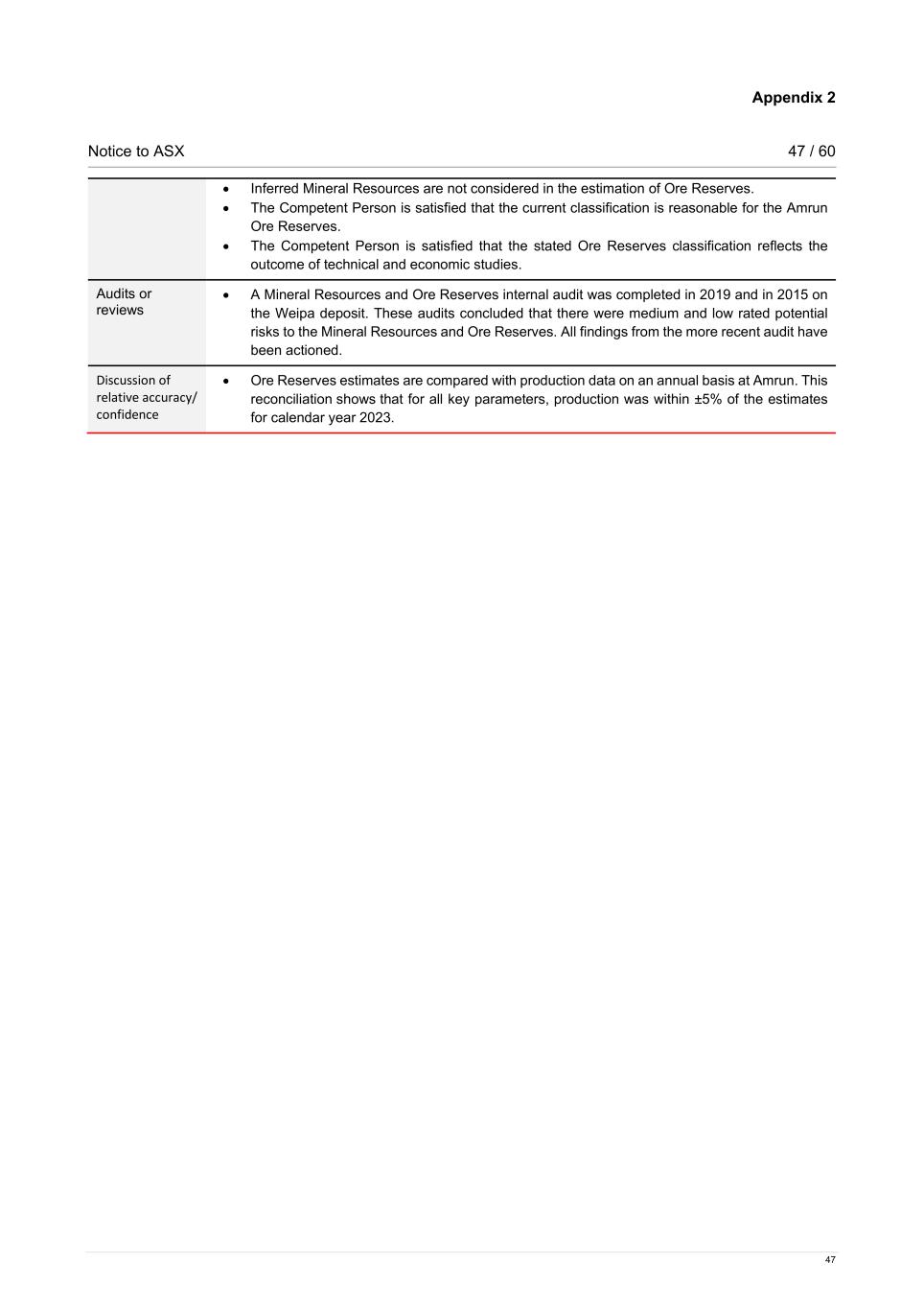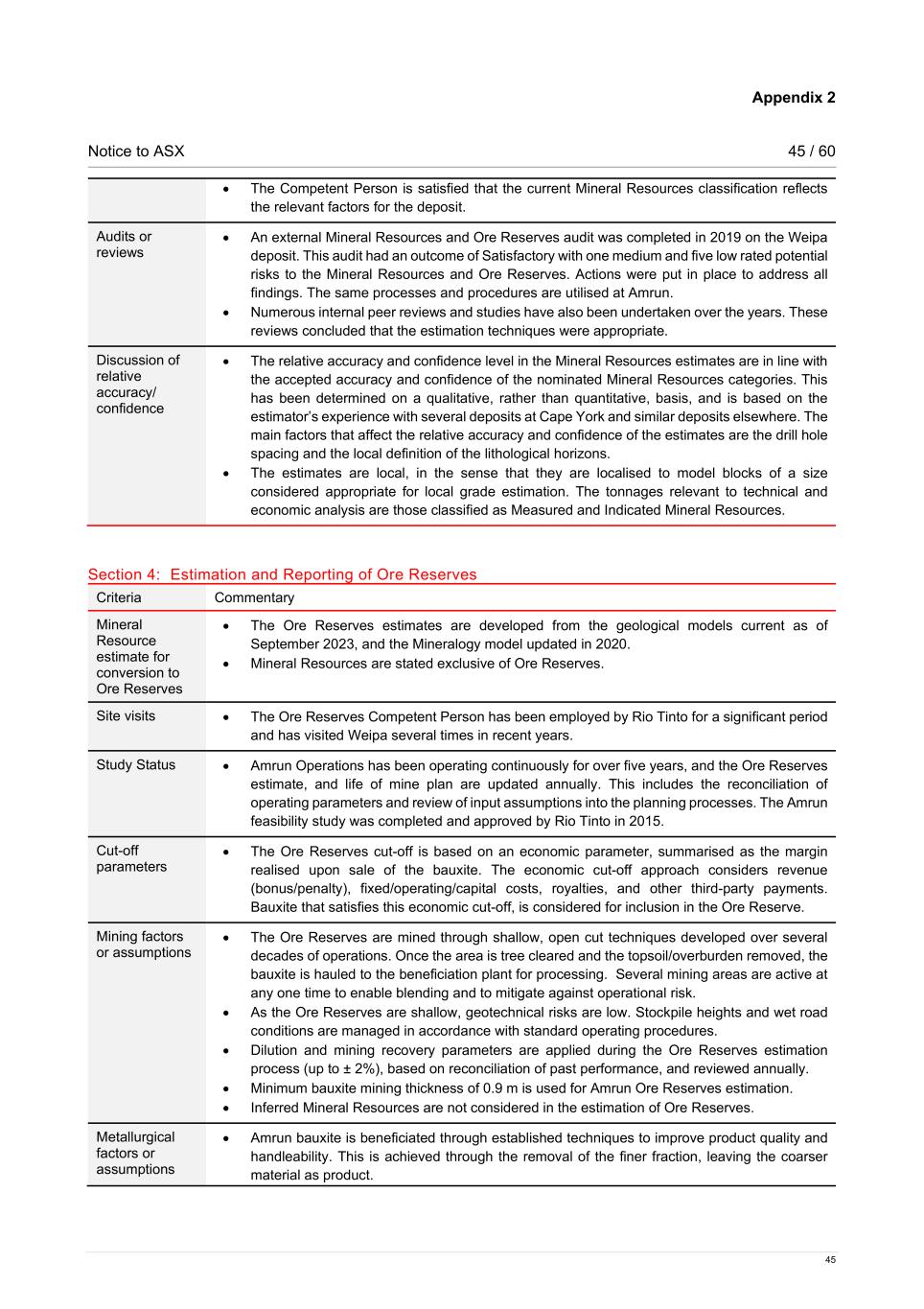 Appendix 2 Notice to ASX 47 / 60 47 • Inferred Mineral Resources are not considered in the estimation of Ore Reserves. • The Competent Person is satisfied that the current classification is reasonable for the Amrun Ore Reserves. • The Competent Person is satisfied that the stated Ore Reserves classification reflects the outcome of technical and economic studies. Audits or reviews • A Mineral Resources and Ore Reserves internal audit was completed in 2019 and in 2015 on the Weipa deposit. These audits concluded that there were medium and low rated potential risks to the Mineral Resources and Ore Reserves. All findings from the more recent audit have been actioned. Discussion of relative accuracy/ confidence • Ore Reserves estimates are compared with production data on an annual basis at Amrun. This reconciliation shows that for all key parameters, production was within ±5% of the estimates for calendar year 2023.