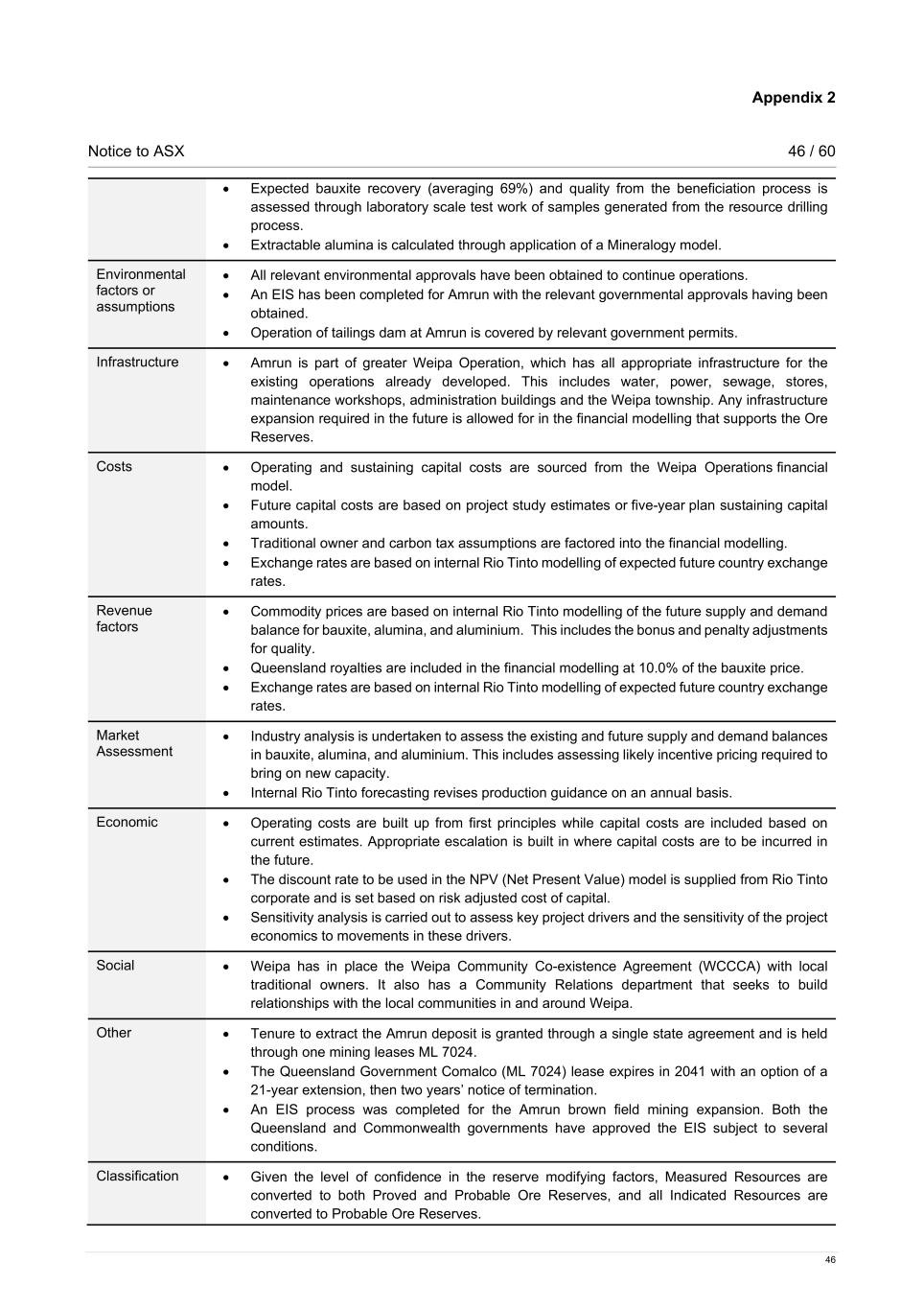 Appendix 2 Notice to ASX 46 / 60 46 • Expected bauxite recovery (averaging 69%) and quality from the beneficiation process is assessed through laboratory scale test work of samples generated from the resource drilling process. • Extractable alumina is calculated through application of a Mineralogy model. Environmental factors or assumptions • All relevant environmental approvals have been obtained to continue operations. • An EIS has been completed for Amrun with the relevant governmental approvals having been obtained. • Operation of tailings dam at Amrun is covered by relevant government permits. Infrastructure • Amrun is part of greater Weipa Operation, which has all appropriate infrastructure for the existing operations already developed. This includes water, power, sewage, stores, maintenance workshops, administration buildings and the Weipa township. Any infrastructure expansion required in the future is allowed for in the financial modelling that supports the Ore Reserves. Costs • Operating and sustaining capital costs are sourced from the Weipa Operations financial model. • Future capital costs are based on project study estimates or five-year plan sustaining capital amounts. • Traditional owner and carbon tax assumptions are factored into the financial modelling. • Exchange rates are based on internal Rio Tinto modelling of expected future country exchange rates. Revenue factors • Commodity prices are based on internal Rio Tinto modelling of the future supply and demand balance for bauxite, alumina, and aluminium. This includes the bonus and penalty adjustments for quality. • Queensland royalties are included in the financial modelling at 10.0% of the bauxite price. • Exchange rates are based on internal Rio Tinto modelling of expected future country exchange rates. Market Assessment • Industry analysis is undertaken to assess the existing and future supply and demand balances in bauxite, alumina, and aluminium. This includes assessing likely incentive pricing required to bring on new capacity. • Internal Rio Tinto forecasting revises production guidance on an annual basis. Economic • Operating costs are built up from first principles while capital costs are included based on current estimates. Appropriate escalation is built in where capital costs are to be incurred in the future. • The discount rate to be used in the NPV (Net Present Value) model is supplied from Rio Tinto corporate and is set based on risk adjusted cost of capital. • Sensitivity analysis is carried out to assess key project drivers and the sensitivity of the project economics to movements in these drivers. Social • Weipa has in place the Weipa Community Co-existence Agreement (WCCCA) with local traditional owners. It also has a Community Relations department that seeks to build relationships with the local communities in and around Weipa. Other • Tenure to extract the Amrun deposit is granted through a single state agreement and is held through one mining leases ML 7024. • The Queensland Government Comalco (ML 7024) lease expires in 2041 with an option of a 21-year extension, then two years’ notice of termination. • An EIS process was completed for the Amrun brown field mining expansion. Both the Queensland and Commonwealth governments have approved the EIS subject to several conditions. Classification • Given the level of confidence in the reserve modifying factors, Measured Resources are converted to both Proved and Probable Ore Reserves, and all Indicated Resources are converted to Probable Ore Reserves.