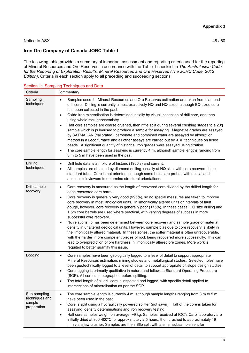Appendix 3 Notice to ASX 48 / 60 48 Iron Ore Company of Canada JORC Table 1 The following table provides a summary of important assessment and reporting criteria used for the reporting of Mineral Resources and Ore Reserves in accordance with the Table 1 checklist in The Australasian Code for the Reporting of Exploration Results, Mineral Resources and Ore Reserves (The JORC Code, 2012 Edition). Criteria in each section apply to all preceding and succeeding sections. Section 1: Sampling Techniques and Data Criteria Commentary Sampling techniques • Samples used for Mineral Resources and Ore Reserves estimation are taken from diamond drill core. Drilling is currently almost exclusively NQ and HQ sized, although BQ sized core has been collected in the past. • Oxide iron mineralisation is determined initially by visual inspection of drill core, and then using whole rock geochemistry. • Half core samples are coarse crushed, then riffle split during several crushing stages to a 20g sample which is pulverised to produce a sample for assaying. Magnetite grades are assayed by SATMAGAN (calibrated), carbonate and combined water are assayed by absorption method in a Leco furnace and all other assays are carried out by XRF techniques on fused beads. A significant quantity of historical iron grades were assayed using titration. • The core sample length for assaying is currently 4 m, although sample lengths ranging from 3 m to 5 m have been used in the past. Drilling techniques • Drill hole data is a mixture of historic (1960’s) and current. • All samples are obtained by diamond drilling, usually at NQ size, with core recovered in a standard tube. Core is not oriented, although some holes are probed with optical and acoustic televiewers to determine structural orientations. Drill sample recovery • Core recovery is measured as the length of recovered core divided by the drilled length for each recovered core barrel. • Core recovery is generally very good (>95%), so no special measures are taken to improve core recovery in most lithological units. In limonitically altered units or intervals of fault gouge, however, core recovery is generally poor (<75%). In these cases, HQ size drilling and 1.5m core barrels are used where practical, with varying degrees of success in more successful core recovery. • No relationship has been determined between core recovery and sample grade or material density in unaltered geological units. However, sample bias due to core recovery is likely in the limonitically altered material. In these zones, the softer material is often unrecoverable, with the harder, more competent pieces of rock being recovered more successfully. This can lead to overprediction of ore hardness in limonitically altered ore zones. More work is requited to better quantify this issue. Logging • Core samples have been geologically logged to a level of detail to support appropriate Mineral Resources estimation, mining studies and metallurgical studies. Selected holes have been geotechnically logged to a level of detail to support appropriate pit slope design studies. • Core logging is primarily qualitative in nature and follows a Standard Operating Procedure (SOP). All core is photographed before splitting. • The total length of all drill core is inspected and logged, with specific detail applied to intersections of mineralisation as per the SOP. Sub-sampling techniques and sample preparation • The core sample length is currently 4 m, although sample lengths ranging from 3 m to 5 m have been used in the past. • Core is split using a hydraulically powered splitter (not sawn). Half of the core is taken for assaying, density determinations and iron recovery testing. • Half core samples weigh, on average, ~9 kg. Samples received at IOC’s Carol laboratory are initially dried at 300-400°C for approximately 2.5 hours, then crushed to approximately 19 mm via a jaw crusher. Samples are then riffle split with a small subsample sent for