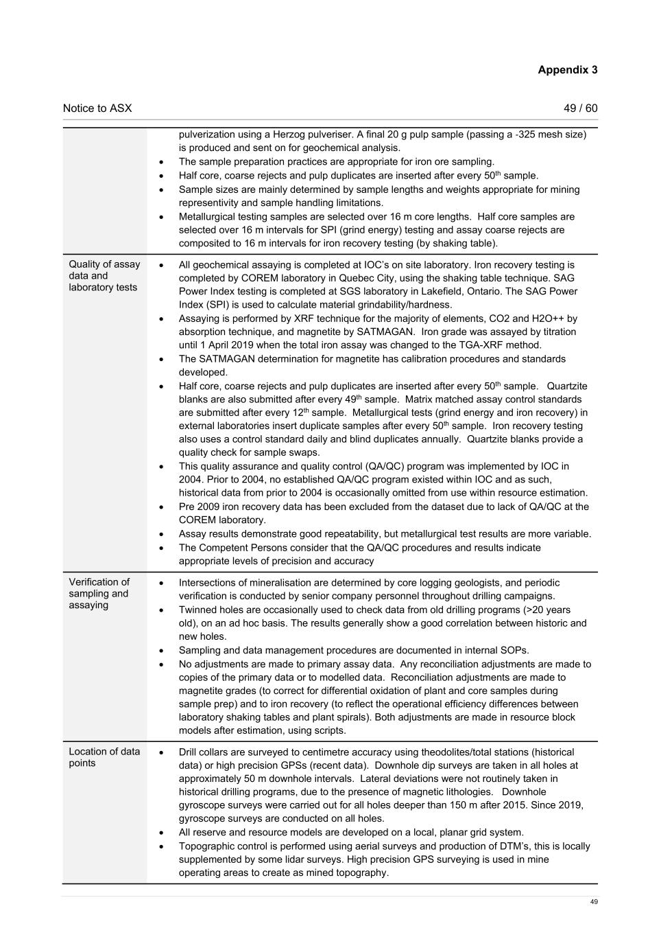 Appendix 3 Notice to ASX 49 / 60 49 pulverization using a Herzog pulveriser. A final 20 g pulp sample (passing a ‑325 mesh size) is produced and sent on for geochemical analysis. • The sample preparation practices are appropriate for iron ore sampling. • Half core, coarse rejects and pulp duplicates are inserted after every 50th sample. • Sample sizes are mainly determined by sample lengths and weights appropriate for mining representivity and sample handling limitations. • Metallurgical testing samples are selected over 16 m core lengths. Half core samples are selected over 16 m intervals for SPI (grind energy) testing and assay coarse rejects are composited to 16 m intervals for iron recovery testing (by shaking table). Quality of assay data and laboratory tests • All geochemical assaying is completed at IOC’s on site laboratory. Iron recovery testing is completed by COREM laboratory in Quebec City, using the shaking table technique. SAG Power Index testing is completed at SGS laboratory in Lakefield, Ontario. The SAG Power Index (SPI) is used to calculate material grindability/hardness. • Assaying is performed by XRF technique for the majority of elements, CO2 and H2O++ by absorption technique, and magnetite by SATMAGAN. Iron grade was assayed by titration until 1 April 2019 when the total iron assay was changed to the TGA-XRF method. • The SATMAGAN determination for magnetite has calibration procedures and standards developed. • Half core, coarse rejects and pulp duplicates are inserted after every 50th sample. Quartzite blanks are also submitted after every 49th sample. Matrix matched assay control standards are submitted after every 12th sample. Metallurgical tests (grind energy and iron recovery) in external laboratories insert duplicate samples after every 50th sample. Iron recovery testing also uses a control standard daily and blind duplicates annually. Quartzite blanks provide a quality check for sample swaps. • This quality assurance and quality control (QA/QC) program was implemented by IOC in 2004. Prior to 2004, no established QA/QC program existed within IOC and as such, historical data from prior to 2004 is occasionally omitted from use within resource estimation. • Pre 2009 iron recovery data has been excluded from the dataset due to lack of QA/QC at the COREM laboratory. • Assay results demonstrate good repeatability, but metallurgical test results are more variable. • The Competent Persons consider that the QA/QC procedures and results indicate appropriate levels of precision and accuracy Verification of sampling and assaying • Intersections of mineralisation are determined by core logging geologists, and periodic verification is conducted by senior company personnel throughout drilling campaigns. • Twinned holes are occasionally used to check data from old drilling programs (>20 years old), on an ad hoc basis. The results generally show a good correlation between historic and new holes. • Sampling and data management procedures are documented in internal SOPs. • No adjustments are made to primary assay data. Any reconciliation adjustments are made to copies of the primary data or to modelled data. Reconciliation adjustments are made to magnetite grades (to correct for differential oxidation of plant and core samples during sample prep) and to iron recovery (to reflect the operational efficiency differences between laboratory shaking tables and plant spirals). Both adjustments are made in resource block models after estimation, using scripts. Location of data points • Drill collars are surveyed to centimetre accuracy using theodolites/total stations (historical data) or high precision GPSs (recent data). Downhole dip surveys are taken in all holes at approximately 50 m downhole intervals. Lateral deviations were not routinely taken in historical drilling programs, due to the presence of magnetic lithologies. Downhole gyroscope surveys were carried out for all holes deeper than 150 m after 2015. Since 2019, gyroscope surveys are conducted on all holes. • All reserve and resource models are developed on a local, planar grid system. • Topographic control is performed using aerial surveys and production of DTM’s, this is locally supplemented by some lidar surveys. High precision GPS surveying is used in mine operating areas to create as mined topography.