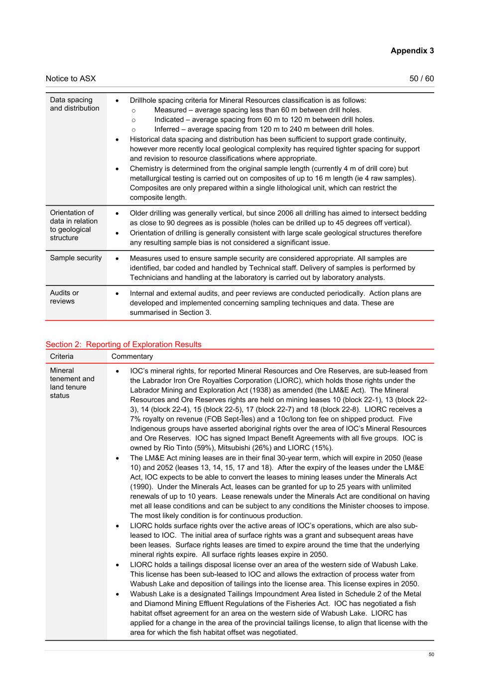 Appendix 3 Notice to ASX 50 / 60 50 Data spacing and distribution • Drillhole spacing criteria for Mineral Resources classification is as follows: o Measured – average spacing less than 60 m between drill holes. o Indicated – average spacing from 60 m to 120 m between drill holes. o Inferred – average spacing from 120 m to 240 m between drill holes. • Historical data spacing and distribution has been sufficient to support grade continuity, however more recently local geological complexity has required tighter spacing for support and revision to resource classifications where appropriate. • Chemistry is determined from the original sample length (currently 4 m of drill core) but metallurgical testing is carried out on composites of up to 16 m length (ie 4 raw samples). Composites are only prepared within a single lithological unit, which can restrict the composite length. Orientation of data in relation to geological structure • Older drilling was generally vertical, but since 2006 all drilling has aimed to intersect bedding as close to 90 degrees as is possible (holes can be drilled up to 45 degrees off vertical). • Orientation of drilling is generally consistent with large scale geological structures therefore any resulting sample bias is not considered a significant issue. Sample security • Measures used to ensure sample security are considered appropriate. All samples are identified, bar coded and handled by Technical staff. Delivery of samples is performed by Technicians and handling at the laboratory is carried out by laboratory analysts. Audits or reviews • Internal and external audits, and peer reviews are conducted periodically. Action plans are developed and implemented concerning sampling techniques and data. These are summarised in Section 3. Section 2: Reporting of Exploration Results Criteria Commentary Mineral tenement and land tenure status • IOC’s mineral rights, for reported Mineral Resources and Ore Reserves, are sub-leased from the Labrador Iron Ore Royalties Corporation (LIORC), which holds those rights under the Labrador Mining and Exploration Act (1938) as amended (the LM&E Act). The Mineral Resources and Ore Reserves rights are held on mining leases 10 (block 22-1), 13 (block 22- 3), 14 (block 22-4), 15 (block 22-5), 17 (block 22-7) and 18 (block 22-8). LIORC receives a 7% royalty on revenue (FOB Sept-Îles) and a 10c/long ton fee on shipped product. Five Indigenous groups have asserted aboriginal rights over the area of IOC’s Mineral Resources and Ore Reserves. IOC has signed Impact Benefit Agreements with all five groups. IOC is owned by Rio Tinto (59%), Mitsubishi (26%) and LIORC (15%). • The LM&E Act mining leases are in their final 30-year term, which will expire in 2050 (lease 10) and 2052 (leases 13, 14, 15, 17 and 18). After the expiry of the leases under the LM&E Act, IOC expects to be able to convert the leases to mining leases under the Minerals Act (1990). Under the Minerals Act, leases can be granted for up to 25 years with unlimited renewals of up to 10 years. Lease renewals under the Minerals Act are conditional on having met all lease conditions and can be subject to any conditions the Minister chooses to impose. The most likely condition is for continuous production. • LIORC holds surface rights over the active areas of IOC’s operations, which are also sub- leased to IOC. The initial area of surface rights was a grant and subsequent areas have been leases. Surface rights leases are timed to expire around the time that the underlying mineral rights expire. All surface rights leases expire in 2050. • LIORC holds a tailings disposal license over an area of the western side of Wabush Lake. This license has been sub-leased to IOC and allows the extraction of process water from Wabush Lake and deposition of tailings into the license area. This license expires in 2050. • Wabush Lake is a designated Tailings Impoundment Area listed in Schedule 2 of the Metal and Diamond Mining Effluent Regulations of the Fisheries Act. IOC has negotiated a fish habitat offset agreement for an area on the western side of Wabush Lake. LIORC has applied for a change in the area of the provincial tailings license, to align that license with the area for which the fish habitat offset was negotiated.