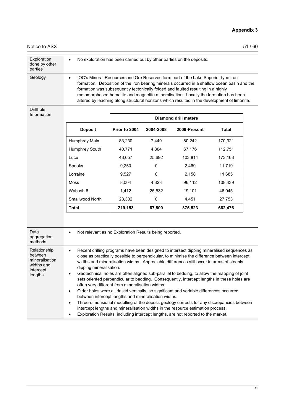 Appendix 3 Notice to ASX 51 / 60 51 Exploration done by other parties • No exploration has been carried out by other parties on the deposits. Geology • IOC’s Mineral Resources and Ore Reserves form part of the Lake Superior type iron formation. Deposition of the iron bearing minerals occurred in a shallow ocean basin and the formation was subsequently tectonically folded and faulted resulting in a highly metamorphosed hematite and magnetite mineralisation. Locally the formation has been altered by leaching along structural horizons which resulted in the development of limonite. Drillhole Information Diamond drill meters Deposit Prior to 2004 2004-2008 2009-Present Total Humphrey Main 83,230 7,449 80,242 170,921 Humphrey South 40,771 4,804 67,176 112,751 Luce 43,657 25,692 103,814 173,163 Spooks 9,250 0 2,469 11,719 Lorraine 9,527 0 2,158 11,685 Moss 8,004 4,323 96,112 108,439 Wabush 6 1,412 25,532 19,101 46,045 Smallwood North 23,302 0 4,451 27,753 Total 219,153 67,800 375,523 662,476 Data aggregation methods • Not relevant as no Exploration Results being reported. Relationship between mineralisation widths and intercept lengths • Recent drilling programs have been designed to intersect dipping mineralised sequences as close as practically possible to perpendicular, to minimise the difference between intercept widths and mineralisation widths. Appreciable differences still occur in areas of steeply dipping mineralisation. • Geotechnical holes are often aligned sub-parallel to bedding, to allow the mapping of joint sets oriented perpendicular to bedding. Consequently, intercept lengths in these holes are often very different from mineralisation widths. • Older holes were all drilled vertically, so significant and variable differences occurred between intercept lengths and mineralisation widths. • Three-dimensional modelling of the deposit geology corrects for any discrepancies between intercept lengths and mineralisation widths in the resource estimation process. • Exploration Results, including intercept lengths, are not reported to the market.