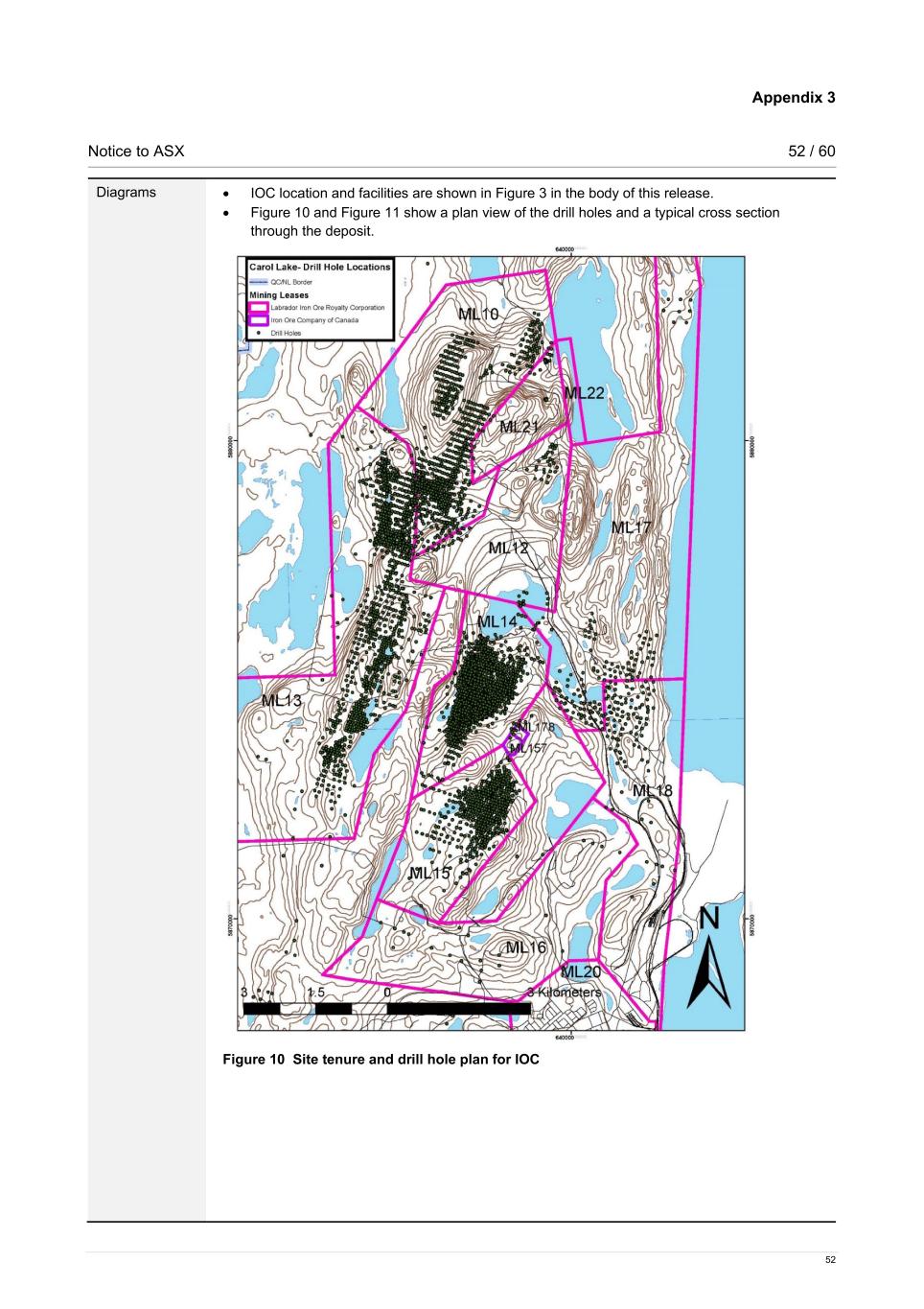 Appendix 3 Notice to ASX 52 / 60 52 Diagrams • IOC location and facilities are shown in Figure 3 in the body of this release. • Figure 10 and Figure 11 show a plan view of the drill holes and a typical cross section through the deposit. Figure 10 Site tenure and drill hole plan for IOC