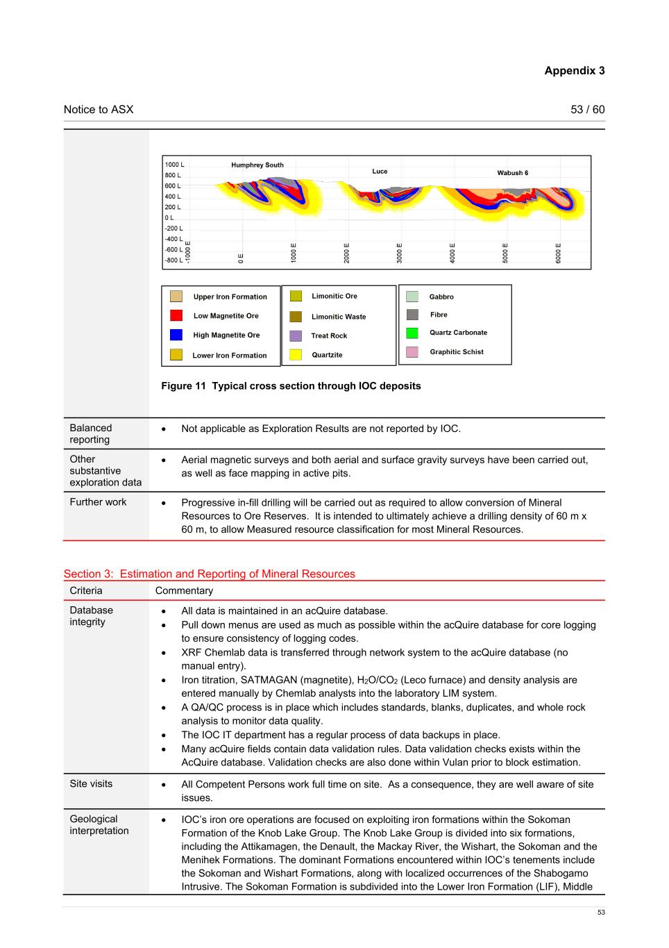 Appendix 3 Notice to ASX 53 / 60 53 Figure 11 Typical cross section through IOC deposits Balanced reporting • Not applicable as Exploration Results are not reported by IOC. Other substantive exploration data • Aerial magnetic surveys and both aerial and surface gravity surveys have been carried out, as well as face mapping in active pits. Further work • Progressive in-fill drilling will be carried out as required to allow conversion of Mineral Resources to Ore Reserves. It is intended to ultimately achieve a drilling density of 60 m x 60 m, to allow Measured resource classification for most Mineral Resources. Section 3: Estimation and Reporting of Mineral Resources Criteria Commentary Database integrity • All data is maintained in an acQuire database. • Pull down menus are used as much as possible within the acQuire database for core logging to ensure consistency of logging codes. • XRF Chemlab data is transferred through network system to the acQuire database (no manual entry). • Iron titration, SATMAGAN (magnetite), H2O/CO2 (Leco furnace) and density analysis are entered manually by Chemlab analysts into the laboratory LIM system. • A QA/QC process is in place which includes standards, blanks, duplicates, and whole rock analysis to monitor data quality. • The IOC IT department has a regular process of data backups in place. • Many acQuire fields contain data validation rules. Data validation checks exists within the AcQuire database. Validation checks are also done within Vulan prior to block estimation. Site visits • All Competent Persons work full time on site. As a consequence, they are well aware of site issues. Geological interpretation • IOC’s iron ore operations are focused on exploiting iron formations within the Sokoman Formation of the Knob Lake Group. The Knob Lake Group is divided into six formations, including the Attikamagen, the Denault, the Mackay River, the Wishart, the Sokoman and the Menihek Formations. The dominant Formations encountered within IOC’s tenements include the Sokoman and Wishart Formations, along with localized occurrences of the Shabogamo Intrusive. The Sokoman Formation is subdivided into the Lower Iron Formation (LIF), Middle