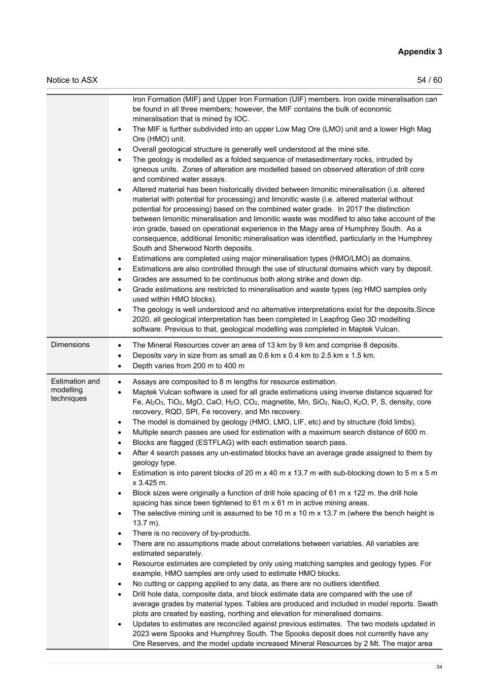 Appendix 3 Notice to ASX 54 / 60 54 Iron Formation (MIF) and Upper Iron Formation (UIF) members. Iron oxide mineralisation can be found in all three members; however, the MIF contains the bulk of economic mineralisation that is mined by IOC. • The MIF is further subdivided into an upper Low Mag Ore (LMO) unit and a lower High Mag Ore (HMO) unit. • Overall geological structure is generally well understood at the mine site. • The geology is modelled as a folded sequence of metasedimentary rocks, intruded by igneous units. Zones of alteration are modelled based on observed alteration of drill core and combined water assays. • Altered material has been historically divided between limonitic mineralisation (i.e. altered material with potential for processing) and limonitic waste (i.e. altered material without potential for processing) based on the combined water grade. In 2017 the distinction between limonitic mineralisation and limonitic waste was modified to also take account of the iron grade, based on operational experience in the Magy area of Humphrey South. As a consequence, additional limonitic mineralisation was identified, particularly in the Humphrey South and Sherwood North deposits. • Estimations are completed using major mineralisation types (HMO/LMO) as domains. • Estimations are also controlled through the use of structural domains which vary by deposit. • Grades are assumed to be continuous both along strike and down dip. • Grade estimations are restricted to mineralisation and waste types (eg HMO samples only used within HMO blocks). • The geology is well understood and no alternative interpretations exist for the deposits.Since 2020, all geological interpretation has been completed in Leapfrog Geo 3D modelling software. Previous to that, geological modelling was completed in Maptek Vulcan. Dimensions • The Mineral Resources cover an area of 13 km by 9 km and comprise 8 deposits. • Deposits vary in size from as small as 0.6 km x 0.4 km to 2.5 km x 1.5 km. • Depth varies from 200 m to 400 m Estimation and modelling techniques • Assays are composited to 8 m lengths for resource estimation. • Maptek Vulcan software is used for all grade estimations using inverse distance squared for Fe, Al2O3, TiO2, MgO, CaO, H2O, CO2, magnetite, Mn, SiO2, Na2O, K2O, P, S, density, core recovery, RQD, SPI, Fe recovery, and Mn recovery. • The model is domained by geology (HMO, LMO, LIF, etc) and by structure (fold limbs). • Multiple search passes are used for estimation with a maximum search distance of 600 m. • Blocks are flagged (ESTFLAG) with each estimation search pass. • After 4 search passes any un-estimated blocks have an average grade assigned to them by geology type. • Estimation is into parent blocks of 20 m x 40 m x 13.7 m with sub-blocking down to 5 m x 5 m x 3.425 m. • Block sizes were originally a function of drill hole spacing of 61 m x 122 m. the drill hole spacing has since been tightened to 61 m x 61 m in active mining areas. • The selective mining unit is assumed to be 10 m x 10 m x 13.7 m (where the bench height is 13.7 m). • There is no recovery of by-products. • There are no assumptions made about correlations between variables. All variables are estimated separately. • Resource estimates are completed by only using matching samples and geology types. For example, HMO samples are only used to estimate HMO blocks. • No cutting or capping applied to any data, as there are no outliers identified. • Drill hole data, composite data, and block estimate data are compared with the use of average grades by material types. Tables are produced and included in model reports. Swath plots are created by easting, northing and elevation for mineralised domains. • Updates to estimates are reconciled against previous estimates. The two models updated in 2023 were Spooks and Humphrey South. The Spooks deposit does not currently have any Ore Reserves, and the model update increased Mineral Resources by 2 Mt. The major area
