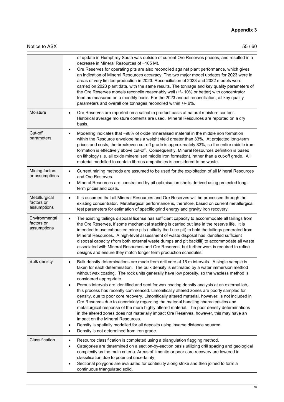 Appendix 3 Notice to ASX 55 / 60 55 of update in Humphrey South was outside of current Ore Reserves phases, and resulted in a decrease in Mineral Resources of ~105 Mt. • Ore Reserves for operating pits are also reconciled against plant performance, which gives an indication of Mineral Resources accuracy. The two major model updates for 2023 were in areas of very limited production in 2023. Reconciliation of 2023 and 2022 models were carried on 2023 plant data, with the same results. The tonnage and key quality parameters of the Ore Reserves models reconcile reasonably well (+\- 10% or better) with concentrator feed as measured on a monthly basis. For the 2023 annual reconciliation, all key quality parameters and overall ore tonnages reconciled within +/- 6%. Moisture • Ore Reserves are reported on a saleable product basis at natural moisture content. Historical average moisture contents are used. Mineral Resources are reported on a dry basis. Cut-off parameters • Modelling indicates that ~98% of oxide mineralised material in the middle iron formation within the Resource envelope has a weight yield greater than 33%. At projected long-term prices and costs, the breakeven cut-off grade is approximately 33%, so the entire middle iron formation is effectively above cut-off. Consequently, Mineral Resources definition is based on lithology (i.e. all oxide mineralised middle iron formation), rather than a cut-off grade. All material modelled to contain fibrous amphiboles is considered to be waste. Mining factors or assumptions • Current mining methods are assumed to be used for the exploitation of all Mineral Resources and Ore Reserves. • Mineral Resources are constrained by pit optimisation shells derived using projected long- term prices and costs. Metallurgical factors or assumptions • It is assumed that all Mineral Resources and Ore Reserves will be processed through the existing concentrator. Metallurgical performance is, therefore, based on current metallurgical test parameters for estimation of specific grind energy and gravity iron recovery. Environmental factors or assumptions • The existing tailings disposal license has sufficient capacity to accommodate all tailings from the Ore Reserves, if some mechanical stacking is carried out late in the reserve life. It is intended to use exhausted mine pits (initially the Luce pit) to hold the tailings generated from Mineral Resources. A high-level assessment of waste disposal has identified sufficient disposal capacity (from both external waste dumps and pit backfill) to accommodate all waste associated with Mineral Resources and Ore Reserves, but further work is required to refine designs and ensure they match longer term production schedules. Bulk density • Bulk density determinations are made from drill core at 16 m intervals. A single sample is taken for each determination. The bulk density is estimated by a water immersion method without wax coating. The rock units generally have low porosity, so the waxless method is considered appropriate. • Porous intervals are identified and sent for wax coating density analysis at an external lab, this process has recently commenced. Limonitically altered zones are poorly sampled for density, due to poor core recovery. Limonitically altered material, however, is not included in Ore Reserves due to uncertainty regarding the material handling characteristics and metallurgical response of the more highly altered material. The poor density determinations in the altered zones does not materially impact Ore Reserves, however, this may have an impact on the Mineral Resources. • Density is spatially modelled for all deposits using inverse distance squared. • Density is not determined from iron grade. Classification • Resource classification is completed using a triangulation flagging method. • Categories are determined on a section-by-section basis utilizing drill spacing and geological complexity as the main criteria. Areas of limonite or poor core recovery are lowered in classification due to potential uncertainty. • Sectional polygons are evaluated for continuity along strike and then joined to form a continuous triangulated solid.