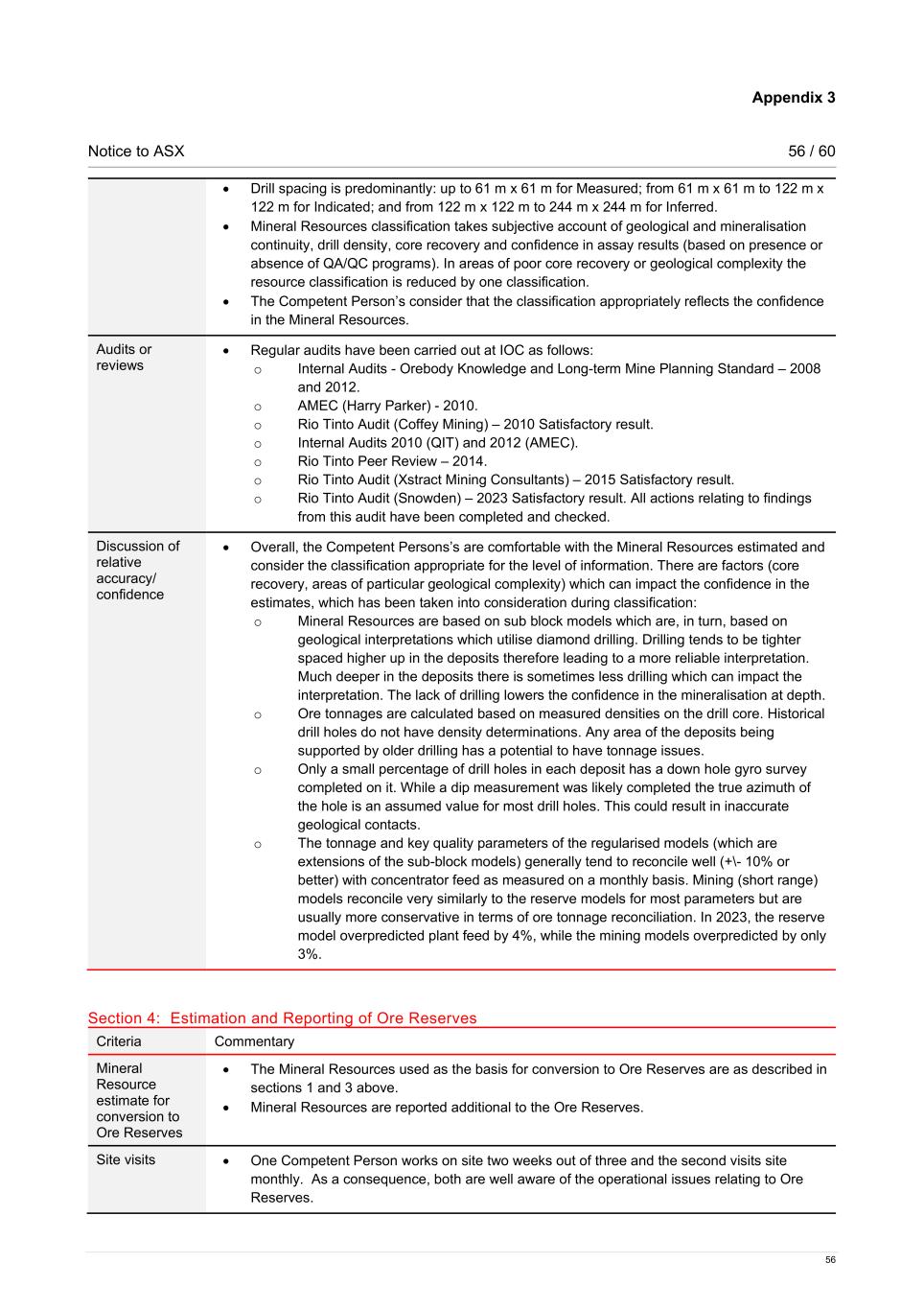 Appendix 3 Notice to ASX 56 / 60 56 • Drill spacing is predominantly: up to 61 m x 61 m for Measured; from 61 m x 61 m to 122 m x 122 m for Indicated; and from 122 m x 122 m to 244 m x 244 m for Inferred. • Mineral Resources classification takes subjective account of geological and mineralisation continuity, drill density, core recovery and confidence in assay results (based on presence or absence of QA/QC programs). In areas of poor core recovery or geological complexity the resource classification is reduced by one classification. • The Competent Person’s consider that the classification appropriately reflects the confidence in the Mineral Resources. Audits or reviews • Regular audits have been carried out at IOC as follows: o Internal Audits - Orebody Knowledge and Long-term Mine Planning Standard – 2008 and 2012. o AMEC (Harry Parker) - 2010. o Rio Tinto Audit (Coffey Mining) – 2010 Satisfactory result. o Internal Audits 2010 (QIT) and 2012 (AMEC). o Rio Tinto Peer Review – 2014. o Rio Tinto Audit (Xstract Mining Consultants) – 2015 Satisfactory result. o Rio Tinto Audit (Snowden) – 2023 Satisfactory result. All actions relating to findings from this audit have been completed and checked. Discussion of relative accuracy/ confidence • Overall, the Competent Persons’s are comfortable with the Mineral Resources estimated and consider the classification appropriate for the level of information. There are factors (core recovery, areas of particular geological complexity) which can impact the confidence in the estimates, which has been taken into consideration during classification: o Mineral Resources are based on sub block models which are, in turn, based on geological interpretations which utilise diamond drilling. Drilling tends to be tighter spaced higher up in the deposits therefore leading to a more reliable interpretation. Much deeper in the deposits there is sometimes less drilling which can impact the interpretation. The lack of drilling lowers the confidence in the mineralisation at depth. o Ore tonnages are calculated based on measured densities on the drill core. Historical drill holes do not have density determinations. Any area of the deposits being supported by older drilling has a potential to have tonnage issues. o Only a small percentage of drill holes in each deposit has a down hole gyro survey completed on it. While a dip measurement was likely completed the true azimuth of the hole is an assumed value for most drill holes. This could result in inaccurate geological contacts. o The tonnage and key quality parameters of the regularised models (which are extensions of the sub-block models) generally tend to reconcile well (+\- 10% or better) with concentrator feed as measured on a monthly basis. Mining (short range) models reconcile very similarly to the reserve models for most parameters but are usually more conservative in terms of ore tonnage reconciliation. In 2023, the reserve model overpredicted plant feed by 4%, while the mining models overpredicted by only 3%. Section 4: Estimation and Reporting of Ore Reserves Criteria Commentary Mineral Resource estimate for conversion to Ore Reserves • The Mineral Resources used as the basis for conversion to Ore Reserves are as described in sections 1 and 3 above. • Mineral Resources are reported additional to the Ore Reserves. Site visits • One Competent Person works on site two weeks out of three and the second visits site monthly. As a consequence, both are well aware of the operational issues relating to Ore Reserves.