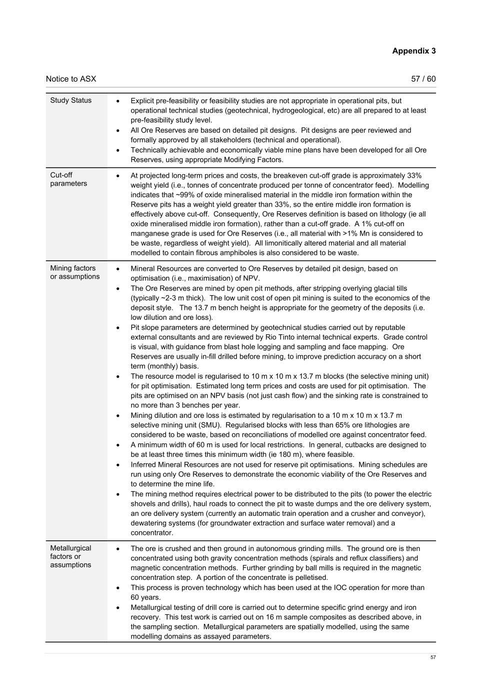 Appendix 3 Notice to ASX 57 / 60 57 Study Status • Explicit pre-feasibility or feasibility studies are not appropriate in operational pits, but operational technical studies (geotechnical, hydrogeological, etc) are all prepared to at least pre-feasibility study level. • All Ore Reserves are based on detailed pit designs. Pit designs are peer reviewed and formally approved by all stakeholders (technical and operational). • Technically achievable and economically viable mine plans have been developed for all Ore Reserves, using appropriate Modifying Factors. Cut-off parameters • At projected long-term prices and costs, the breakeven cut-off grade is approximately 33% weight yield (i.e., tonnes of concentrate produced per tonne of concentrator feed). Modelling indicates that ~99% of oxide mineralised material in the middle iron formation within the Reserve pits has a weight yield greater than 33%, so the entire middle iron formation is effectively above cut-off. Consequently, Ore Reserves definition is based on lithology (ie all oxide mineralised middle iron formation), rather than a cut-off grade. A 1% cut-off on manganese grade is used for Ore Reserves (i.e., all material with >1% Mn is considered to be waste, regardless of weight yield). All limonitically altered material and all material modelled to contain fibrous amphiboles is also considered to be waste. Mining factors or assumptions • Mineral Resources are converted to Ore Reserves by detailed pit design, based on optimisation (i.e., maximisation) of NPV. • The Ore Reserves are mined by open pit methods, after stripping overlying glacial tills (typically ~2-3 m thick). The low unit cost of open pit mining is suited to the economics of the deposit style. The 13.7 m bench height is appropriate for the geometry of the deposits (i.e. low dilution and ore loss). • Pit slope parameters are determined by geotechnical studies carried out by reputable external consultants and are reviewed by Rio Tinto internal technical experts. Grade control is visual, with guidance from blast hole logging and sampling and face mapping. Ore Reserves are usually in-fill drilled before mining, to improve prediction accuracy on a short term (monthly) basis. • The resource model is regularised to 10 m x 10 m x 13.7 m blocks (the selective mining unit) for pit optimisation. Estimated long term prices and costs are used for pit optimisation. The pits are optimised on an NPV basis (not just cash flow) and the sinking rate is constrained to no more than 3 benches per year. • Mining dilution and ore loss is estimated by regularisation to a 10 m x 10 m x 13.7 m selective mining unit (SMU). Regularised blocks with less than 65% ore lithologies are considered to be waste, based on reconciliations of modelled ore against concentrator feed. • A minimum width of 60 m is used for local restrictions. In general, cutbacks are designed to be at least three times this minimum width (ie 180 m), where feasible. • Inferred Mineral Resources are not used for reserve pit optimisations. Mining schedules are run using only Ore Reserves to demonstrate the economic viability of the Ore Reserves and to determine the mine life. • The mining method requires electrical power to be distributed to the pits (to power the electric shovels and drills), haul roads to connect the pit to waste dumps and the ore delivery system, an ore delivery system (currently an automatic train operation and a crusher and conveyor), dewatering systems (for groundwater extraction and surface water removal) and a concentrator. Metallurgical factors or assumptions • The ore is crushed and then ground in autonomous grinding mills. The ground ore is then concentrated using both gravity concentration methods (spirals and reflux classifiers) and magnetic concentration methods. Further grinding by ball mills is required in the magnetic concentration step. A portion of the concentrate is pelletised. • This process is proven technology which has been used at the IOC operation for more than 60 years. • Metallurgical testing of drill core is carried out to determine specific grind energy and iron recovery. This test work is carried out on 16 m sample composites as described above, in the sampling section. Metallurgical parameters are spatially modelled, using the same modelling domains as assayed parameters.
