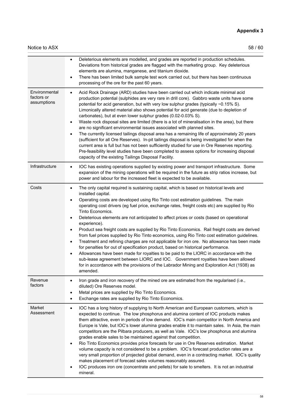 Appendix 3 Notice to ASX 58 / 60 58 • Deleterious elements are modelled, and grades are reported in production schedules. Deviations from historical grades are flagged with the marketing group. Key deleterious elements are alumina, manganese, and titanium dioxide. • There has been limited bulk sample test work carried out, but there has been continuous processing of the ore for the past 60 years. Environmental factors or assumptions • Acid Rock Drainage (ARD) studies have been carried out which indicate minimal acid production potential (sulphides are very rare in drill core). Gabbro waste units have some potential for acid generation, but with very low sulphur grades (typically ~0.15% S). Limonically altered material also shows potential for acid generate (due to depletion of carbonates), but at even lower sulphur grades (0.02-0.03% S). • Waste rock disposal sites are limited (there is a lot of mineralisation in the area), but there are no significant environmental issues associated with planned sites. • The currently licensed tailings disposal area has a remaining life of approximately 20 years (sufficient for all Ore Reserves). In-pit tailings disposal is being investigated for when the current area is full but has not been sufficiently studied for use in Ore Reserves reporting. Pre-feasibility level studies have been completed to assess options for increasing disposal capacity of the existing Tailings Disposal Facility. Infrastructure • IOC has existing operations supplied by existing power and transport infrastructure. Some expansion of the mining operations will be required in the future as strip ratios increase, but power and labour for the increased fleet is expected to be available. Costs • The only capital required is sustaining capital, which is based on historical levels and installed capital. • Operating costs are developed using Rio Tinto cost estimation guidelines. The main operating cost drivers (eg fuel price, exchange rates, freight costs etc) are supplied by Rio Tinto Economics. • Deleterious elements are not anticipated to affect prices or costs (based on operational experience). • Product sea freight costs are supplied by Rio Tinto Economics. Rail freight costs are derived from fuel prices supplied by Rio Tinto economics, using Rio Tinto cost estimation guidelines. • Treatment and refining charges are not applicable for iron ore. No allowance has been made for penalties for out of specification product, based on historical performance. • Allowances have been made for royalties to be paid to the LIORC in accordance with the sub-lease agreement between LIORC and IOC. Government royalties have been allowed for in accordance with the provisions of the Labrador Mining and Exploration Act (1938) as amended. Revenue factors • Iron grade and iron recovery of the mined ore are estimated from the regularised (i.e., diluted) Ore Reserves model. • Metal prices are supplied by Rio Tinto Economics. • Exchange rates are supplied by Rio Tinto Economics. Market Assessment • IOC has a long history of supplying to North American and European customers, which is expected to continue. The low phosphorus and alumina content of IOC products makes them attractive, even in periods of low demand. IOC’s main competitor in North America and Europe is Vale, but IOC’s lower alumina grades enable it to maintain sales. In Asia, the main competitors are the Pilbara producers, as well as Vale. IOC’s low phosphorus and alumina grades enable sales to be maintained against that competition. • Rio Tinto Economics provides price forecasts for use in Ore Reserves estimation. Market volume capacity is not considered to be a problem. IOC’s forecast production rates are a very small proportion of projected global demand, even in a contracting market. IOC’s quality makes placement of forecast sales volumes reasonably assured. • IOC produces iron ore (concentrate and pellets) for sale to smelters. It is not an industrial mineral.