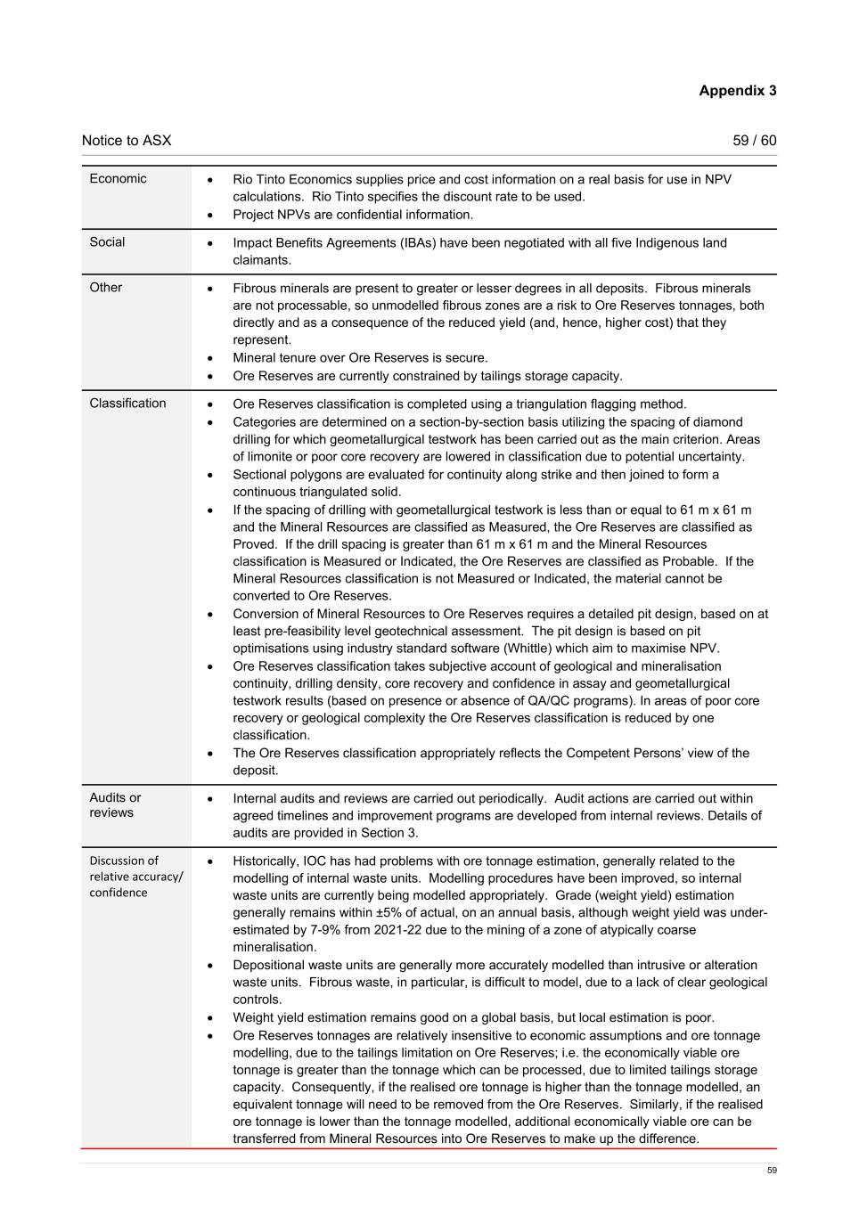 Appendix 3 Notice to ASX 59 / 60 59 Economic • Rio Tinto Economics supplies price and cost information on a real basis for use in NPV calculations. Rio Tinto specifies the discount rate to be used. • Project NPVs are confidential information. Social • Impact Benefits Agreements (IBAs) have been negotiated with all five Indigenous land claimants. Other • Fibrous minerals are present to greater or lesser degrees in all deposits. Fibrous minerals are not processable, so unmodelled fibrous zones are a risk to Ore Reserves tonnages, both directly and as a consequence of the reduced yield (and, hence, higher cost) that they represent. • Mineral tenure over Ore Reserves is secure. • Ore Reserves are currently constrained by tailings storage capacity. Classification • Ore Reserves classification is completed using a triangulation flagging method. • Categories are determined on a section-by-section basis utilizing the spacing of diamond drilling for which geometallurgical testwork has been carried out as the main criterion. Areas of limonite or poor core recovery are lowered in classification due to potential uncertainty. • Sectional polygons are evaluated for continuity along strike and then joined to form a continuous triangulated solid. • If the spacing of drilling with geometallurgical testwork is less than or equal to 61 m x 61 m and the Mineral Resources are classified as Measured, the Ore Reserves are classified as Proved. If the drill spacing is greater than 61 m x 61 m and the Mineral Resources classification is Measured or Indicated, the Ore Reserves are classified as Probable. If the Mineral Resources classification is not Measured or Indicated, the material cannot be converted to Ore Reserves. • Conversion of Mineral Resources to Ore Reserves requires a detailed pit design, based on at least pre-feasibility level geotechnical assessment. The pit design is based on pit optimisations using industry standard software (Whittle) which aim to maximise NPV. • Ore Reserves classification takes subjective account of geological and mineralisation continuity, drilling density, core recovery and confidence in assay and geometallurgical testwork results (based on presence or absence of QA/QC programs). In areas of poor core recovery or geological complexity the Ore Reserves classification is reduced by one classification. • The Ore Reserves classification appropriately reflects the Competent Persons’ view of the deposit. Audits or reviews • Internal audits and reviews are carried out periodically. Audit actions are carried out within agreed timelines and improvement programs are developed from internal reviews. Details of audits are provided in Section 3. Discussion of relative accuracy/ confidence • Historically, IOC has had problems with ore tonnage estimation, generally related to the modelling of internal waste units. Modelling procedures have been improved, so internal waste units are currently being modelled appropriately. Grade (weight yield) estimation generally remains within ±5% of actual, on an annual basis, although weight yield was under- estimated by 7-9% from 2021-22 due to the mining of a zone of atypically coarse mineralisation. • Depositional waste units are generally more accurately modelled than intrusive or alteration waste units. Fibrous waste, in particular, is difficult to model, due to a lack of clear geological controls. • Weight yield estimation remains good on a global basis, but local estimation is poor. • Ore Reserves tonnages are relatively insensitive to economic assumptions and ore tonnage modelling, due to the tailings limitation on Ore Reserves; i.e. the economically viable ore tonnage is greater than the tonnage which can be processed, due to limited tailings storage capacity. Consequently, if the realised ore tonnage is higher than the tonnage modelled, an equivalent tonnage will need to be removed from the Ore Reserves. Similarly, if the realised ore tonnage is lower than the tonnage modelled, additional economically viable ore can be transferred from Mineral Resources into Ore Reserves to make up the difference.