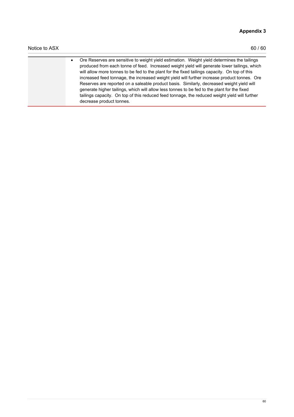 Appendix 3 Notice to ASX 60 / 60 60 • Ore Reserves are sensitive to weight yield estimation. Weight yield determines the tailings produced from each tonne of feed. Increased weight yield will generate lower tailings, which will allow more tonnes to be fed to the plant for the fixed tailings capacity. On top of this increased feed tonnage, the increased weight yield will further increase product tonnes. Ore Reserves are reported on a saleable product basis. Similarly, decreased weight yield will generate higher tailings, which will allow less tonnes to be fed to the plant for the fixed tailings capacity. On top of this reduced feed tonnage, the reduced weight yield will further decrease product tonnes.