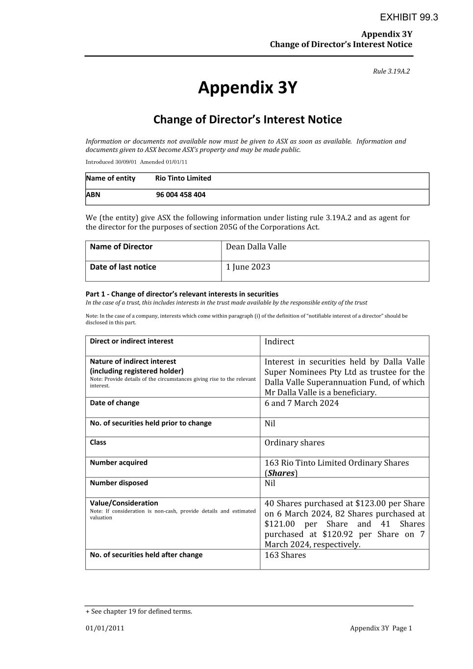 Appendix 3Y Change of Director’s Interest Notice + See chapter 19 for defined terms. 01/01/2011 Appendix 3Y Page 1 Rule 3.19A.2 Appendix 3Y Change of Director’s Interest Notice Information or documents not available now must be given to ASX as soon as available. Information and documents given to ASX become ASX’s property and may be made public. Introduced 30/09/01 Amended 01/01/11 Name of entity Rio Tinto Limited ABN 96 004 458 404 We (the entity) give ASX the following information under listing rule 3.19A.2 and as agent for the director for the purposes of section 205G of the Corporations Act. Name of Director Dean Dalla Valle Date of last notice 1 June 2023 Part 1 - Change of director’s relevant interests in securities In the case of a trust, this includes interests in the trust made available by the responsible entity of the trust Note: In the case of a company, interests which come within paragraph (i) of the definition of “notifiable interest of a director” should be disclosed in this part. Direct or indirect interest Indirect Nature of indirect interest (including registered holder) Note: Provide details of the circumstances giving rise to the relevant interest. Interest in securities held by Dalla Valle Super Nominees Pty Ltd as trustee for the Dalla Valle Superannuation Fund, of which Mr Dalla Valle is a beneficiary. Date of change 6 and 7 March 2024 No. of securities held prior to change Nil Class Ordinary shares Number acquired 163 Rio Tinto Limited Ordinary Shares (Shares) Number disposed Nil Value/Consideration Note: If consideration is non-cash, provide details and estimated valuation 40 Shares purchased at $123.00 per Share on 6 March 2024, 82 Shares purchased at $121.00 per Share and 41 Shares purchased at $120.92 per Share on 7 March 2024, respectively. No. of securities held after change 163 Shares EXHIBIT 99.3