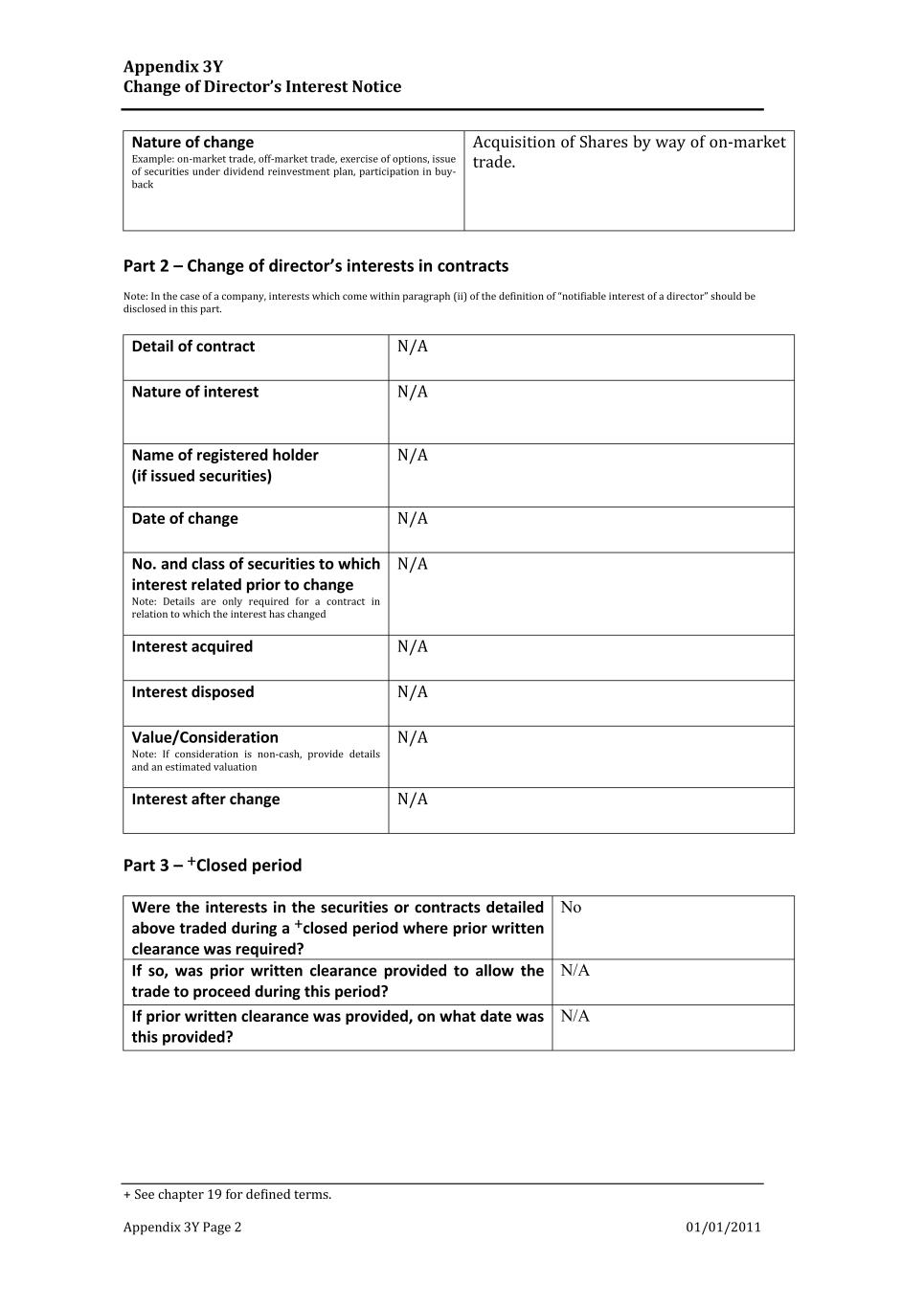 Appendix 3Y Change of Director’s Interest Notice + See chapter 19 for defined terms. Appendix 3Y Page 2 01/01/2011 Nature of change Example: on-market trade, off-market trade, exercise of options, issue of securities under dividend reinvestment plan, participation in buy- back Acquisition of Shares by way of on-market trade. Part 2 – Change of director’s interests in contracts Note: In the case of a company, interests which come within paragraph (ii) of the definition of “notifiable interest of a director” should be disclosed in this part. Detail of contract N/A Nature of interest N/A Name of registered holder (if issued securities) N/A Date of change N/A No. and class of securities to which interest related prior to change Note: Details are only required for a contract in relation to which the interest has changed N/A Interest acquired N/A Interest disposed N/A Value/Consideration Note: If consideration is non-cash, provide details and an estimated valuation N/A Interest after change N/A Part 3 – +Closed period Were the interests in the securities or contracts detailed above traded during a +closed period where prior written clearance was required? No If so, was prior written clearance provided to allow the trade to proceed during this period? N/A If prior written clearance was provided, on what date was this provided? N/A