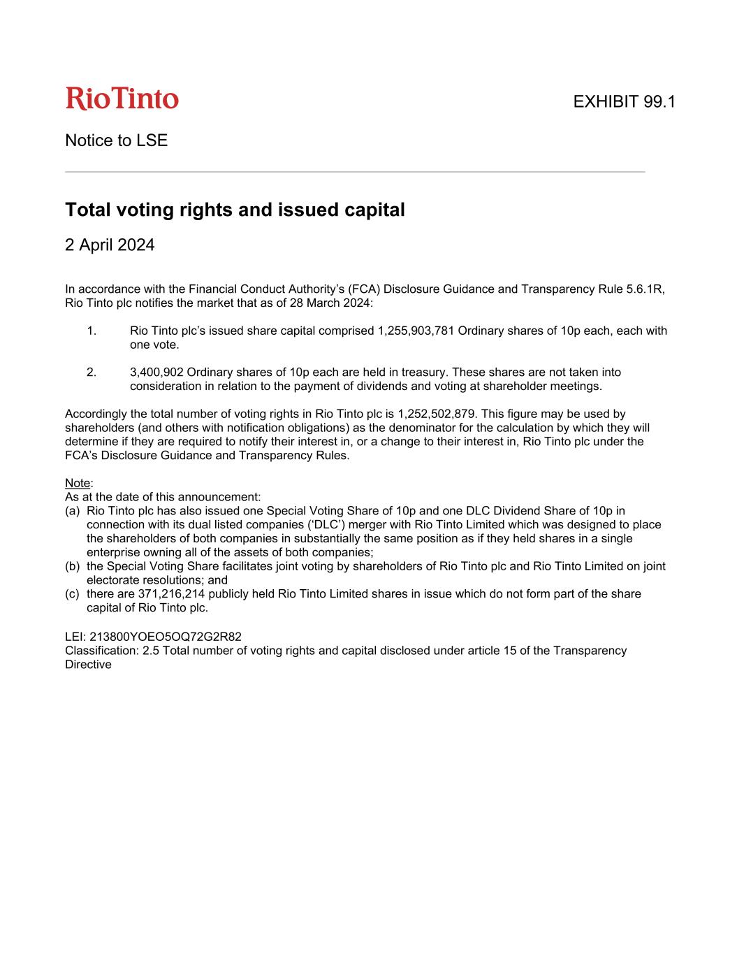 EXHIBIT 99.1 Notice to LSE Total voting rights and issued capital 2 April 2024 In accordance with the Financial Conduct Authority’s (FCA) Disclosure Guidance and Transparency Rule 5.6.1R, Rio Tinto plc notifies the market that as of 28 March 2024: 1. Rio Tinto plc’s issued share capital comprised 1,255,903,781 Ordinary shares of 10p each, each with one vote. 2. 3,400,902 Ordinary shares of 10p each are held in treasury. These shares are not taken into consideration in relation to the payment of dividends and voting at shareholder meetings. Accordingly the total number of voting rights in Rio Tinto plc is 1,252,502,879. This figure may be used by shareholders (and others with notification obligations) as the denominator for the calculation by which they will determine if they are required to notify their interest in, or a change to their interest in, Rio Tinto plc under the FCA’s Disclosure Guidance and Transparency Rules. Note: As at the date of this announcement: (a) Rio Tinto plc has also issued one Special Voting Share of 10p and one DLC Dividend Share of 10p in connection with its dual listed companies (‘DLC’) merger with Rio Tinto Limited which was designed to place the shareholders of both companies in substantially the same position as if they held shares in a single enterprise owning all of the assets of both companies; (b) the Special Voting Share facilitates joint voting by shareholders of Rio Tinto plc and Rio Tinto Limited on joint electorate resolutions; and (c) there are 371,216,214 publicly held Rio Tinto Limited shares in issue which do not form part of the share capital of Rio Tinto plc. LEI: 213800YOEO5OQ72G2R82 Classification: 2.5 Total number of voting rights and capital disclosed under article 15 of the Transparency Directive