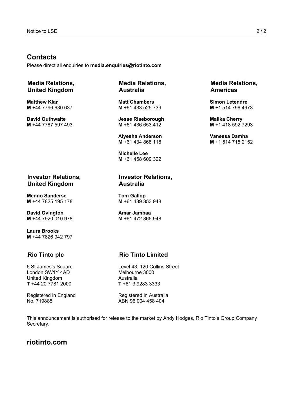 Notice to LSE 2 / 2 Contacts Please direct all enquiries to media.enquiries@riotinto.com 0BMedia Relations, 1BUnited Kingdom Matthew Klar M +44 7796 630 637 David Outhwaite M +44 7787 597 493 2BMedia Relations, 3BAustralia Matt Chambers M +61 433 525 739 Jesse Riseborough M +61 436 653 412 Alyesha Anderson M +61 434 868 118 Michelle Lee M +61 458 609 322 4BMedia Relations, 5BAmericas Simon Letendre M +1 514 796 4973 Malika Cherry M +1 418 592 7293 Vanessa Damha M +1 514 715 2152 6BInvestor Relations, 7BUnited Kingdom Menno Sanderse M +44 7825 195 178 David Ovington M +44 7920 010 978 Laura Brooks M +44 7826 942 797 8BInvestor Relations, 9BAustralia Tom Gallop M +61 439 353 948 Amar Jambaa M +61 472 865 948 10BRio Tinto plc 6 St James’s Square London SW1Y 4AD United Kingdom T +44 20 7781 2000 Registered in England No. 719885 11BRio Tinto Limited Level 43, 120 Collins Street Melbourne 3000 Australia T +61 3 9283 3333 Registered in Australia ABN 96 004 458 404 This announcement is authorised for release to the market by Andy Hodges, Rio Tinto’s Group Company Secretary. riotinto.com