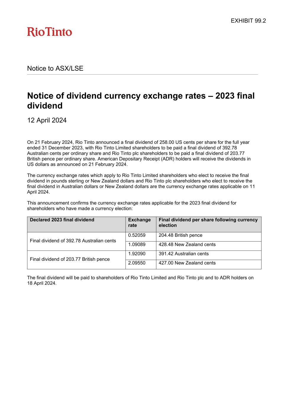 Notice to ASX/LSE Notice of dividend currency exchange rates – 2023 final dividend 12 April 2024 On 21 February 2024, Rio Tinto announced a final dividend of 258.00 US cents per share for the full year ended 31 December 2023, with Rio Tinto Limited shareholders to be paid a final dividend of 392.78 Australian cents per ordinary share and Rio Tinto plc shareholders to be paid a final dividend of 203.77 British pence per ordinary share. American Depositary Receipt (ADR) holders will receive the dividends in US dollars as announced on 21 February 2024. The currency exchange rates which apply to Rio Tinto Limited shareholders who elect to receive the final dividend in pounds sterling or New Zealand dollars and Rio Tinto plc shareholders who elect to receive the final dividend in Australian dollars or New Zealand dollars are the currency exchange rates applicable on 11 April 2024. This announcement confirms the currency exchange rates applicable for the 2023 final dividend for shareholders who have made a currency election: Declared 2023 final dividend Exchange rate Final dividend per share following currency election Final dividend of 392.78 Australian cents 0.52059 204.48 British pence 1.09089 428.48 New Zealand cents Final dividend of 203.77 British pence 1.92090 391.42 Australian cents 2.09550 427.00 New Zealand cents The final dividend will be paid to shareholders of Rio Tinto Limited and Rio Tinto plc and to ADR holders on 18 April 2024. EXHIBIT 99.2