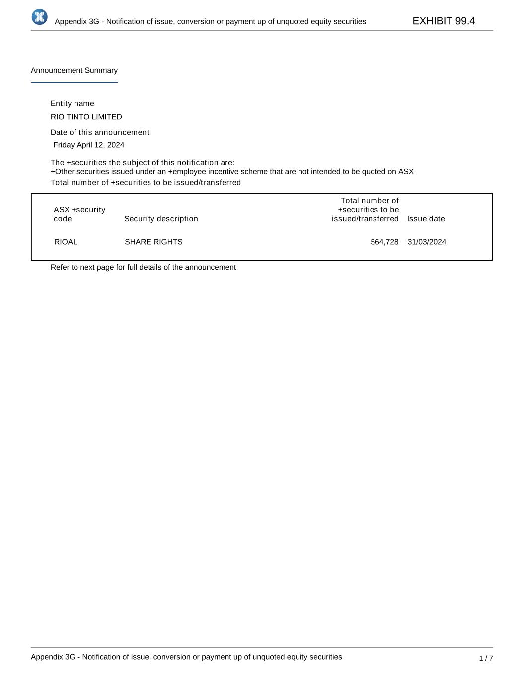 Appendix 3G - Notification of issue, conversion or payment up of unquoted equity securities Appendix 3G - Notification of issue, conversion or payment up of unquoted equity securities 1 / 7 Announcement Summary Entity name RIO TINTO LIMITED Date of this announcement Friday April 12, 2024 The +securities the subject of this notification are: Total number of +securities to be issued/transferred ASX +security code Security description Total number of +securities to be issued/transferred Issue date RIOAL SHARE RIGHTS 564,728 31/03/2024 Refer to next page for full details of the announcement +Other securities issued under an +employee incentive scheme that are not intended to be quoted on ASX EXHIBIT 99.4