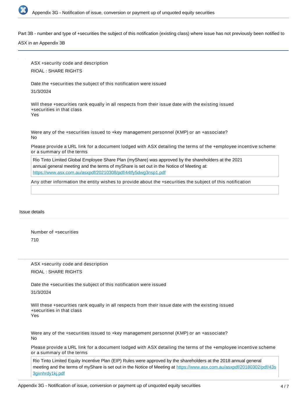 Appendix 3G - Notification of issue, conversion or payment up of unquoted equity securities Appendix 3G - Notification of issue, conversion or payment up of unquoted equity securities 4 / 7 Part 3B - number and type of +securities the subject of this notification (existing class) where issue has not previously been notified to ASX in an Appendix 3B ASX +security code and description RIOAL : SHARE RIGHTS Date the +securities the subject of this notification were issued 31/3/2024 Will these +securities rank equally in all respects from their issue date with the existing issued +securities in that class Were any of the +securities issued to +key management personnel (KMP) or an +associate? Please provide a URL link for a document lodged with ASX detailing the terms of the +employee incentive scheme or a summary of the terms Rio Tinto Limited Global Employee Share Plan (myShare) was approved by the shareholders at the 2021 annual general meeting and the terms of myShare is set out in the Notice of Meeting at: https://www.asx.com.au/asxpdf/20210308/pdf/44tfy5dwg3nsp1.pdf Any other information the entity wishes to provide about the +securities the subject of this notification Issue details Number of +securities 710 ASX +security code and description RIOAL : SHARE RIGHTS Date the +securities the subject of this notification were issued 31/3/2024 Will these +securities rank equally in all respects from their issue date with the existing issued +securities in that class Were any of the +securities issued to +key management personnel (KMP) or an +associate? Please provide a URL link for a document lodged with ASX detailing the terms of the +employee incentive scheme or a summary of the terms Rio Tinto Limited Equity Incentive Plan (EIP) Rules were approved by the shareholders at the 2018 annual general meeting and the terms of myShare is set out in the Notice of Meeting at https://www.asx.com.au/asxpdf/20180302/pdf/43s 3gxnhrdy1kj.pdf No Yes No Yes