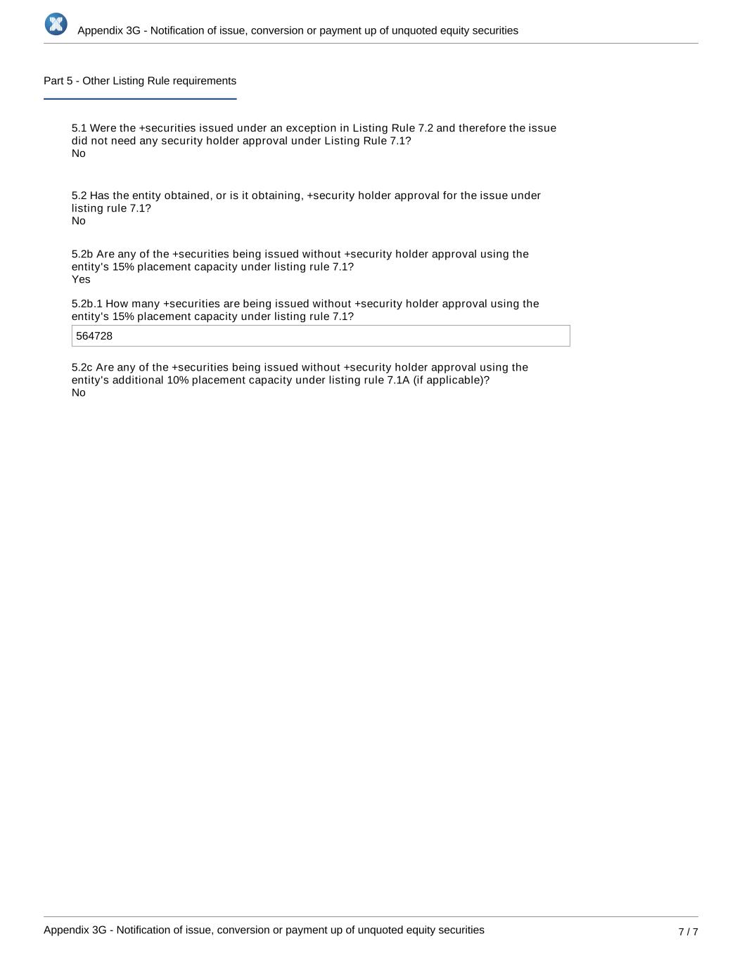 Appendix 3G - Notification of issue, conversion or payment up of unquoted equity securities Appendix 3G - Notification of issue, conversion or payment up of unquoted equity securities 7 / 7 Part 5 - Other Listing Rule requirements 5.1 Were the +securities issued under an exception in Listing Rule 7.2 and therefore the issue did not need any security holder approval under Listing Rule 7.1? 5.2 Has the entity obtained, or is it obtaining, +security holder approval for the issue under listing rule 7.1? 5.2b Are any of the +securities being issued without +security holder approval using the entity's 15% placement capacity under listing rule 7.1? 5.2b.1 How many +securities are being issued without +security holder approval using the entity's 15% placement capacity under listing rule 7.1? 564728 5.2c Are any of the +securities being issued without +security holder approval using the entity's additional 10% placement capacity under listing rule 7.1A (if applicable)? No Yes No No
