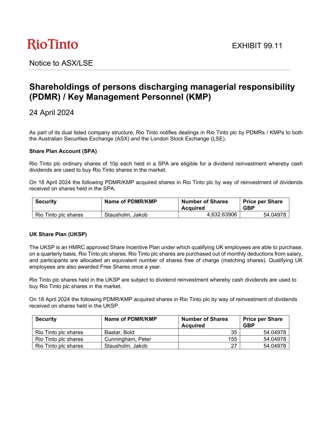 EXHIBIT 99.11 Notice to ASX/LSE Shareholdings of persons discharging managerial responsibility (PDMR) / Key Management Personnel (KMP) 24 April 2024 As part of its dual listed company structure, Rio Tinto notifies dealings in Rio Tinto plc by PDMRs / KMPs to both the Australian Securities Exchange (ASX) and the London Stock Exchange (LSE). Share Plan Account (SPA) Rio Tinto plc ordinary shares of 10p each held in a SPA are eligible for a dividend reinvestment whereby cash dividends are used to buy Rio Tinto shares in the market. On 18 April 2024 the following PDMR/KMP acquired shares in Rio Tinto plc by way of reinvestment of dividends received on shares held in the SPA. Security Name of PDMR/KMP Number of Shares Acquired Price per Share GBP Rio Tinto plc shares Stausholm, Jakob 4,632.63906 54.04978 UK Share Plan (UKSP) The UKSP is an HMRC approved Share Incentive Plan under which qualifying UK employees are able to purchase, on a quarterly basis, Rio Tinto plc shares. Rio Tinto plc shares are purchased out of monthly deductions from salary, and participants are allocated an equivalent number of shares free of charge (matching shares). Qualifying UK employees are also awarded Free Shares once a year. Rio Tinto plc shares held in the UKSP are subject to dividend reinvestment whereby cash dividends are used to buy Rio Tinto plc shares in the market. On 18 April 2024 the following PDMR/KMP acquired shares in Rio Tinto plc by way of reinvestment of dividends received on shares held in the UKSP. Security Name of PDMR/KMP Number of Shares Acquired Price per Share GBP Rio Tinto plc shares Baatar, Bold 35 54.04978 Rio Tinto plc shares Cunningham, Peter 155 54.04978 Rio Tinto plc shares Stausholm, Jakob 27 54.04978