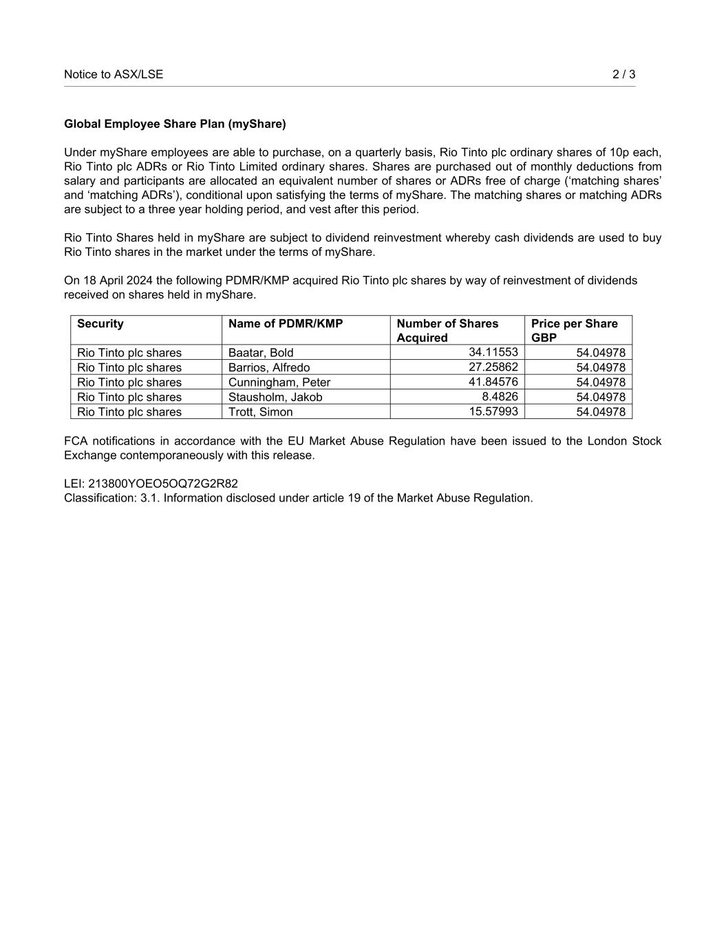 Notice to ASX/LSE 2 / 3 Global Employee Share Plan (myShare) Under myShare employees are able to purchase, on a quarterly basis, Rio Tinto plc ordinary shares of 10p each, Rio Tinto plc ADRs or Rio Tinto Limited ordinary shares. Shares are purchased out of monthly deductions from salary and participants are allocated an equivalent number of shares or ADRs free of charge (‘matching shares’ and ‘matching ADRs’), conditional upon satisfying the terms of myShare. The matching shares or matching ADRs are subject to a three year holding period, and vest after this period. Rio Tinto Shares held in myShare are subject to dividend reinvestment whereby cash dividends are used to buy Rio Tinto shares in the market under the terms of myShare. On 18 April 2024 the following PDMR/KMP acquired Rio Tinto plc shares by way of reinvestment of dividends received on shares held in myShare. Security Name of PDMR/KMP Number of Shares Acquired Price per Share GBP Rio Tinto plc shares Baatar, Bold 34.11553 54.04978 Rio Tinto plc shares Barrios, Alfredo 27.25862 54.04978 Rio Tinto plc shares Cunningham, Peter 41.84576 54.04978 Rio Tinto plc shares Stausholm, Jakob 8.4826 54.04978 Rio Tinto plc shares Trott, Simon 15.57993 54.04978 FCA notifications in accordance with the EU Market Abuse Regulation have been issued to the London Stock Exchange contemporaneously with this release. LEI: 213800YOEO5OQ72G2R82 Classification: 3.1. Information disclosed under article 19 of the Market Abuse Regulation.