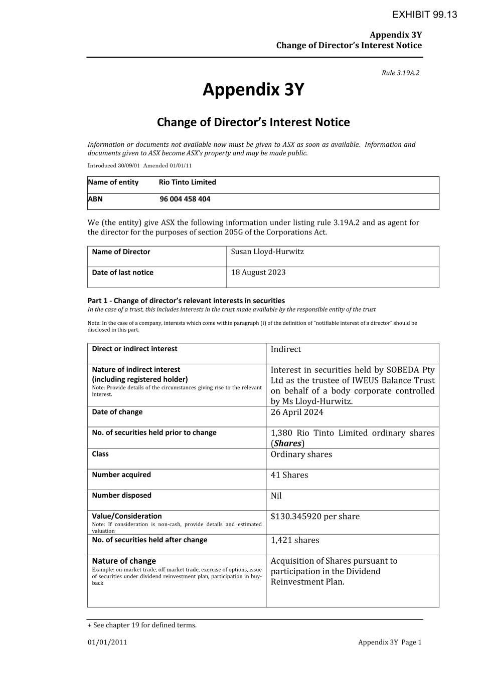 Appendix 3Y Change of Director’s Interest Notice + See chapter 19 for defined terms. 01/01/2011 Appendix 3Y Page 1 Rule 3.19A.2 Appendix 3Y Change of Director’s Interest Notice Information or documents not available now must be given to ASX as soon as available. Information and documents given to ASX become ASX’s property and may be made public. Introduced 30/09/01 Amended 01/01/11 Name of entity Rio Tinto Limited ABN 96 004 458 404 We (the entity) give ASX the following information under listing rule 3.19A.2 and as agent for the director for the purposes of section 205G of the Corporations Act. Name of Director Susan Lloyd-Hurwitz Date of last notice 18 August 2023 Part 1 - Change of director’s relevant interests in securities In the case of a trust, this includes interests in the trust made available by the responsible entity of the trust Note: In the case of a company, interests which come within paragraph (i) of the definition of “notifiable interest of a director” should be disclosed in this part. Direct or indirect interest Indirect Nature of indirect interest (including registered holder) Note: Provide details of the circumstances giving rise to the relevant interest. Interest in securities held by SOBEDA Pty Ltd as the trustee of IWEUS Balance Trust on behalf of a body corporate controlled by Ms Lloyd-Hurwitz. Date of change 26 April 2024 No. of securities held prior to change 1,380 Rio Tinto Limited ordinary shares (Shares) Class Ordinary shares Number acquired 41 Shares Number disposed Nil Value/Consideration Note: If consideration is non-cash, provide details and estimated valuation $130.345920 per share No. of securities held after change 1,421 shares Nature of change Example: on-market trade, off-market trade, exercise of options, issue of securities under dividend reinvestment plan, participation in buy- back Acquisition of Shares pursuant to participation in the Dividend Reinvestment Plan. EXHIBIT 99.13
