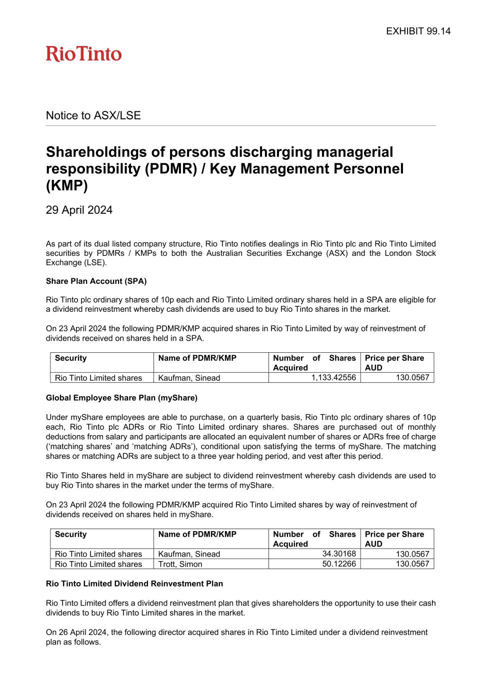 Notice to ASX/LSE Shareholdings of persons discharging managerial responsibility (PDMR) / Key Management Personnel (KMP) 29 April 2024 As part of its dual listed company structure, Rio Tinto notifies dealings in Rio Tinto plc and Rio Tinto Limited securities by PDMRs / KMPs to both the Australian Securities Exchange (ASX) and the London Stock Exchange (LSE). Share Plan Account (SPA) Rio Tinto plc ordinary shares of 10p each and Rio Tinto Limited ordinary shares held in a SPA are eligible for a dividend reinvestment whereby cash dividends are used to buy Rio Tinto shares in the market. On 23 April 2024 the following PDMR/KMP acquired shares in Rio Tinto Limited by way of reinvestment of dividends received on shares held in a SPA. Security Name of PDMR/KMP Number of Shares Acquired Price per Share AUD Rio Tinto Limited shares Kaufman, Sinead 1,133.42556 130.0567 Global Employee Share Plan (myShare) Under myShare employees are able to purchase, on a quarterly basis, Rio Tinto plc ordinary shares of 10p each, Rio Tinto plc ADRs or Rio Tinto Limited ordinary shares. Shares are purchased out of monthly deductions from salary and participants are allocated an equivalent number of shares or ADRs free of charge (‘matching shares’ and ‘matching ADRs’), conditional upon satisfying the terms of myShare. The matching shares or matching ADRs are subject to a three year holding period, and vest after this period. Rio Tinto Shares held in myShare are subject to dividend reinvestment whereby cash dividends are used to buy Rio Tinto shares in the market under the terms of myShare. On 23 April 2024 the following PDMR/KMP acquired Rio Tinto Limited shares by way of reinvestment of dividends received on shares held in myShare. Security Name of PDMR/KMP Number of Shares Acquired Price per Share AUD Rio Tinto Limited shares Kaufman, Sinead 34.30168 130.0567 Rio Tinto Limited shares Trott, Simon 50.12266 130.0567 Rio Tinto Limited Dividend Reinvestment Plan Rio Tinto Limited offers a dividend reinvestment plan that gives shareholders the opportunity to use their cash dividends to buy Rio Tinto Limited shares in the market. On 26 April 2024, the following director acquired shares in Rio Tinto Limited under a dividend reinvestment plan as follows. EXHIBIT 99.14