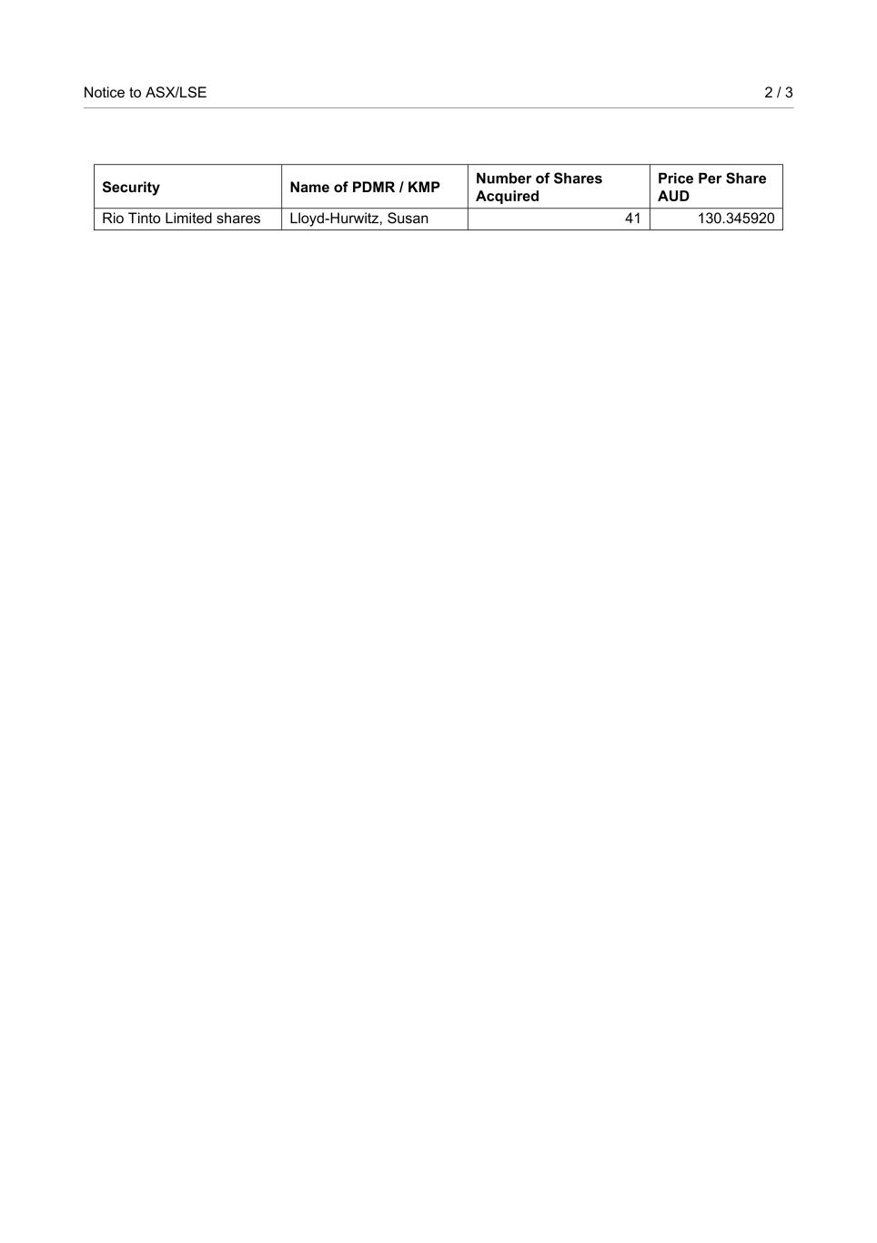 Notice to ASX/LSE 2 / 3 Security Name of PDMR / KMP Number of Shares Acquired Price Per Share AUD Rio Tinto Limited shares Lloyd-Hurwitz, Susan 41 130.345920