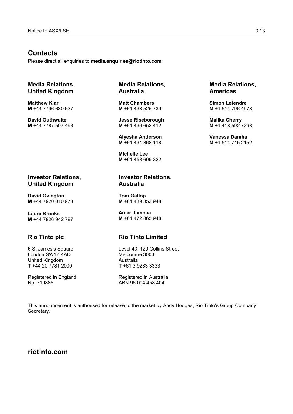 Notice to ASX/LSE 3 / 3 Contacts Please direct all enquiries to media.enquiries@riotinto.com Media Relations, United Kingdom Matthew Klar M +44 7796 630 637 David Outhwaite M +44 7787 597 493 Media Relations, Australia Matt Chambers M +61 433 525 739 Jesse Riseborough M +61 436 653 412 Alyesha Anderson M +61 434 868 118 Michelle Lee M +61 458 609 322 Media Relations, Americas Simon Letendre M +1 514 796 4973 Malika Cherry M +1 418 592 7293 Vanessa Damha M +1 514 715 2152 Investor Relations, United Kingdom David Ovington M +44 7920 010 978 Laura Brooks M +44 7826 942 797 Investor Relations, Australia Tom Gallop M +61 439 353 948 Amar Jambaa M +61 472 865 948 Rio Tinto plc 6 St James’s Square London SW1Y 4AD United Kingdom T +44 20 7781 2000 Registered in England No. 719885 Rio Tinto Limited Level 43, 120 Collins Street Melbourne 3000 Australia T +61 3 9283 3333 Registered in Australia ABN 96 004 458 404 This announcement is authorised for release to the market by Andy Hodges, Rio Tinto’s Group Company Secretary. riotinto.com