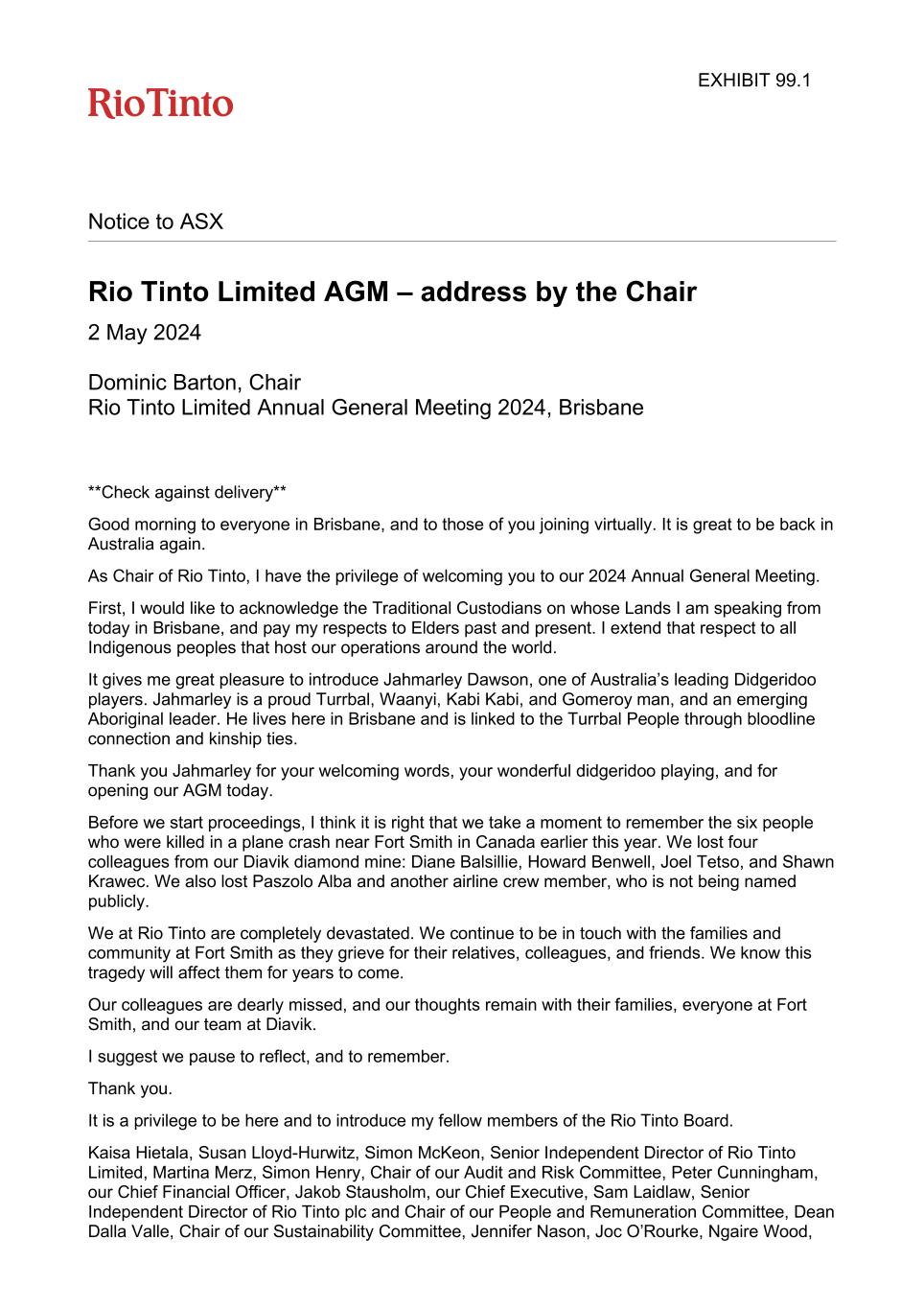 Notice to ASX Rio Tinto Limited AGM – address by the Chair 2 May 2024 Dominic Barton, Chair Rio Tinto Limited Annual General Meeting 2024, Brisbane **Check against delivery** Good morning to everyone in Brisbane, and to those of you joining virtually. It is great to be back in Australia again. As Chair of Rio Tinto, I have the privilege of welcoming you to our 2024 Annual General Meeting. First, I would like to acknowledge the Traditional Custodians on whose Lands I am speaking from today in Brisbane, and pay my respects to Elders past and present. I extend that respect to all Indigenous peoples that host our operations around the world. It gives me great pleasure to introduce Jahmarley Dawson, one of Australia’s leading Didgeridoo players. Jahmarley is a proud Turrbal, Waanyi, Kabi Kabi, and Gomeroy man, and an emerging Aboriginal leader. He lives here in Brisbane and is linked to the Turrbal People through bloodline connection and kinship ties. Thank you Jahmarley for your welcoming words, your wonderful didgeridoo playing, and for opening our AGM today. Before we start proceedings, I think it is right that we take a moment to remember the six people who were killed in a plane crash near Fort Smith in Canada earlier this year. We lost four colleagues from our Diavik diamond mine: Diane Balsillie, Howard Benwell, Joel Tetso, and Shawn Krawec. We also lost Paszolo Alba and another airline crew member, who is not being named publicly. We at Rio Tinto are completely devastated. We continue to be in touch with the families and community at Fort Smith as they grieve for their relatives, colleagues, and friends. We know this tragedy will affect them for years to come. Our colleagues are dearly missed, and our thoughts remain with their families, everyone at Fort Smith, and our team at Diavik. I suggest we pause to reflect, and to remember. Thank you. It is a privilege to be here and to introduce my fellow members of the Rio Tinto Board. Kaisa Hietala, Susan Lloyd-Hurwitz, Simon McKeon, Senior Independent Director of Rio Tinto Limited, Martina Merz, Simon Henry, Chair of our Audit and Risk Committee, Peter Cunningham, our Chief Financial Officer, Jakob Stausholm, our Chief Executive, Sam Laidlaw, Senior Independent Director of Rio Tinto plc and Chair of our People and Remuneration Committee, Dean Dalla Valle, Chair of our Sustainability Committee, Jennifer Nason, Joc O’Rourke, Ngaire Wood, EXHIBIT 99.1