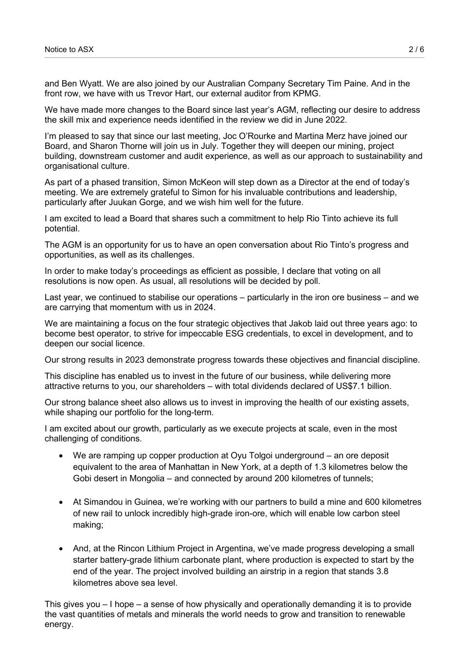 Notice to ASX 2 / 6 and Ben Wyatt. We are also joined by our Australian Company Secretary Tim Paine. And in the front row, we have with us Trevor Hart, our external auditor from KPMG. We have made more changes to the Board since last year’s AGM, reflecting our desire to address the skill mix and experience needs identified in the review we did in June 2022. I’m pleased to say that since our last meeting, Joc O’Rourke and Martina Merz have joined our Board, and Sharon Thorne will join us in July. Together they will deepen our mining, project building, downstream customer and audit experience, as well as our approach to sustainability and organisational culture. As part of a phased transition, Simon McKeon will step down as a Director at the end of today’s meeting. We are extremely grateful to Simon for his invaluable contributions and leadership, particularly after Juukan Gorge, and we wish him well for the future. I am excited to lead a Board that shares such a commitment to help Rio Tinto achieve its full potential. The AGM is an opportunity for us to have an open conversation about Rio Tinto’s progress and opportunities, as well as its challenges. In order to make today’s proceedings as efficient as possible, I declare that voting on all resolutions is now open. As usual, all resolutions will be decided by poll. Last year, we continued to stabilise our operations – particularly in the iron ore business – and we are carrying that momentum with us in 2024. We are maintaining a focus on the four strategic objectives that Jakob laid out three years ago: to become best operator, to strive for impeccable ESG credentials, to excel in development, and to deepen our social licence. Our strong results in 2023 demonstrate progress towards these objectives and financial discipline. This discipline has enabled us to invest in the future of our business, while delivering more attractive returns to you, our shareholders – with total dividends declared of US$7.1 billion. Our strong balance sheet also allows us to invest in improving the health of our existing assets, while shaping our portfolio for the long-term. I am excited about our growth, particularly as we execute projects at scale, even in the most challenging of conditions. • We are ramping up copper production at Oyu Tolgoi underground – an ore deposit equivalent to the area of Manhattan in New York, at a depth of 1.3 kilometres below the Gobi desert in Mongolia – and connected by around 200 kilometres of tunnels; • At Simandou in Guinea, we’re working with our partners to build a mine and 600 kilometres of new rail to unlock incredibly high-grade iron-ore, which will enable low carbon steel making; • And, at the Rincon Lithium Project in Argentina, we’ve made progress developing a small starter battery-grade lithium carbonate plant, where production is expected to start by the end of the year. The project involved building an airstrip in a region that stands 3.8 kilometres above sea level. This gives you – I hope – a sense of how physically and operationally demanding it is to provide the vast quantities of metals and minerals the world needs to grow and transition to renewable energy.