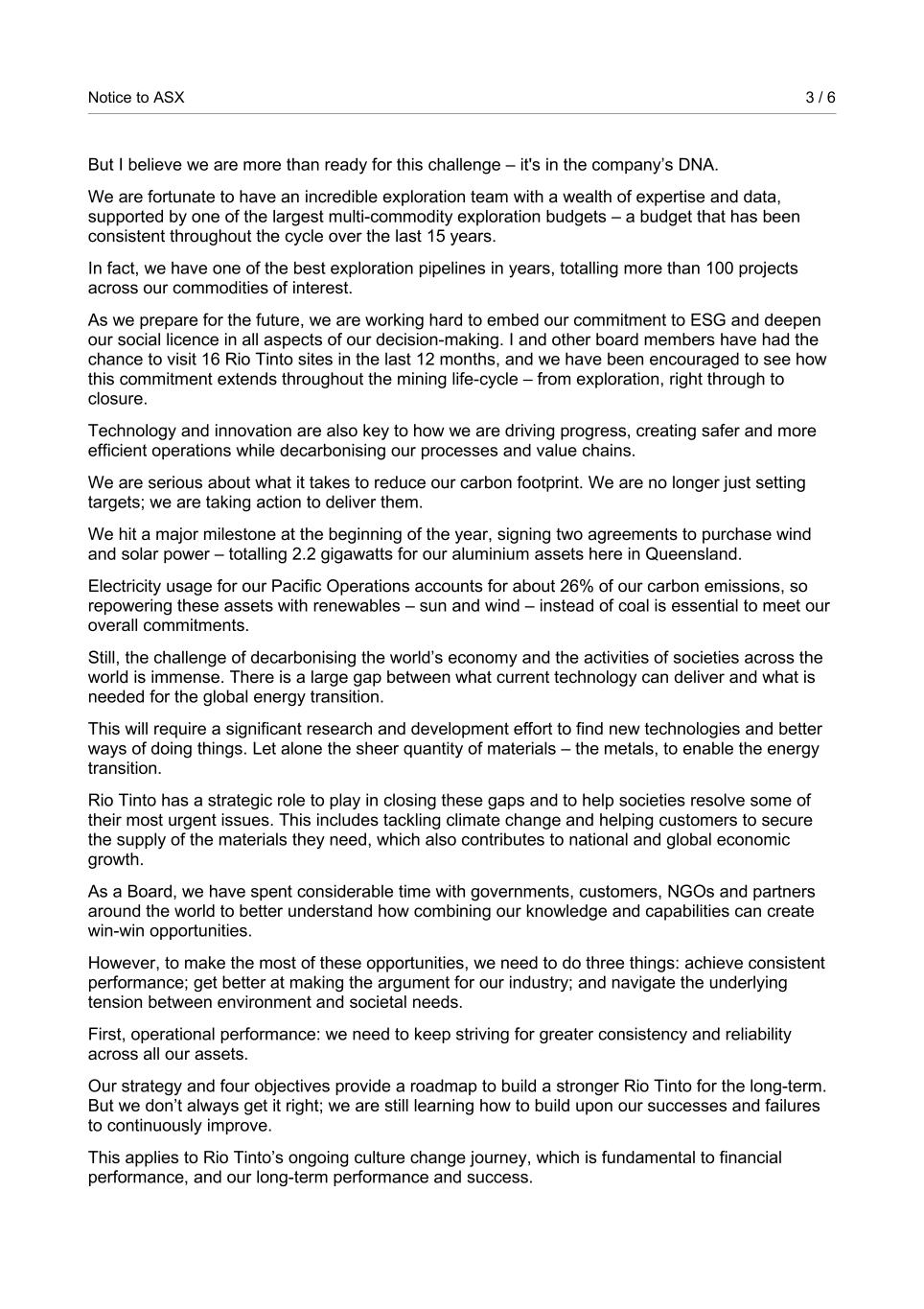 Notice to ASX 3 / 6 But I believe we are more than ready for this challenge – it's in the company’s DNA. We are fortunate to have an incredible exploration team with a wealth of expertise and data, supported by one of the largest multi-commodity exploration budgets – a budget that has been consistent throughout the cycle over the last 15 years. In fact, we have one of the best exploration pipelines in years, totalling more than 100 projects across our commodities of interest. As we prepare for the future, we are working hard to embed our commitment to ESG and deepen our social licence in all aspects of our decision-making. I and other board members have had the chance to visit 16 Rio Tinto sites in the last 12 months, and we have been encouraged to see how this commitment extends throughout the mining life-cycle – from exploration, right through to closure. Technology and innovation are also key to how we are driving progress, creating safer and more efficient operations while decarbonising our processes and value chains. We are serious about what it takes to reduce our carbon footprint. We are no longer just setting targets; we are taking action to deliver them. We hit a major milestone at the beginning of the year, signing two agreements to purchase wind and solar power – totalling 2.2 gigawatts for our aluminium assets here in Queensland. Electricity usage for our Pacific Operations accounts for about 26% of our carbon emissions, so repowering these assets with renewables – sun and wind – instead of coal is essential to meet our overall commitments. Still, the challenge of decarbonising the world’s economy and the activities of societies across the world is immense. There is a large gap between what current technology can deliver and what is needed for the global energy transition. This will require a significant research and development effort to find new technologies and better ways of doing things. Let alone the sheer quantity of materials – the metals, to enable the energy transition. Rio Tinto has a strategic role to play in closing these gaps and to help societies resolve some of their most urgent issues. This includes tackling climate change and helping customers to secure the supply of the materials they need, which also contributes to national and global economic growth. As a Board, we have spent considerable time with governments, customers, NGOs and partners around the world to better understand how combining our knowledge and capabilities can create win-win opportunities. However, to make the most of these opportunities, we need to do three things: achieve consistent performance; get better at making the argument for our industry; and navigate the underlying tension between environment and societal needs. First, operational performance: we need to keep striving for greater consistency and reliability across all our assets. Our strategy and four objectives provide a roadmap to build a stronger Rio Tinto for the long-term. But we don’t always get it right; we are still learning how to build upon our successes and failures to continuously improve. This applies to Rio Tinto’s ongoing culture change journey, which is fundamental to financial performance, and our long-term performance and success.