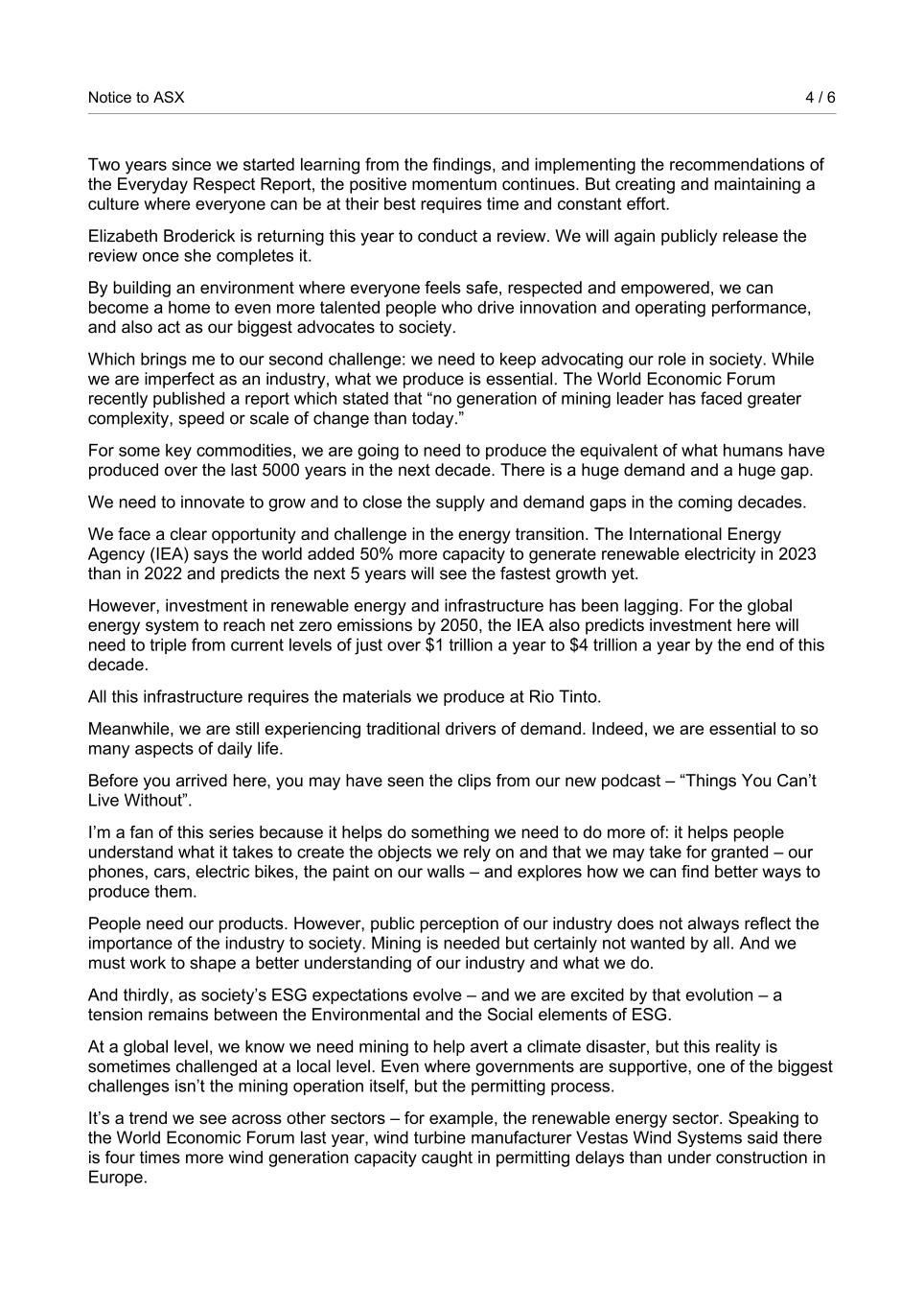 Notice to ASX 4 / 6 Two years since we started learning from the findings, and implementing the recommendations of the Everyday Respect Report, the positive momentum continues. But creating and maintaining a culture where everyone can be at their best requires time and constant effort. Elizabeth Broderick is returning this year to conduct a review. We will again publicly release the review once she completes it. By building an environment where everyone feels safe, respected and empowered, we can become a home to even more talented people who drive innovation and operating performance, and also act as our biggest advocates to society. Which brings me to our second challenge: we need to keep advocating our role in society. While we are imperfect as an industry, what we produce is essential. The World Economic Forum recently published a report which stated that “no generation of mining leader has faced greater complexity, speed or scale of change than today.” For some key commodities, we are going to need to produce the equivalent of what humans have produced over the last 5000 years in the next decade. There is a huge demand and a huge gap. We need to innovate to grow and to close the supply and demand gaps in the coming decades. We face a clear opportunity and challenge in the energy transition. The International Energy Agency (IEA) says the world added 50% more capacity to generate renewable electricity in 2023 than in 2022 and predicts the next 5 years will see the fastest growth yet. However, investment in renewable energy and infrastructure has been lagging. For the global energy system to reach net zero emissions by 2050, the IEA also predicts investment here will need to triple from current levels of just over $1 trillion a year to $4 trillion a year by the end of this decade. All this infrastructure requires the materials we produce at Rio Tinto. Meanwhile, we are still experiencing traditional drivers of demand. Indeed, we are essential to so many aspects of daily life. Before you arrived here, you may have seen the clips from our new podcast – “Things You Can’t Live Without”. I’m a fan of this series because it helps do something we need to do more of: it helps people understand what it takes to create the objects we rely on and that we may take for granted – our phones, cars, electric bikes, the paint on our walls – and explores how we can find better ways to produce them. People need our products. However, public perception of our industry does not always reflect the importance of the industry to society. Mining is needed but certainly not wanted by all. And we must work to shape a better understanding of our industry and what we do. And thirdly, as society’s ESG expectations evolve – and we are excited by that evolution – a tension remains between the Environmental and the Social elements of ESG. At a global level, we know we need mining to help avert a climate disaster, but this reality is sometimes challenged at a local level. Even where governments are supportive, one of the biggest challenges isn’t the mining operation itself, but the permitting process. It’s a trend we see across other sectors – for example, the renewable energy sector. Speaking to the World Economic Forum last year, wind turbine manufacturer Vestas Wind Systems said there is four times more wind generation capacity caught in permitting delays than under construction in Europe.